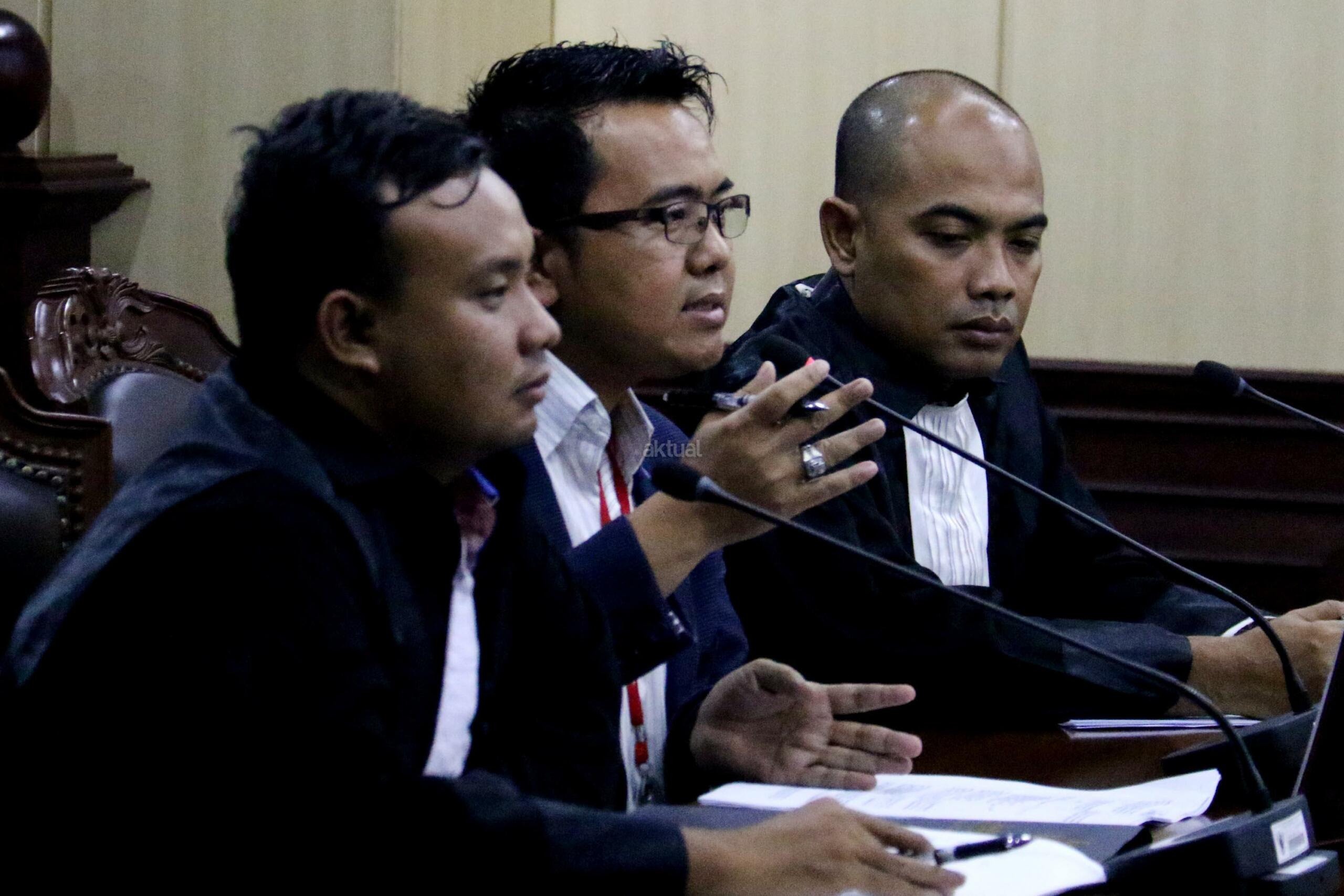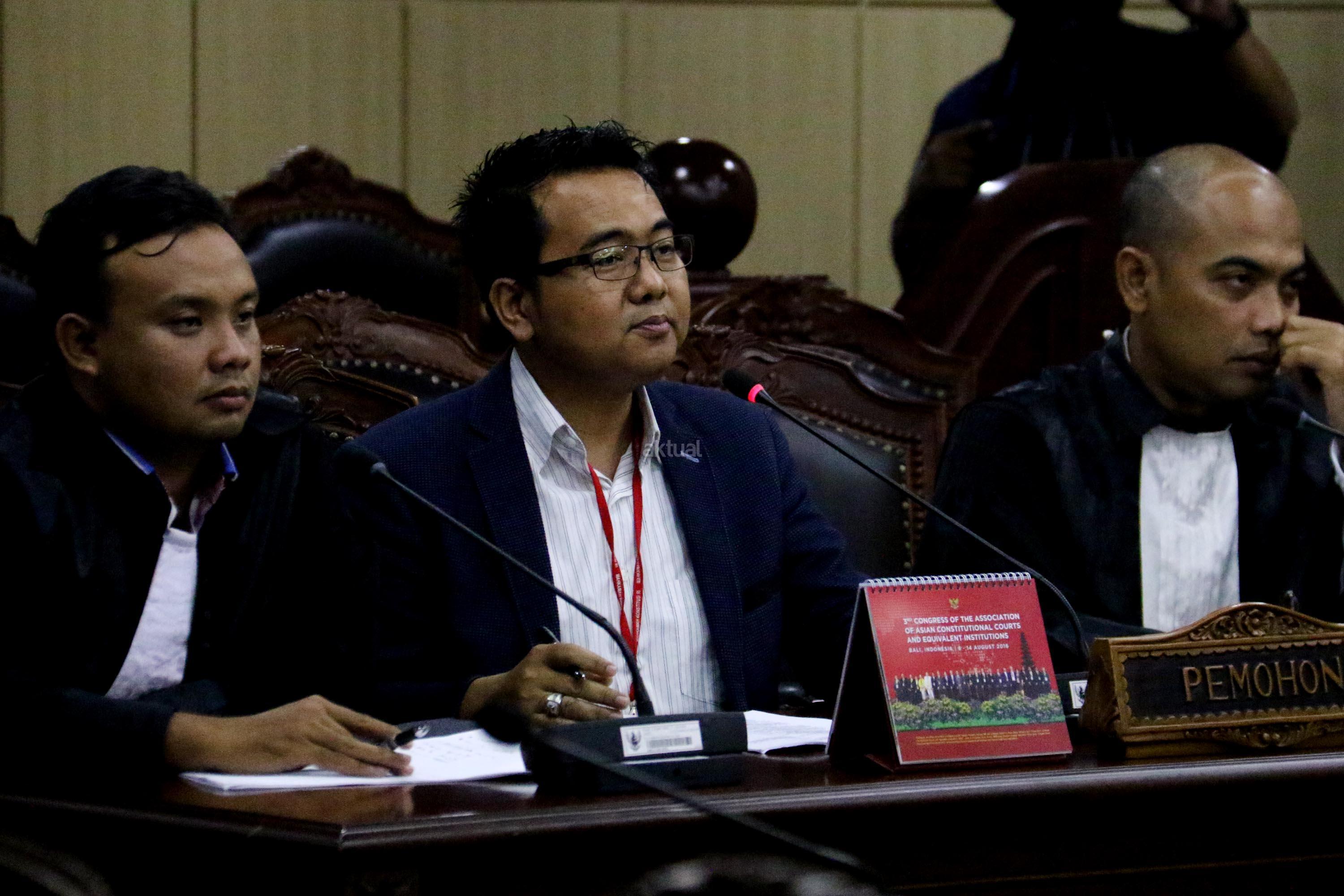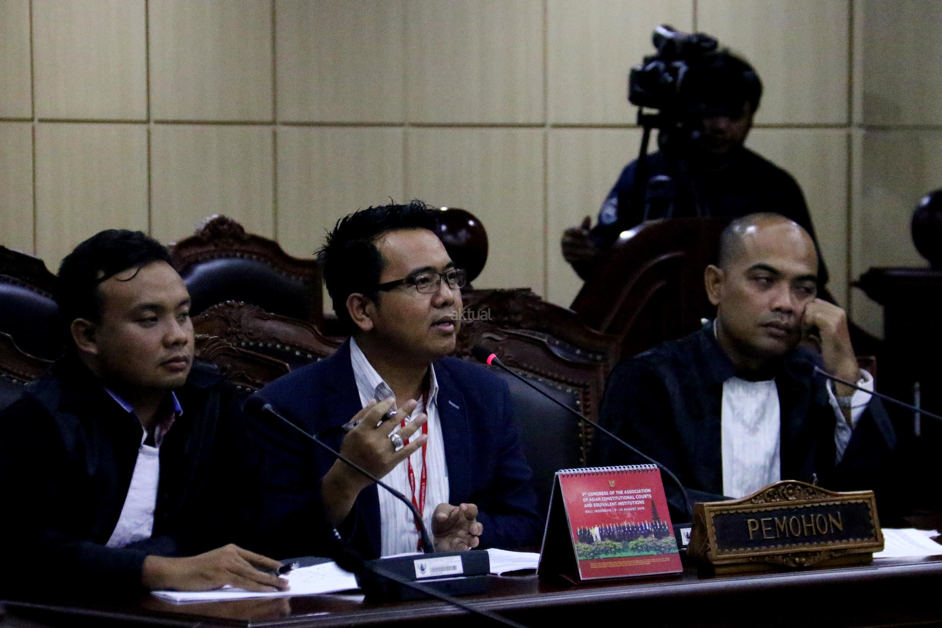 Pemohon Muhammad Soleh (tengah) saat memberikan padangan dalam sidang perdana uji materi Pengelolaan Keuangan Haji di pengadilan Mahkamah Konstitusi (MK), Jakarta, Rabu (23/8/2017). Dalam sidang perdana uji materi Pengelolaan Keuangan Haji oleh pemohon Muhammad Soleh merasa telah terjadi pelanggaran hak konstitusional yaitu telah berlaku sewenang-wenang karena memberi mandat kepada Badan Pengelola Keuangan Haji (BPKH) menggunakan dana setoran awal Biaya Penyelenggaraan Ibadah Haji (BPIH) milik Pemohon untuk berinvestasi, padahal pemohon tidak pernah memberikan mandat kepada pembuat UU terkait diperbolehkannya investasi. AKTUAL/Munzir