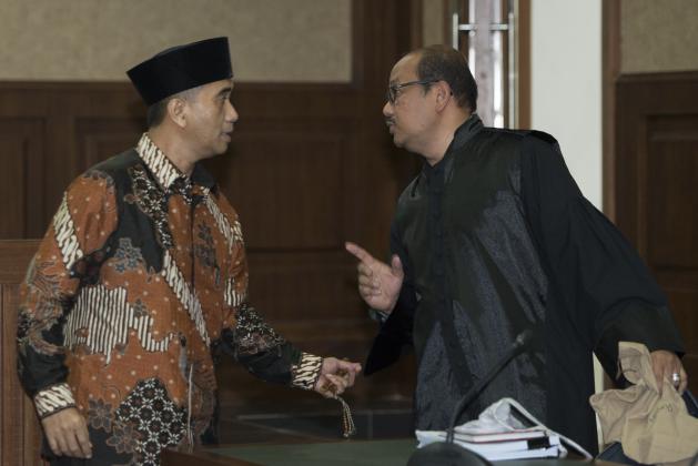 Terdakwa kasus dugaan korupsi dana tahun anggaran 2013-2014 dan dana tugas pembantuan Direktorat Pembinaan Pembangunan Kawasan Transmigrasi (P2KT) Kemenakertrans Jamaluddin Malik (kiri) berbincang dengan kuasa hukumnya usai menjalani sidang pledoi di Pengadilan Tipikor, Jakarta, Rabu (16/3). Dalam pledoi tersebut, kuasa hukum Jamaluddin menolak tuntutan yang diajukan jaksa penuntut umum. ANTARA FOTO/Rosa Panggabean/foc/16.