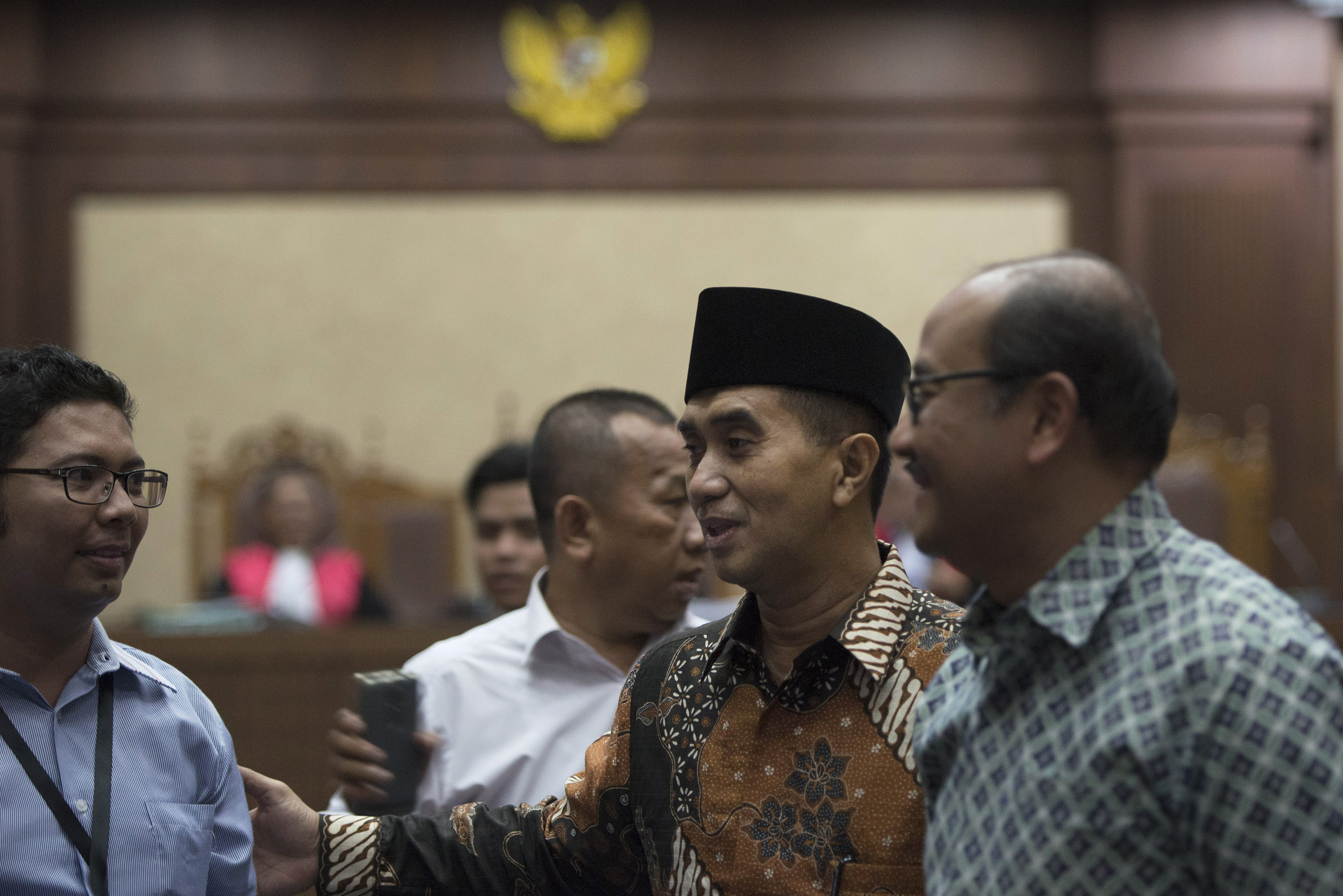 Terdakwa kasus dugaan korupsi dana tahun anggaran 2013-2014 dan dana tugas pembantuan Direktorat Pembinaan Pembangunan Kawasan Transmigrasi (P2KT) Kemenakertrans Jamaluddin Malik (kedua kanan) berbincang dengan sejumlah rekannya usai menjalani sidang pledoi di Pengadilan Tipikor, Jakarta, Rabu (16/3). Dalam pledoi tersebut, kuasa hukum Jamaluddin menolak tuntutan yang diajukan jaksa penuntut umum. ANTARA FOTO/Rosa Panggabean/foc/16.