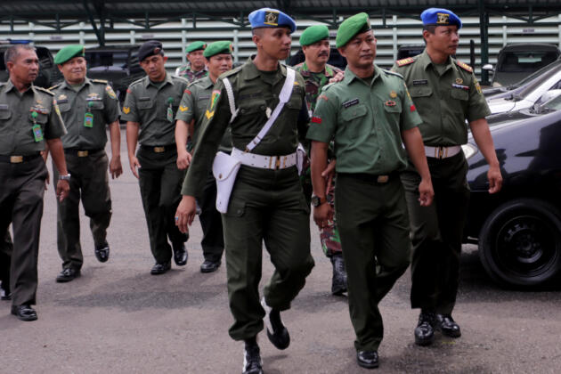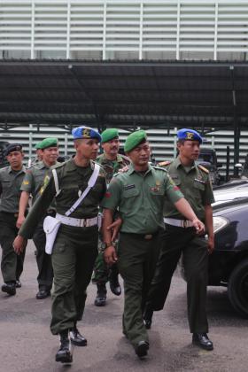 Praka Dirga Rahmad (dua kanan) dari Kesatuan Rindam II/Sriwijaya dibawa anggota Polisi Militer untuk menjalani Percepatan Sidang Khusus Kasus Narkotika oleh Oditurat Jenderal TNI Otmil I-04 di Palembang, Sumatera Selatan, Senin (11/4). Sebanyak 41 orang Prajurit TNI AD Kodam II/Sriwijaya dari Tamtama hingga Perwira akan menjalani percepatan sidang narkotika. ANTARA FOTO/Nova Wahyudi/pd/16