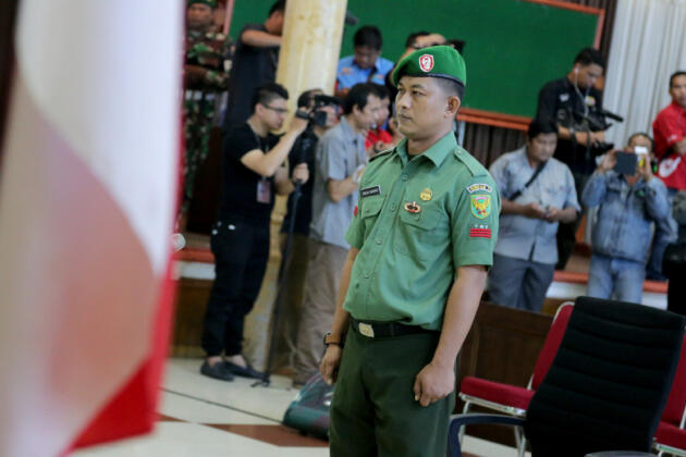 Praka Dirga Rahmad (tengah) dari Kesatuan Rindam II/Sriwijaya menjalani Percepatan Sidang Khusus Kasus Narkotika oleh Oditurat Jenderal TNI Otmil I-04 di Palembang, Sumatera Selatan, Senin (11/4). Sebanyak 41 orang Prajurit TNI AD Kodam II/Sriwijaya dari Tamtama hingga Perwira akan menjalani percepatan sidang narkotika. ANTARA FOTO/Nova Wahyudi/pd/16