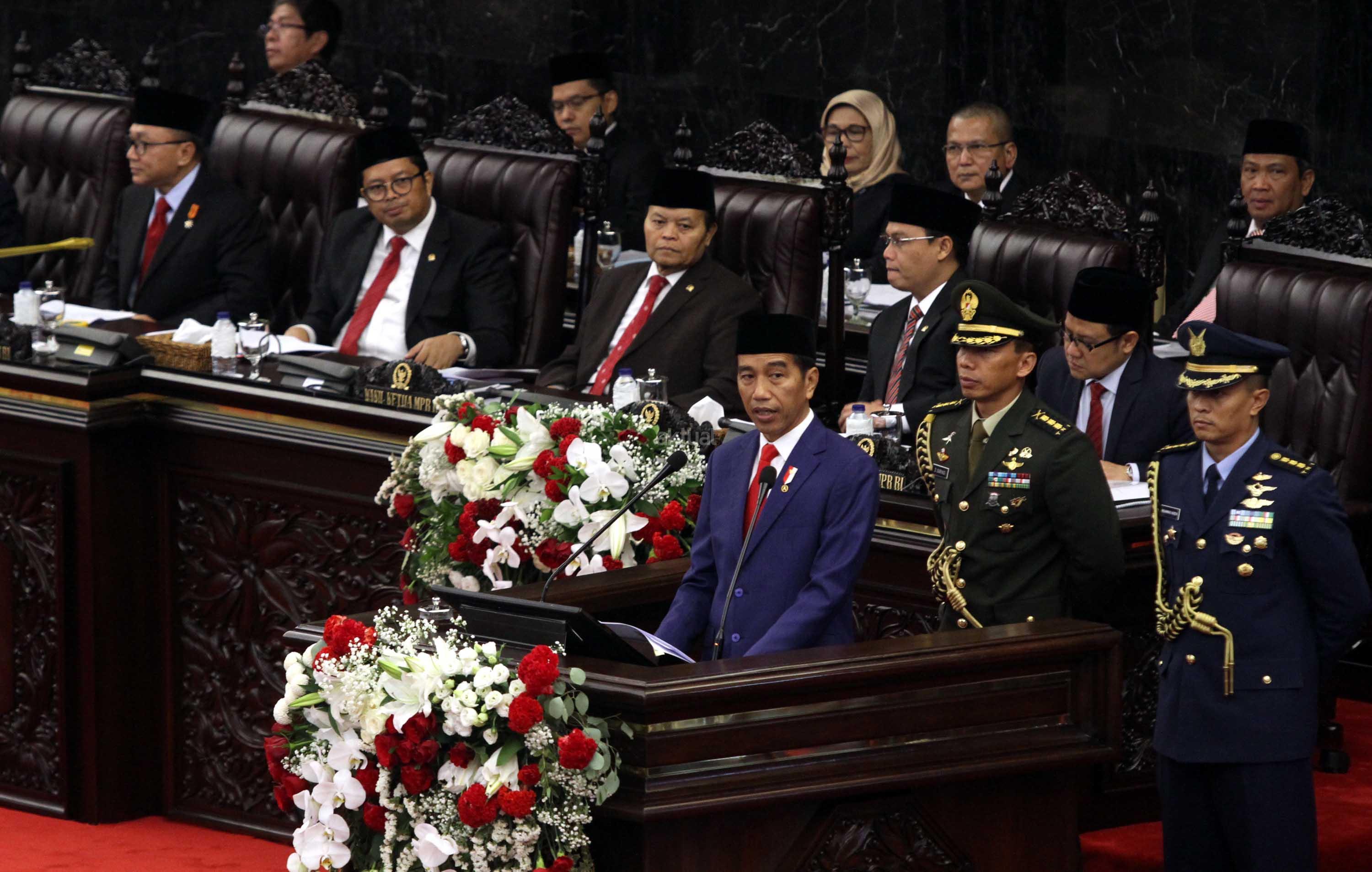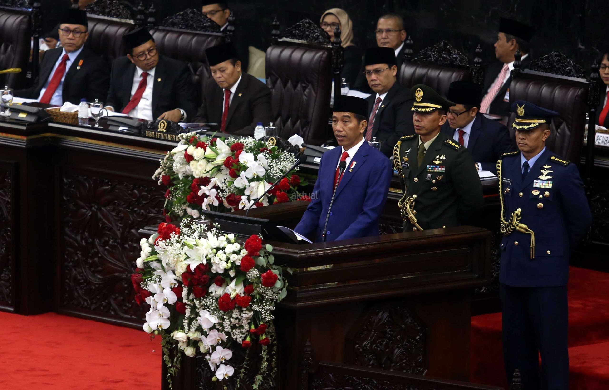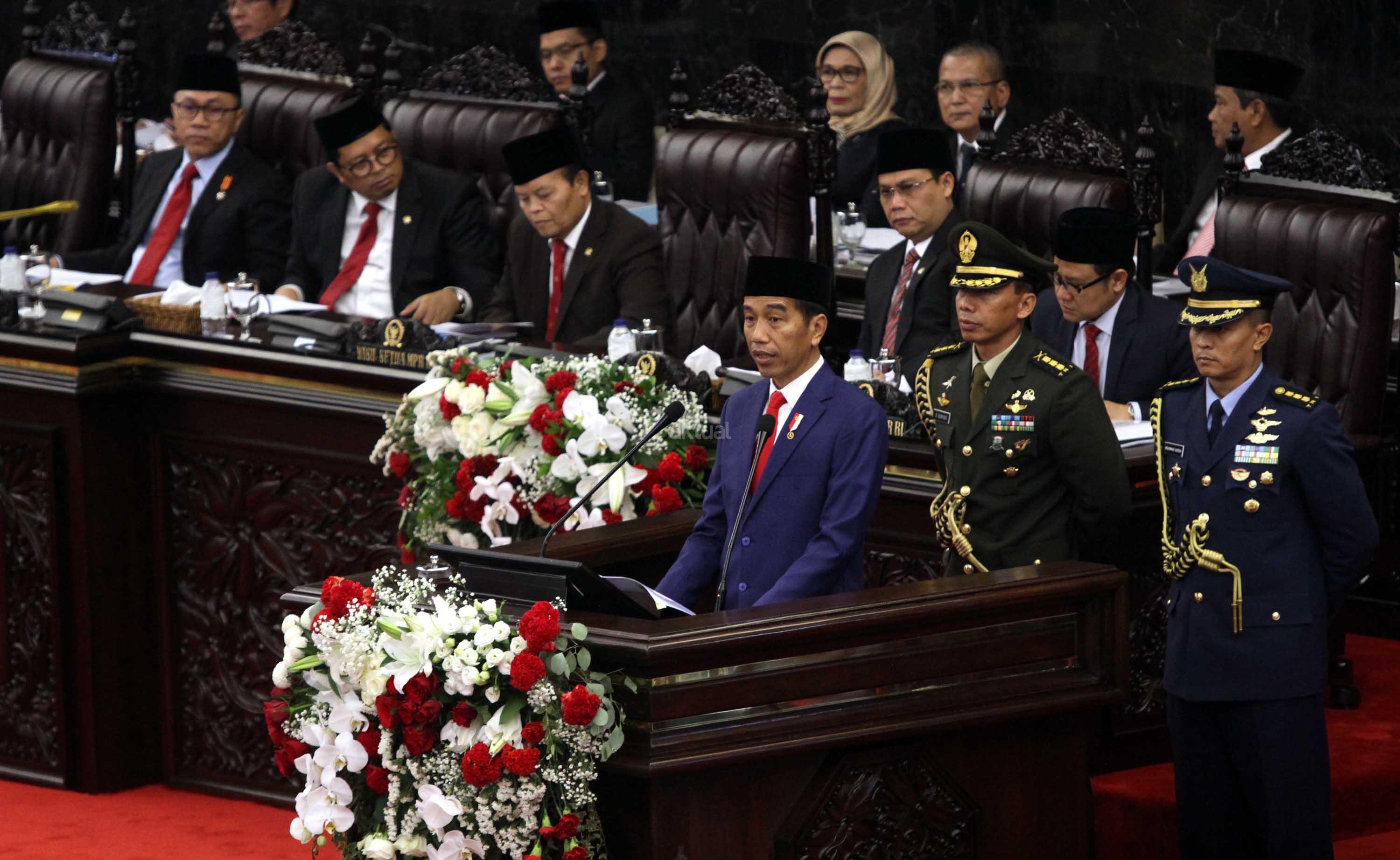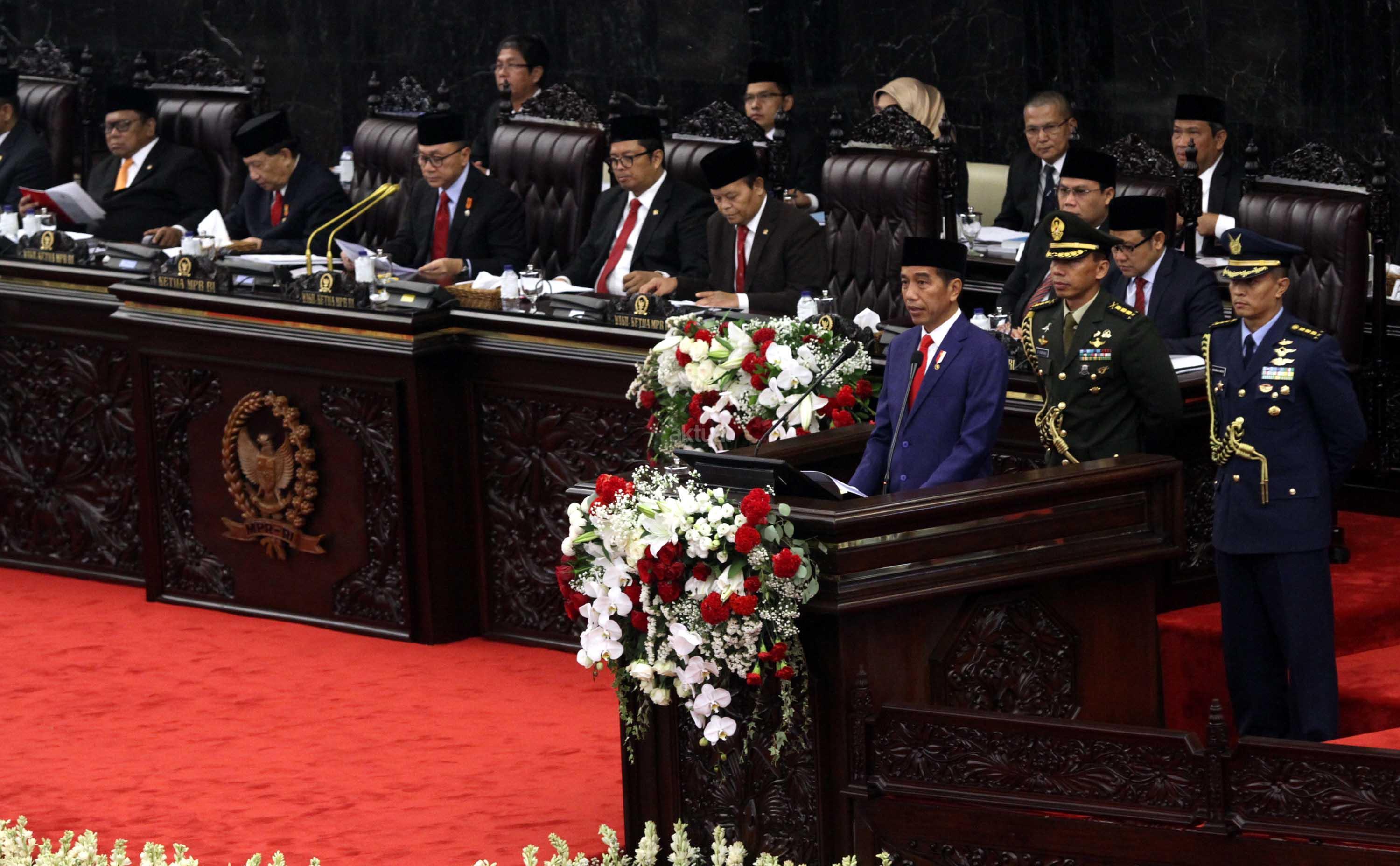 Presiden Joko Widodo menyampaikan Pidato Kenegaraan pada Sidang Tahunan MPR 2018 di Gedung Nusantara, Kompleks Parlemen, Senayan, Jakarta, Kamis (16/8). Sidang Tahunan MPR masih dalam satu rangkaian sidang bersama DPR-DPD, dan sidang DPR penyampaian nota keuangan RAPBN 2019. Sidang Tahunan MPR dilaksanakan pagi hari dilanjutkan sidang bersama DPR-DPD, dan sidang penyampaian nota keuangan. AKTUAL/Tino Oktaviano