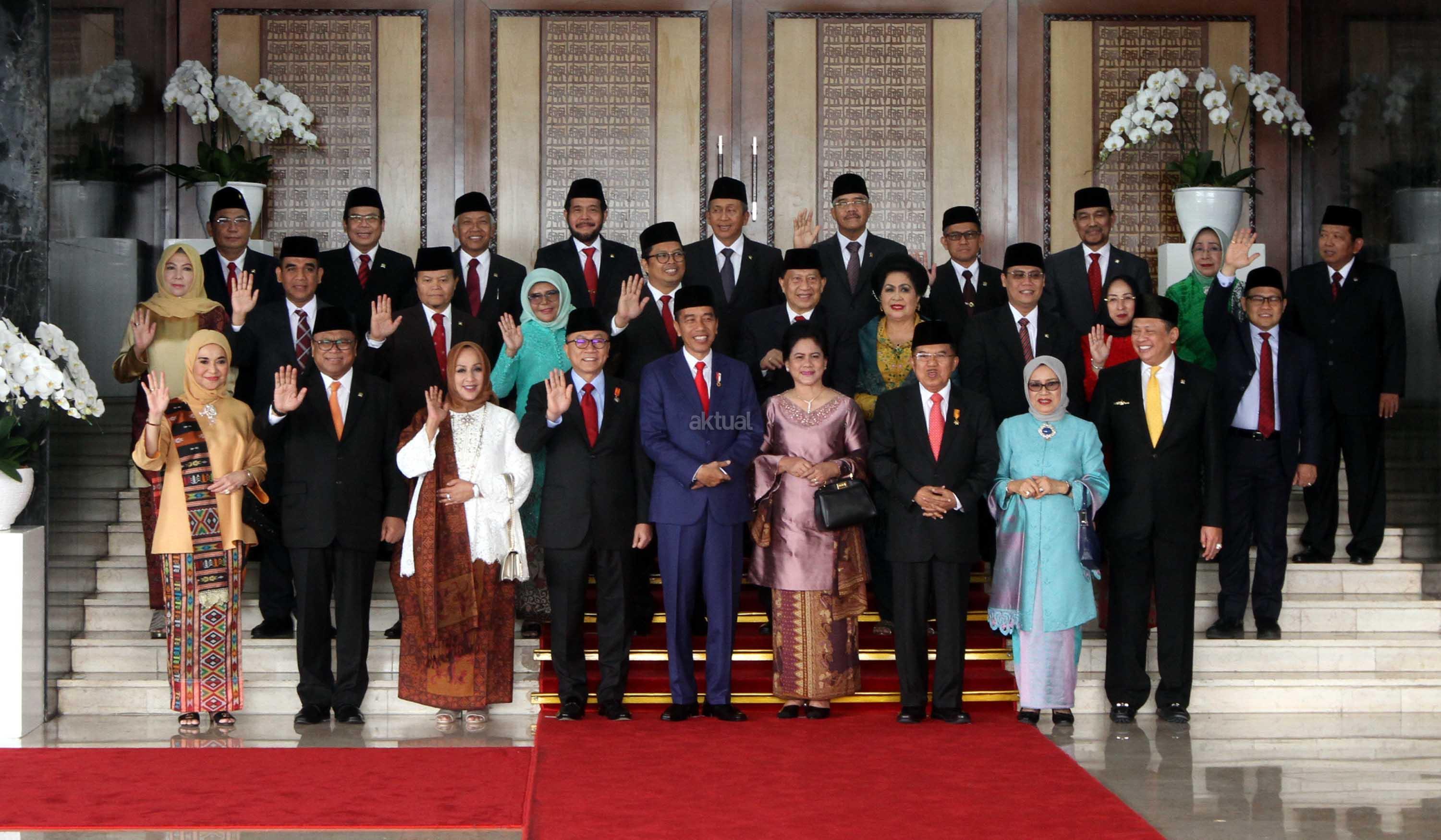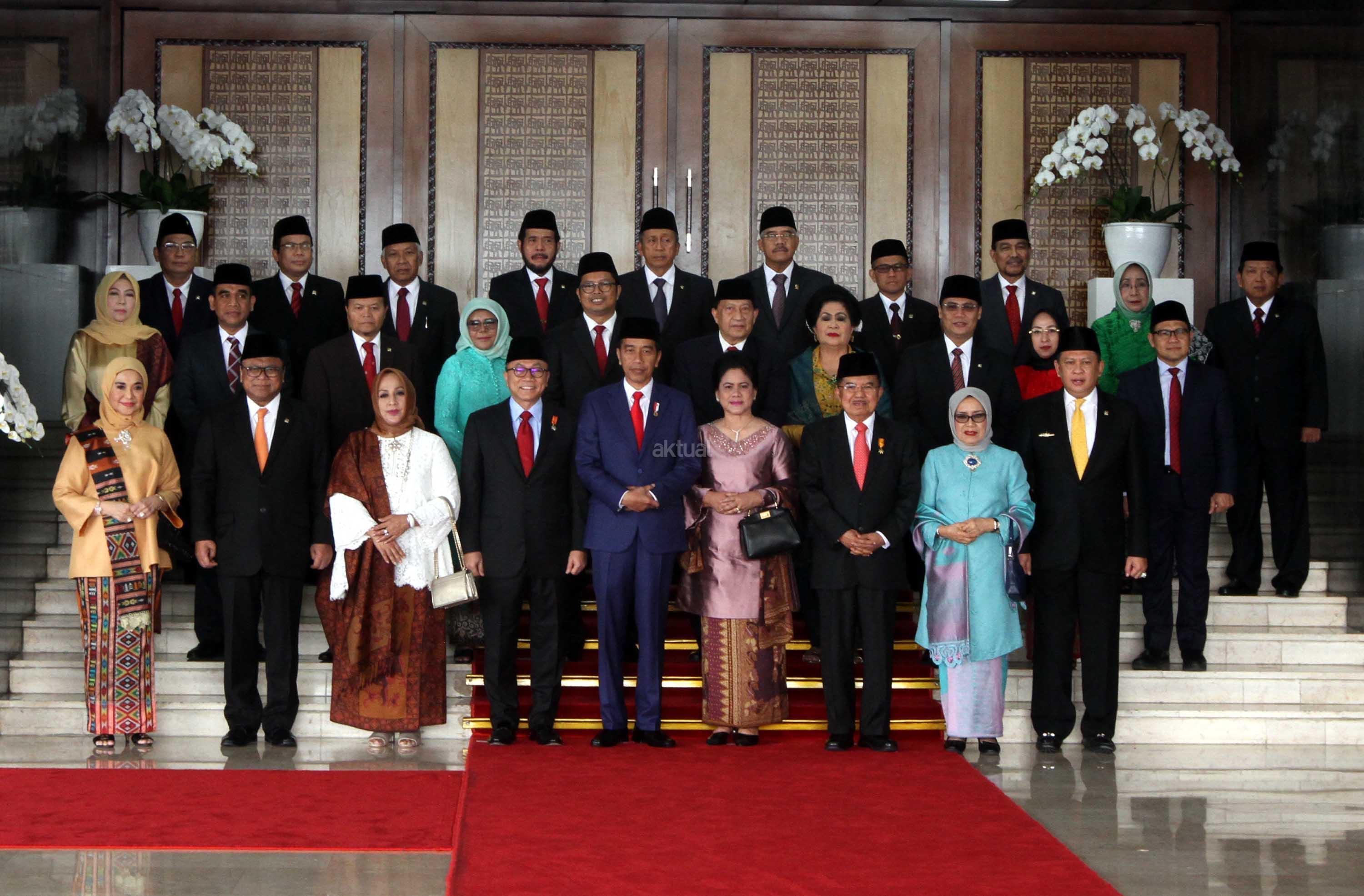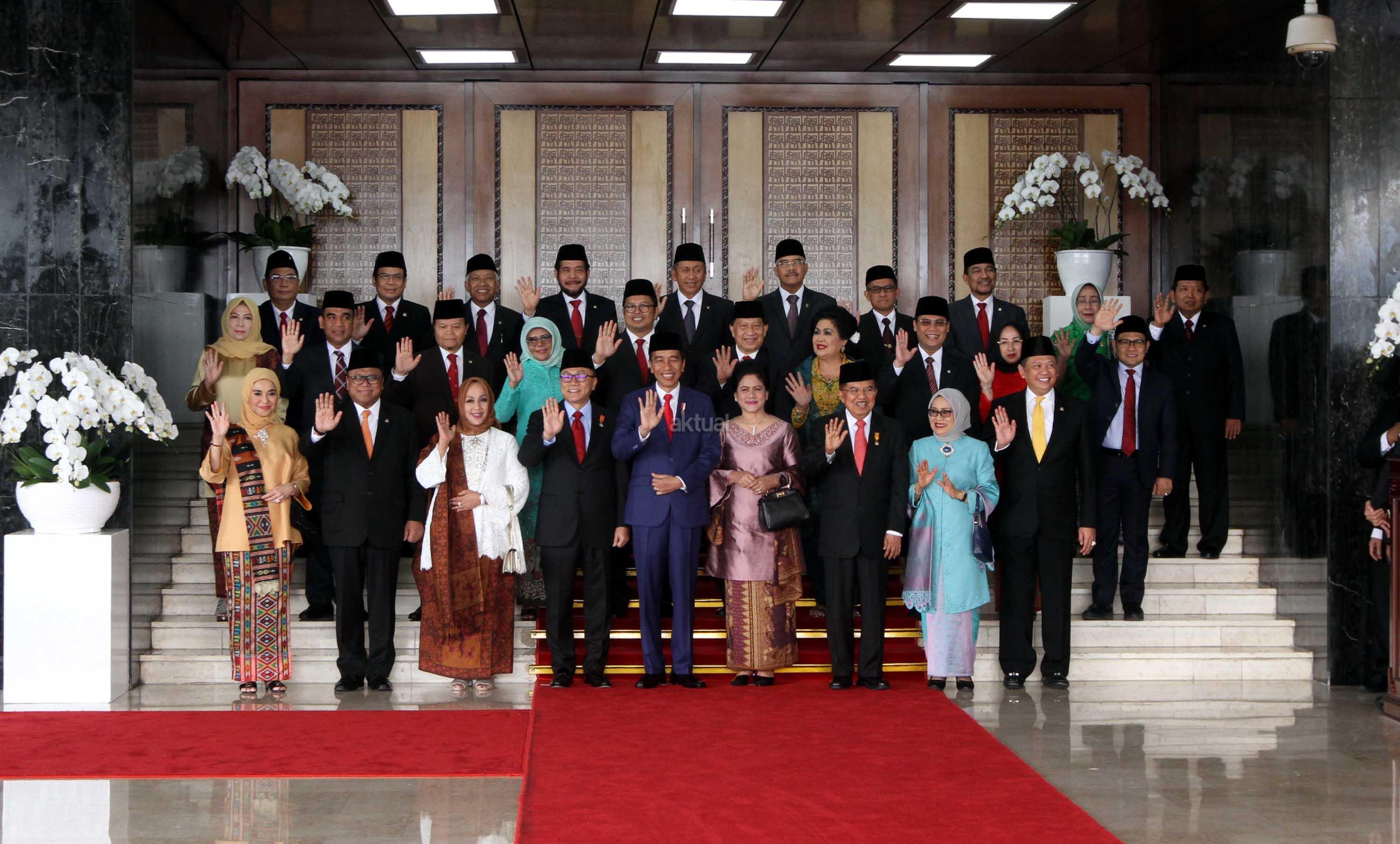 Presiden Joko Widodo (depan tengah) bersama Ibu Negara Iriana Joko Widodo (depan keempat kanan) Wakil Presiden Jusuf Kalla (depan ketiga kanan), Ibu Mufidah Jusuf Kalla (depan kedua kanan) dan pimpinan lembaga negara melambaikan tangan saat menghadiri Sidang Tahunan MPR, di Kompleks Parlemen, Senayan, Jakarta, Kamis (16/8). Sidang Tahunan MPR masih dalam satu rangkaian sidang bersama DPR-DPD, dan sidang DPR penyampaian nota keuangan RAPBN 2019. Sidang Tahunan MPR dilaksanakan pagi hari dilanjutkan sidang bersama DPR-DPD, dan sidang penyampaian nota keuangan. AKTUAL/Tino Oktaviano