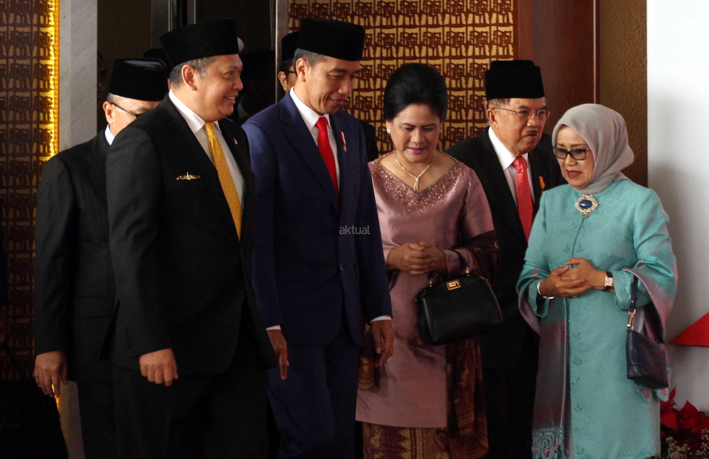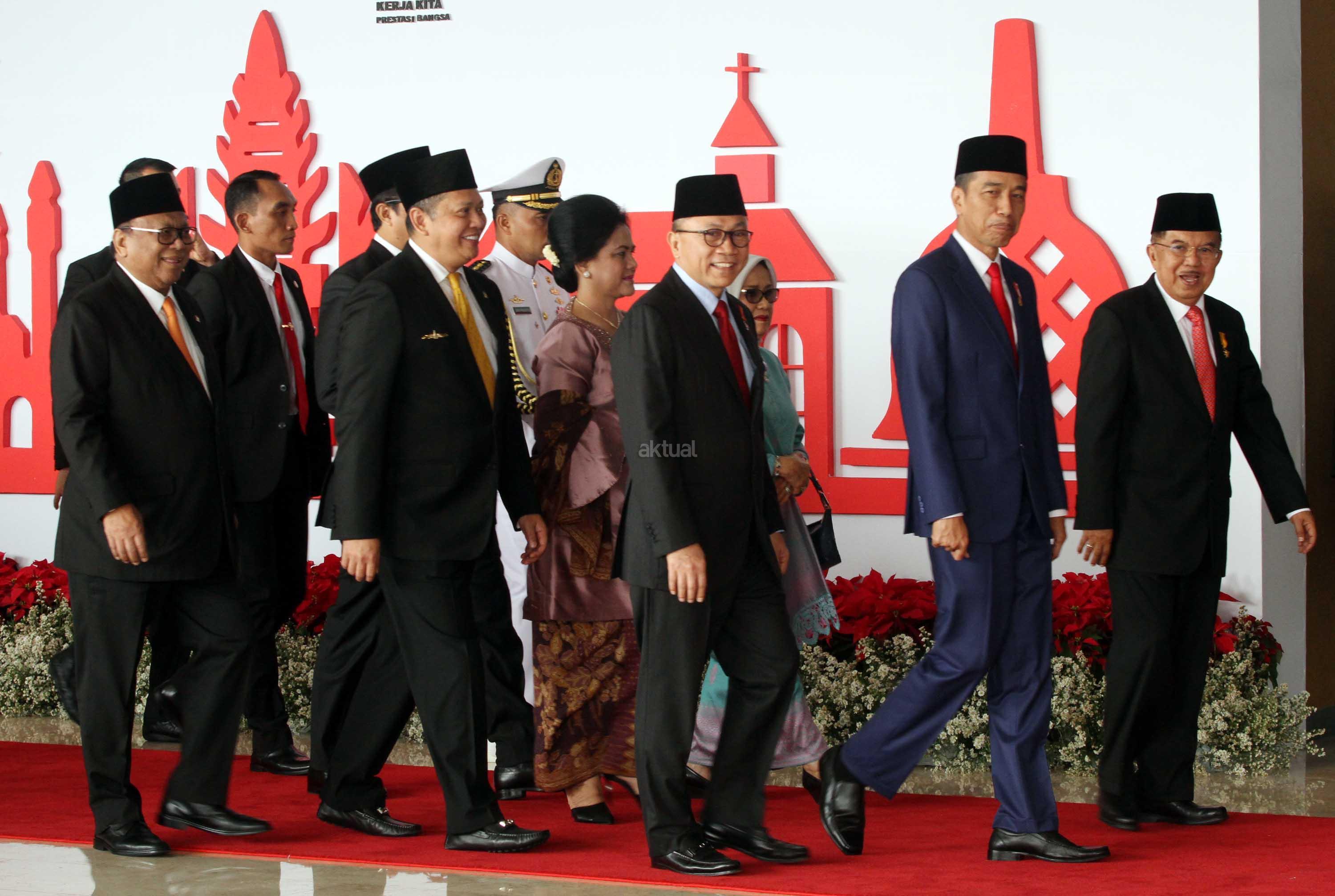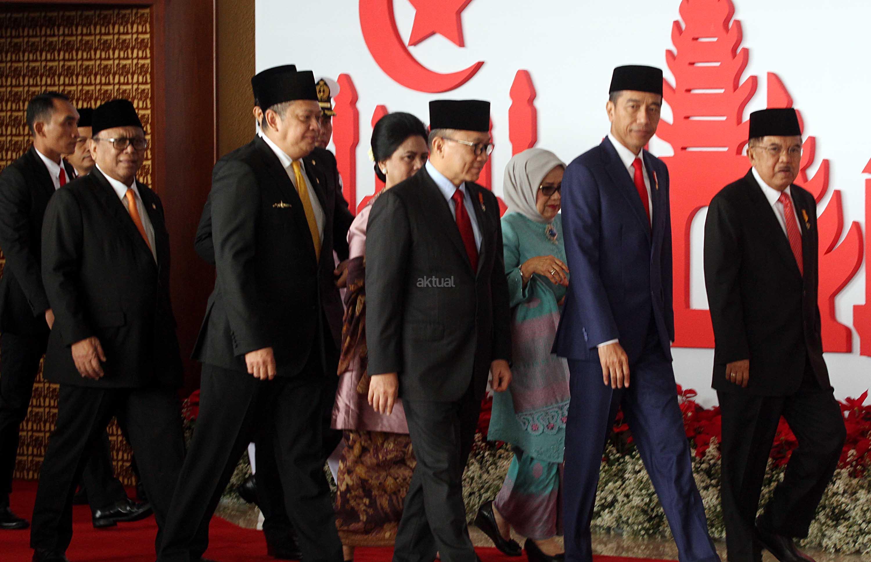 Presiden Joko Widodo, Wakil Presiden Jusuf Kalla didampingi Ketua DPR Bambang Susatyo, Ketua MPR Zulkifli Hasan, Ketua DPD Oesman Sapta tiba di lokasi Sidang Tahunan MPR, Kompleks Parlemen, Senayan, Jakarta, Kamis (16/8). Sidang Tahunan MPR masih dalam satu rangkaian sidang bersama DPR-DPD, dan sidang DPR penyampaian nota keuangan RAPBN 2019. Sidang Tahunan MPR dilaksanakan pagi hari dilanjutkan sidang bersama DPR-DPD, dan sidang penyampaian nota keuangan. AKTUAL/Tino Oktaviano