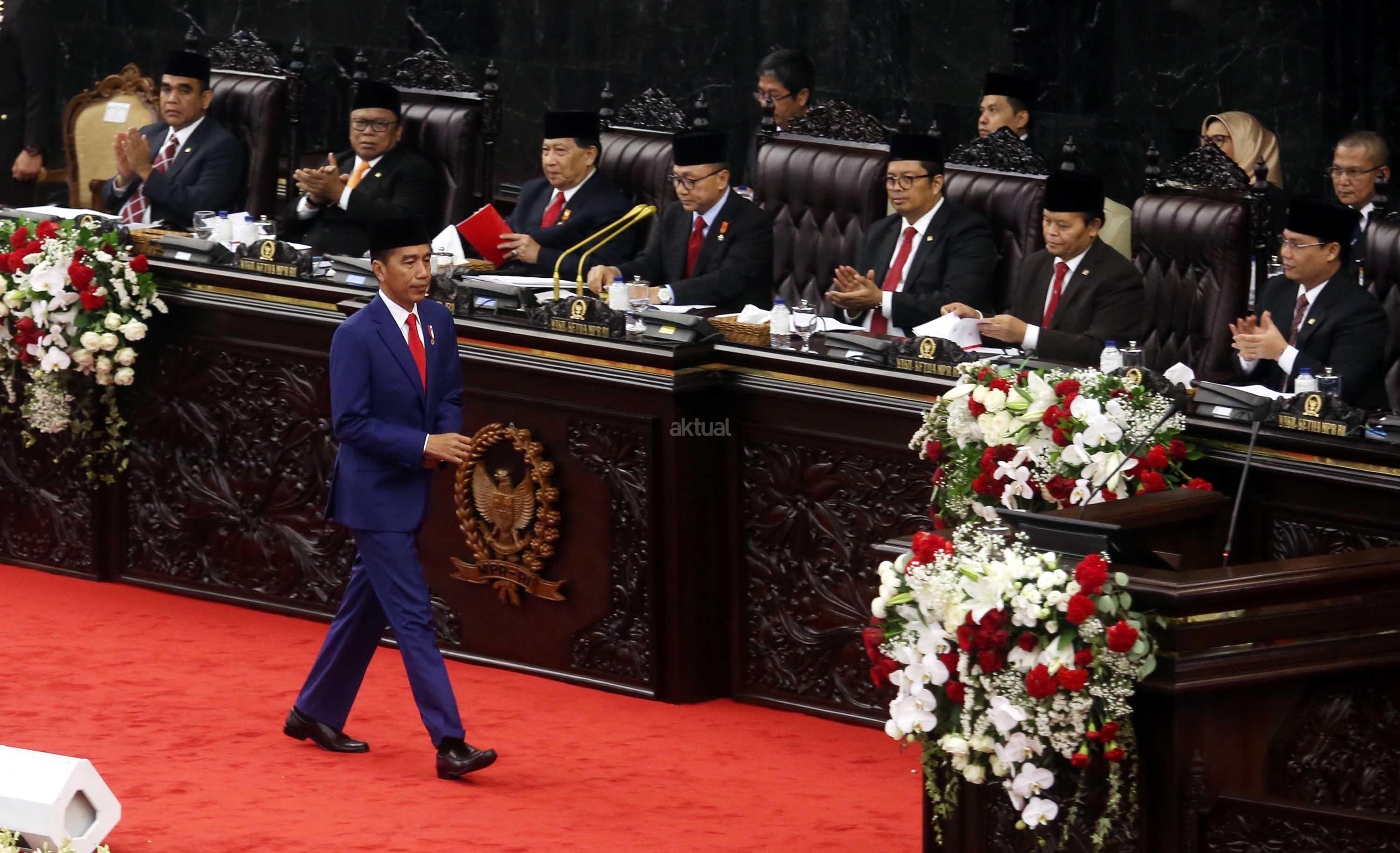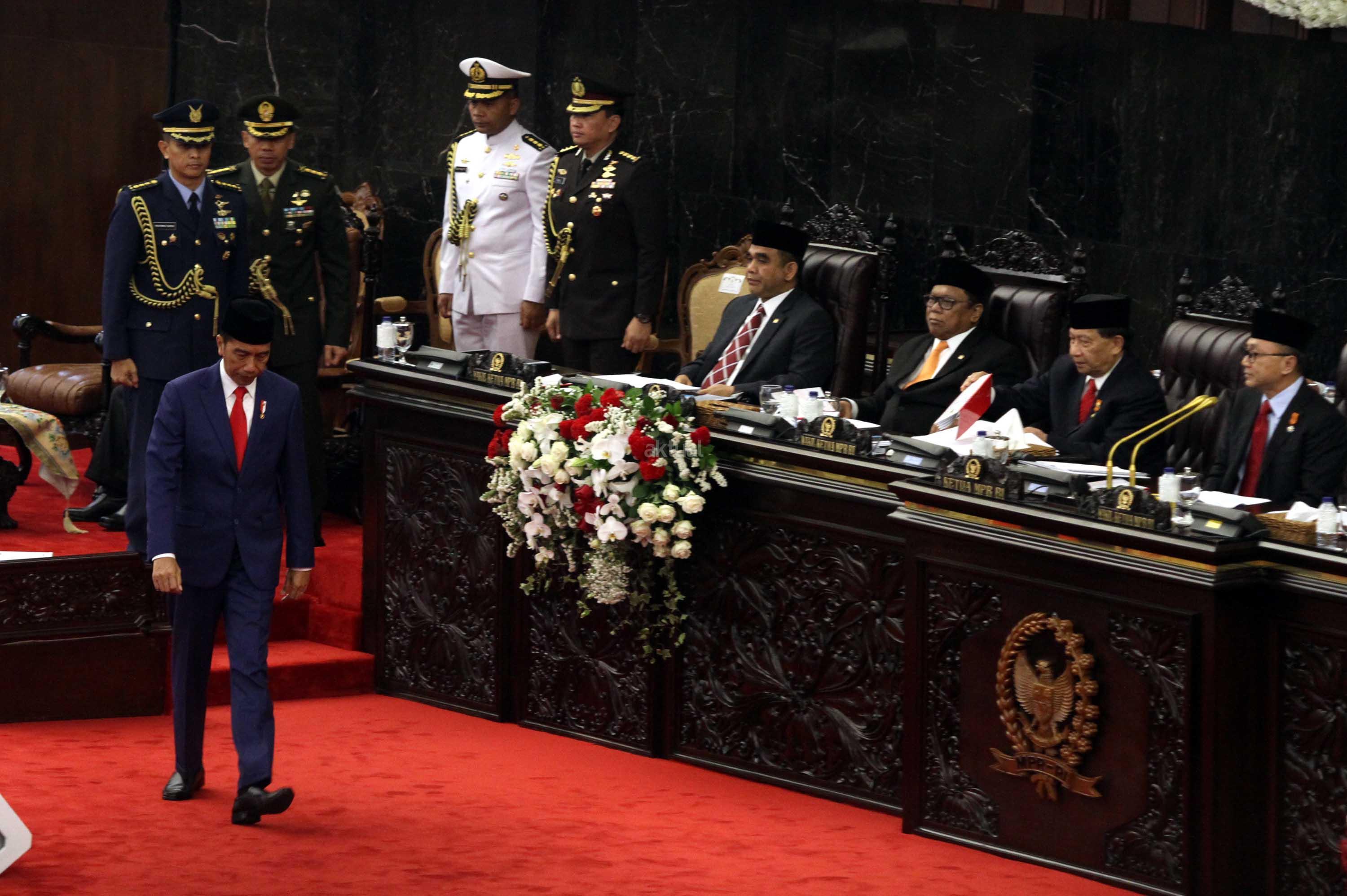 Presiden Joko Widodo saat akan menyampaikan Pidato Kenegaraan pada Sidang Tahunan MPR 2018 di Gedung Nusantara, Kompleks Parlemen, Senayan, Jakarta, Kamis (16/8). Sidang Tahunan MPR masih dalam satu rangkaian sidang bersama DPR-DPD, dan sidang DPR penyampaian nota keuangan RAPBN 2019. Sidang Tahunan MPR dilaksanakan pagi hari dilanjutkan sidang bersama DPR-DPD, dan sidang penyampaian nota keuangan. AKTUAL/Tino Oktaviano