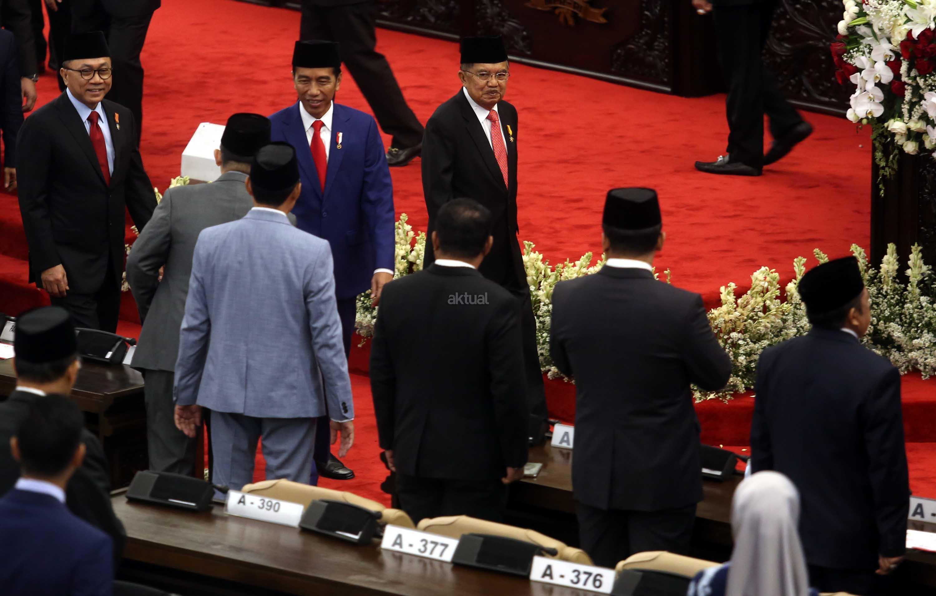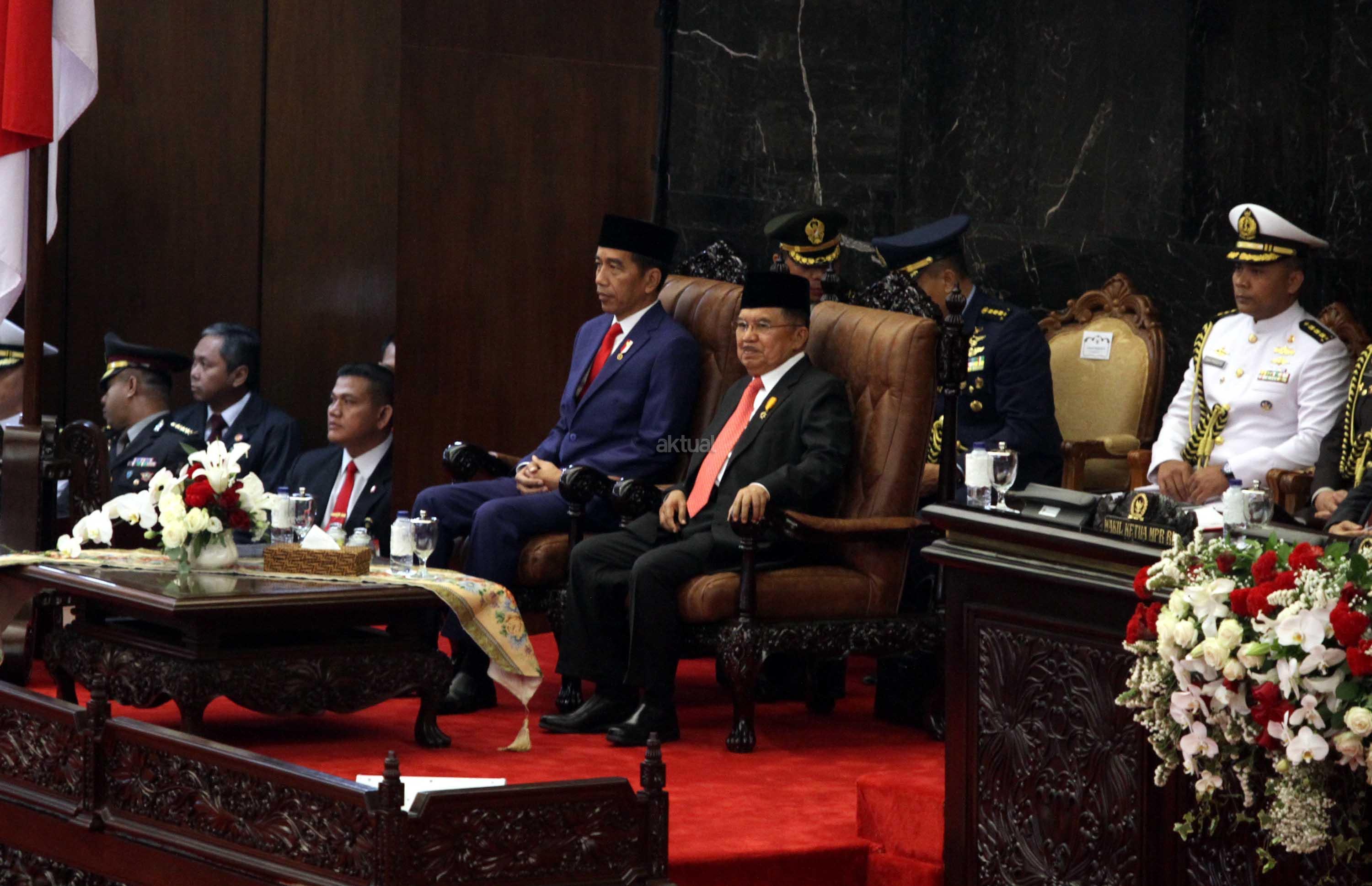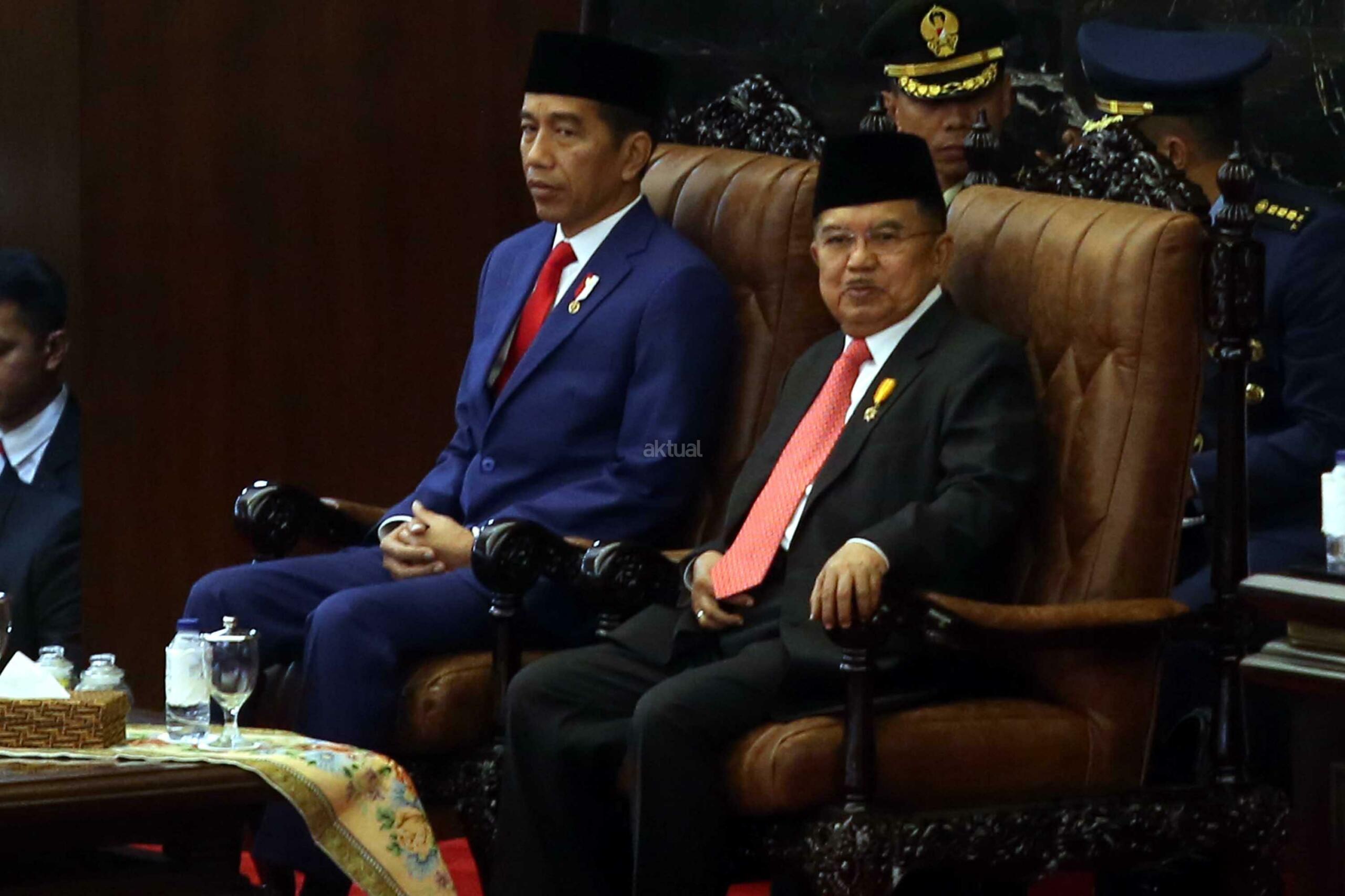 Presiden Joko Widodo dan Wakil Presiden Jusuf Kalla saat mengikuti Sidang Tahunan MPR di Kompleks Parlemen, Senayan, Jakarta, Kamis (16/8). Sidang Tahunan MPR masih dalam satu rangkaian sidang bersama DPR-DPD, dan sidang DPR penyampaian nota keuangan RAPBN 2019. Sidang Tahunan MPR dilaksanakan pagi hari dilanjutkan sidang bersama DPR-DPD, dan sidang penyampaian nota keuangan. AKTUAL/Tino Oktaviano