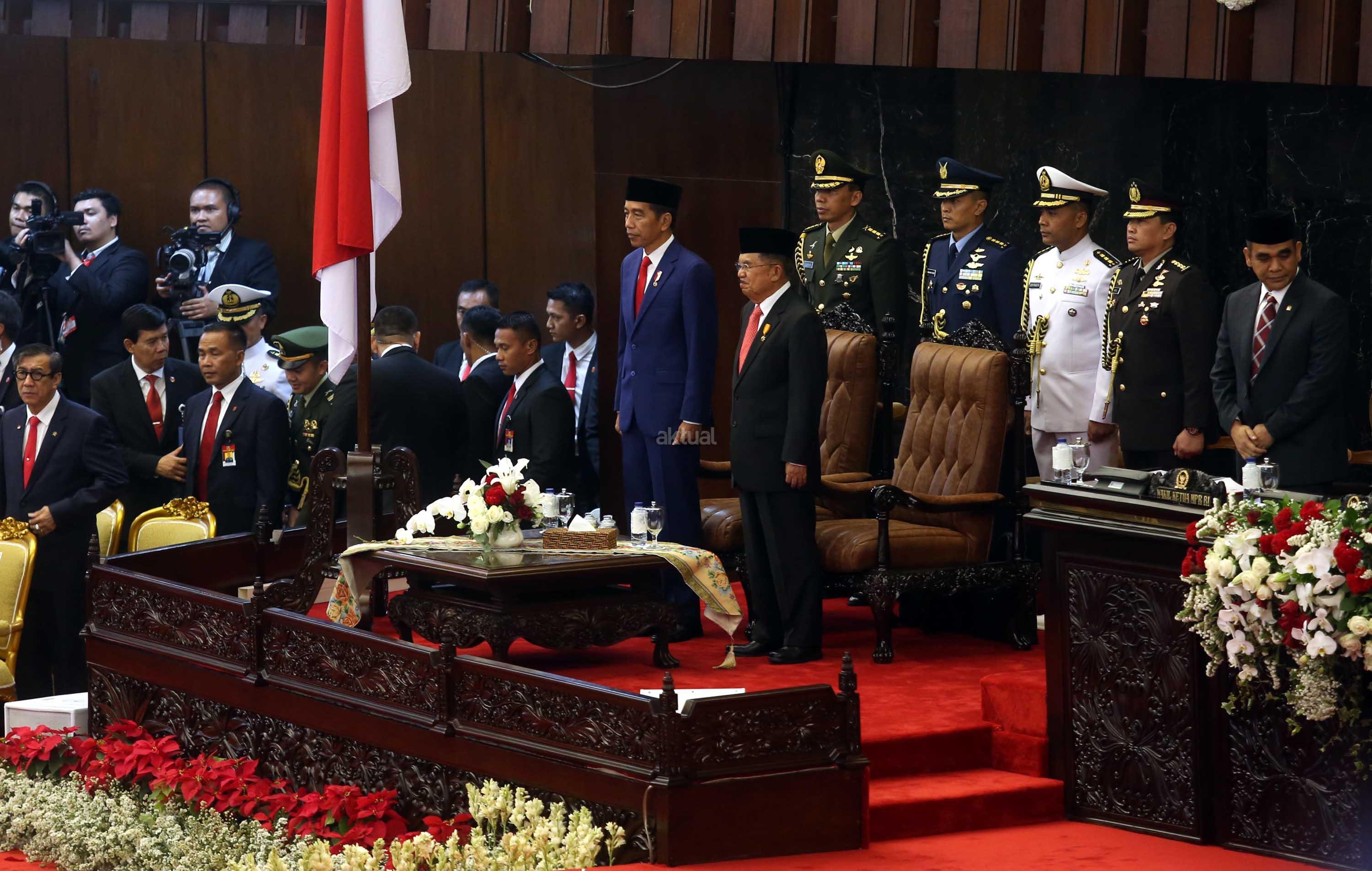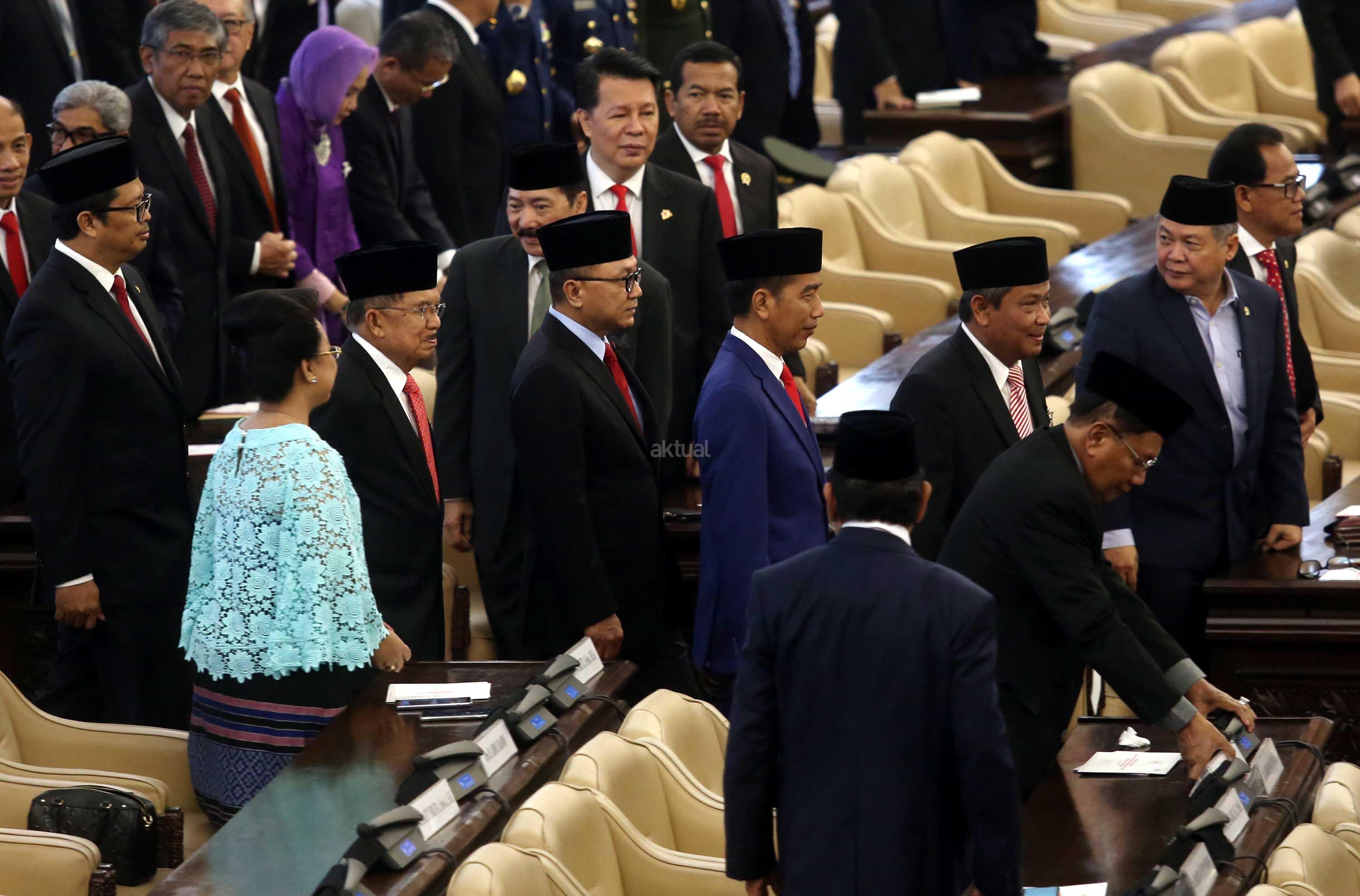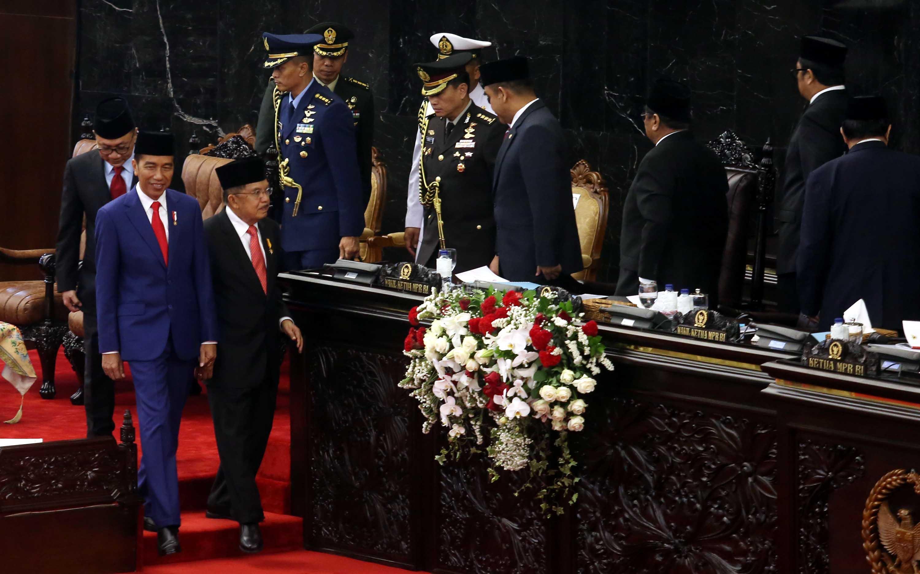 Presiden Joko Widodo dan Wakil Presiden Jusuf Kalla saat mengikuti Sidang Tahunan MPR di Kompleks Parlemen, Senayan, Jakarta, Kamis (16/8). Sidang Tahunan MPR masih dalam satu rangkaian sidang bersama DPR-DPD, dan sidang DPR penyampaian nota keuangan RAPBN 2019. Sidang Tahunan MPR dilaksanakan pagi hari dilanjutkan sidang bersama DPR-DPD, dan sidang penyampaian nota keuangan. AKTUAL/Tino Oktaviano