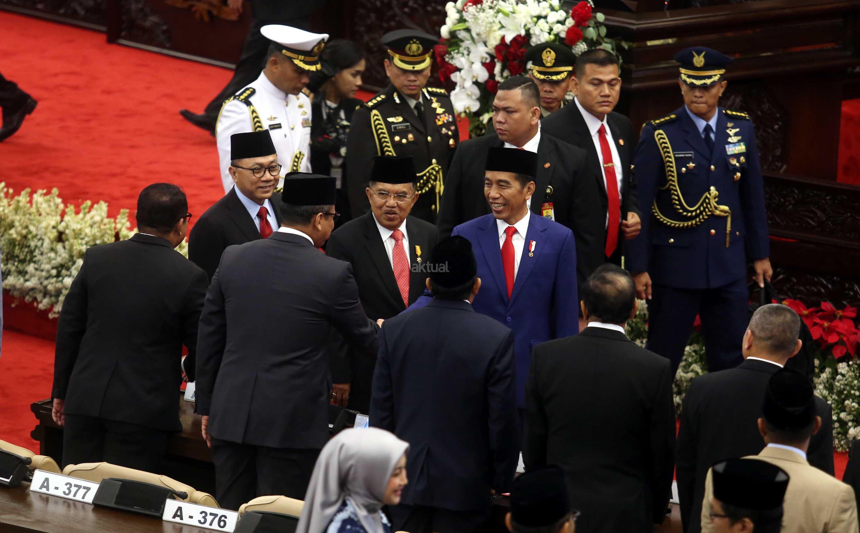 Presiden Joko Widodo dan Wapres Jusuf Kalla saat menghadiri tiba di lokasi Sidang Tahunan MPR, Kompleks Parlemen, Senayan, Jakarta, Kamis (16/8). Sidang Tahunan MPR masih dalam satu rangkaian sidang bersama DPR-DPD, dan sidang DPR penyampaian nota keuangan RAPBN 2019. Sidang Tahunan MPR dilaksanakan pagi hari dilanjutkan sidang bersama DPR-DPD, dan sidang penyampaian nota keuangan. AKTUAL/Tino Oktaviano
