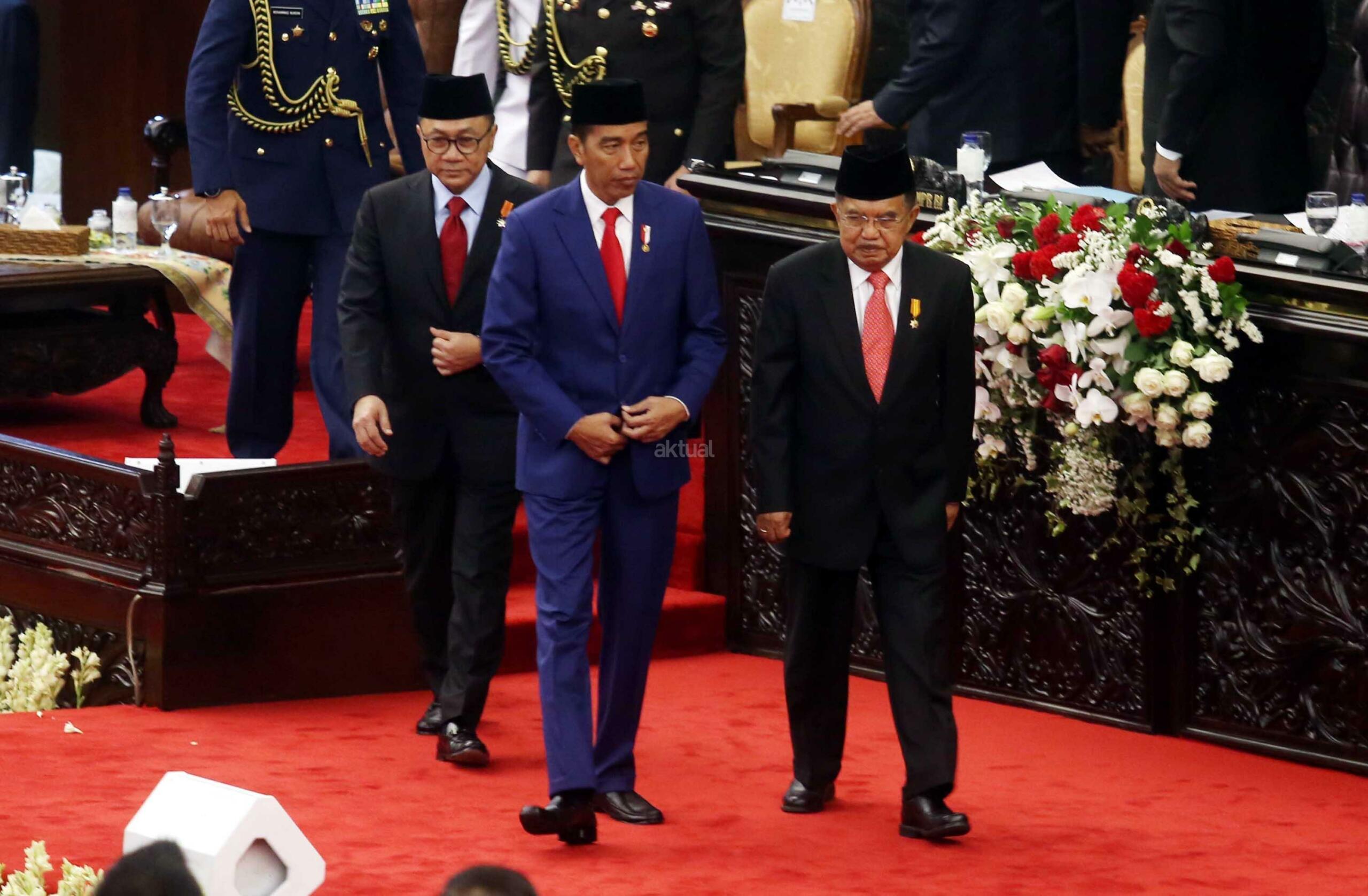 Presiden Joko Widodo, Wapres Jusuf Kalla saay Presiden Joko Widodo dan Wapres Jusuf Kalla saat menghadiri tiba di lokasi Sidang Tahunan MPR, Kompleks Parlemen, Senayan, Jakarta, Kamis (16/8). Sidang Tahunan MPR masih dalam satu rangkaian sidang bersama DPR-DPD, dan sidang DPR penyampaian nota keuangan RAPBN 2019. Sidang Tahunan MPR dilaksanakan pagi hari dilanjutkan sidang bersama DPR-DPD, dan sidang penyampaian nota keuangan. AKTUAL/Tino Oktaviano