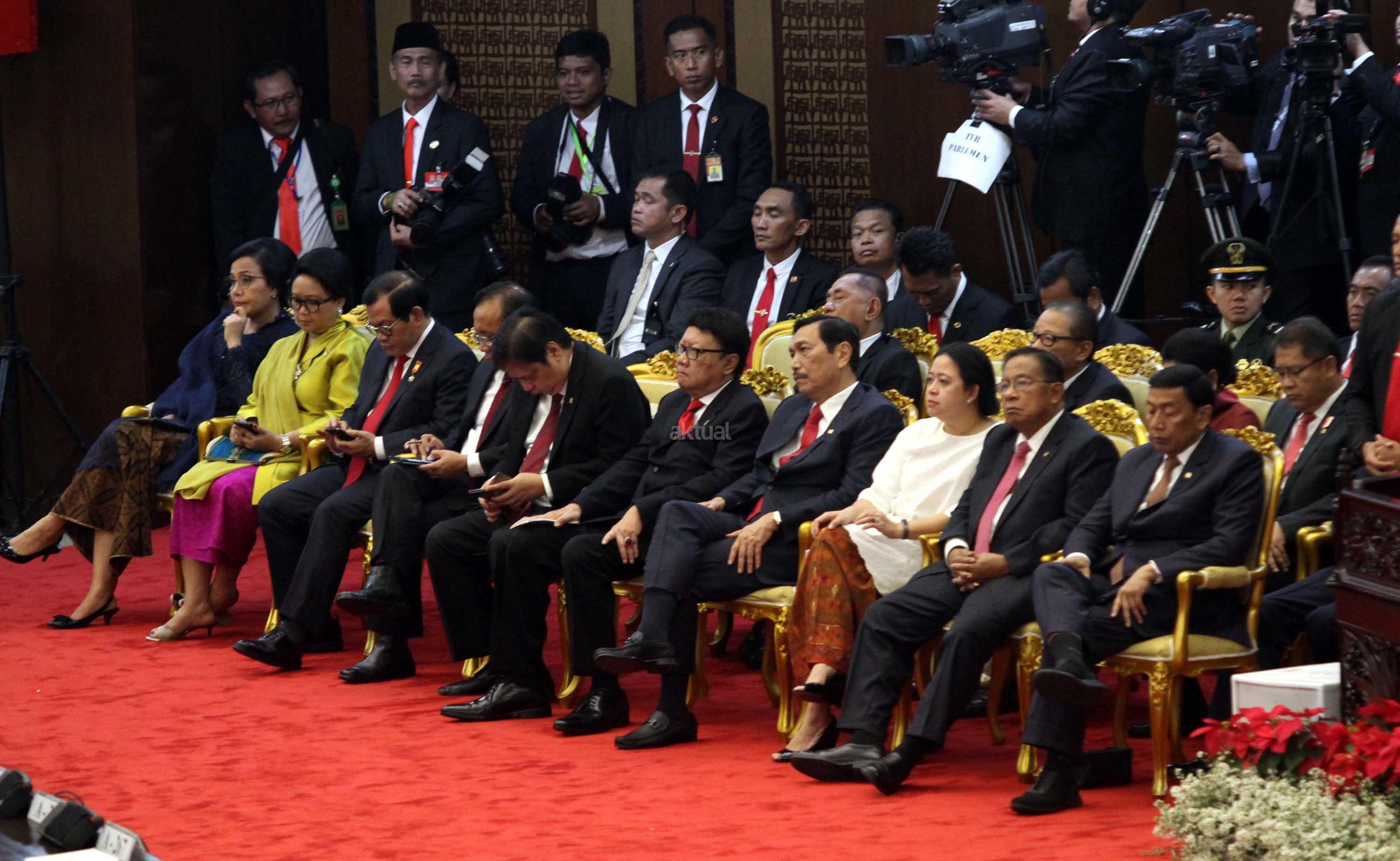 Sejumlah menteri Kabinet Kerja saat mengikuti Sidang Tahunan MPR, Kompleks Parlemen, Senayan, Jakarta, Kamis (16/8). Sidang Tahunan MPR masih dalam satu rangkaian sidang bersama DPR-DPD, dan sidang DPR penyampaian nota keuangan RAPBN 2019. Sidang Tahunan MPR dilaksanakan pagi hari dilanjutkan sidang bersama DPR-DPD, dan sidang penyampaian nota keuangan. AKTUAL/Tino Oktaviano