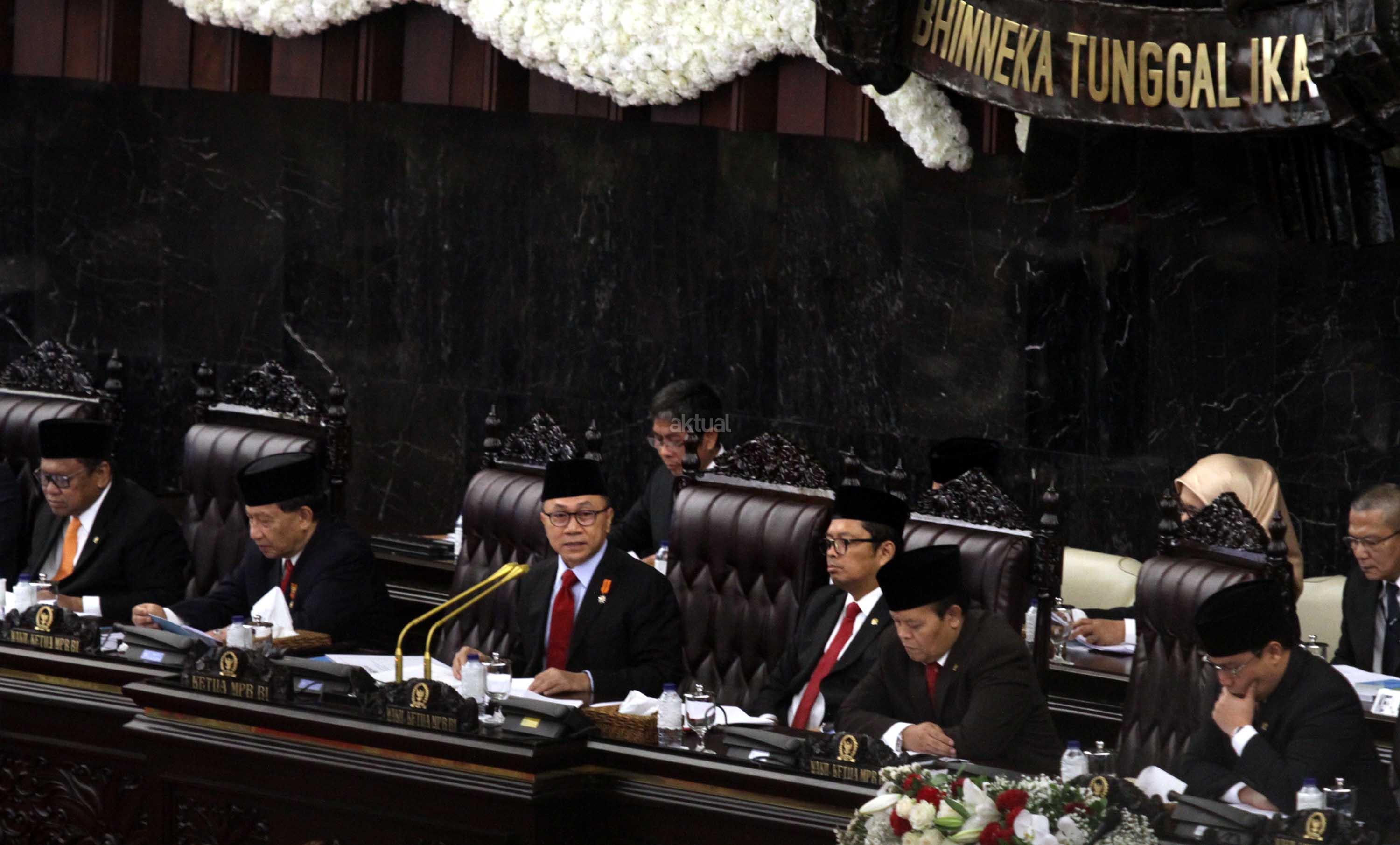 Ketua MPR Zulkifli Hasan saat memmimpin Sidang Tahunan MPR di Kompleks Parlemen, Senayan, Jakarta, Kamis (16/8). Sidang Tahunan MPR masih dalam satu rangkaian sidang bersama DPR-DPD, dan sidang DPR penyampaian nota keuangan RAPBN 2019. Sidang Tahunan MPR dilaksanakan pagi hari dilanjutkan sidang bersama DPR-DPD, dan sidang penyampaian nota keuangan. AKTUAL/Tino Oktaviano