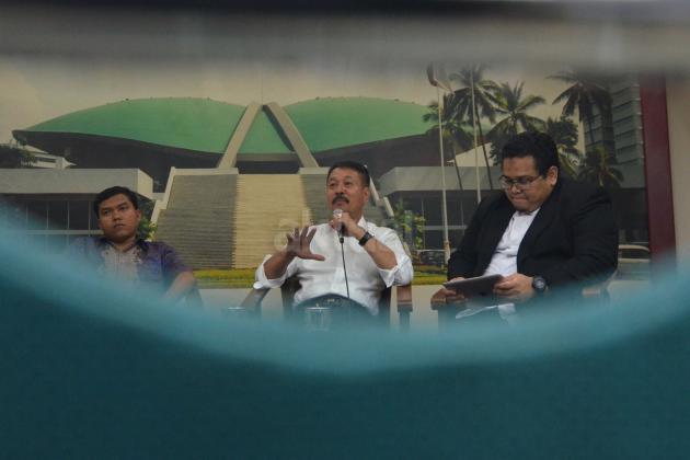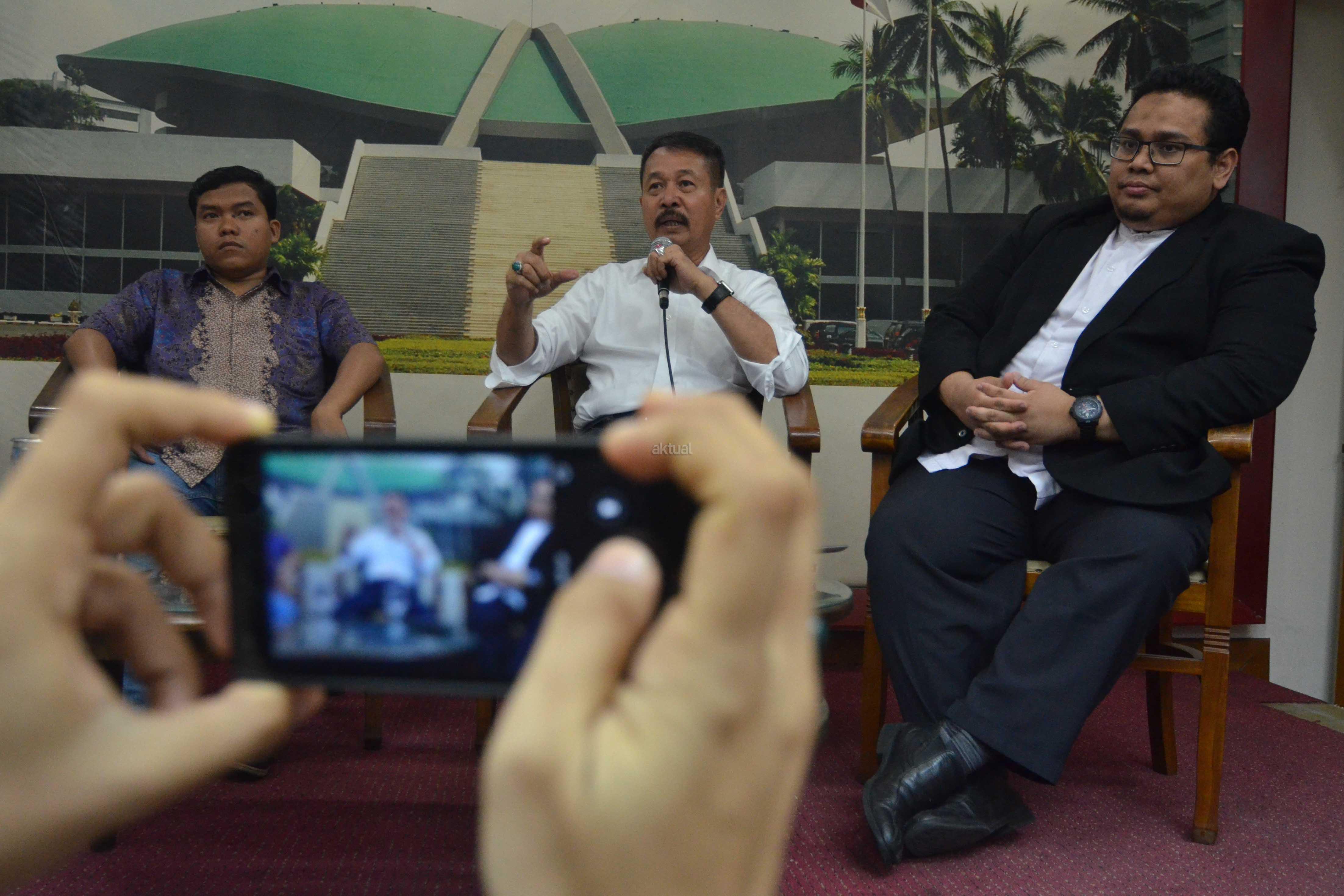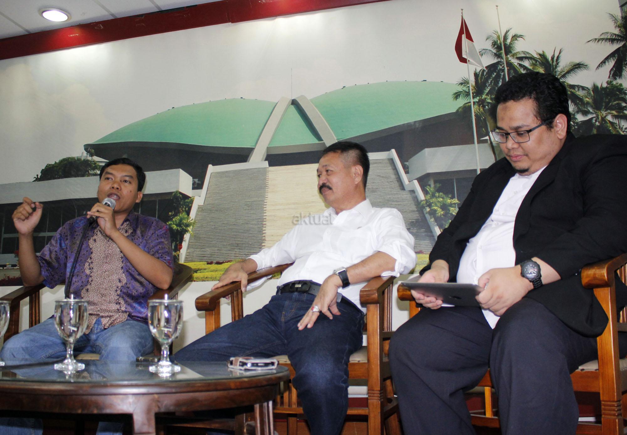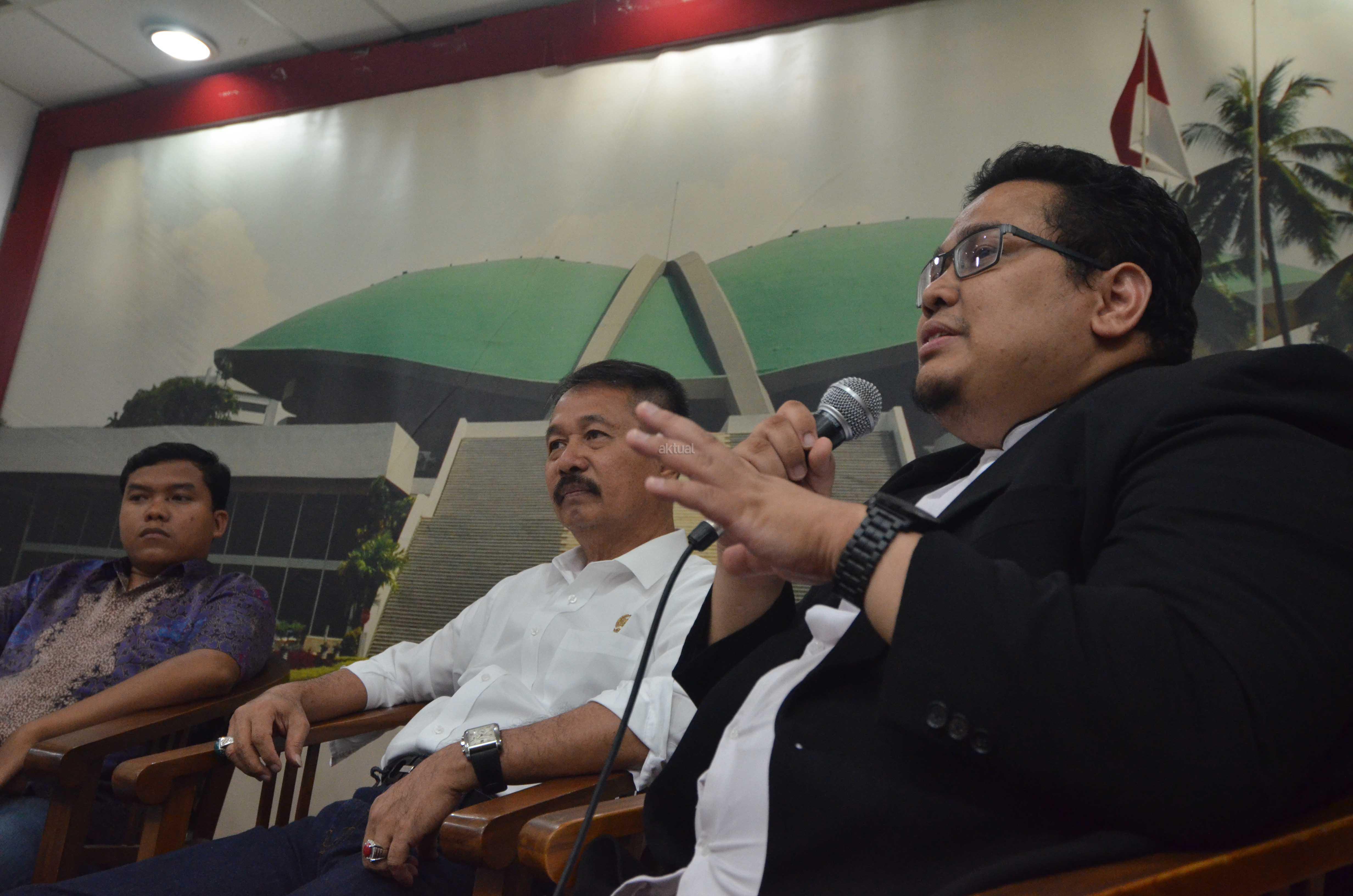 Anggota DPP Partai NasDem yang juga Anggota Komisi II DPR Fraksi NasDem, Luthfy A Mutty (tengah) bersama Pengamat Hukum Tata Negara Al-Azhar, Rahmat Bagja (kanan), dan Pengamat politik dari UIN Syarif Hidayatullah, Pangi Syarwi Chaniago (kiri) menyampaikan pandangannya seputar status tersangka kepada mantan Sekjen Partai NasDem Patrice Rio Capella, di Press Room DPR RI, Jakarta, Jumat (16/10/2015). Menurut Luthfy, Partai NasDem menyerahkan kepada KPK dalam mengungkap korupsi bansos di Sumut dengan tidak adanya tekanan dari luar dan bebas dari politis.
