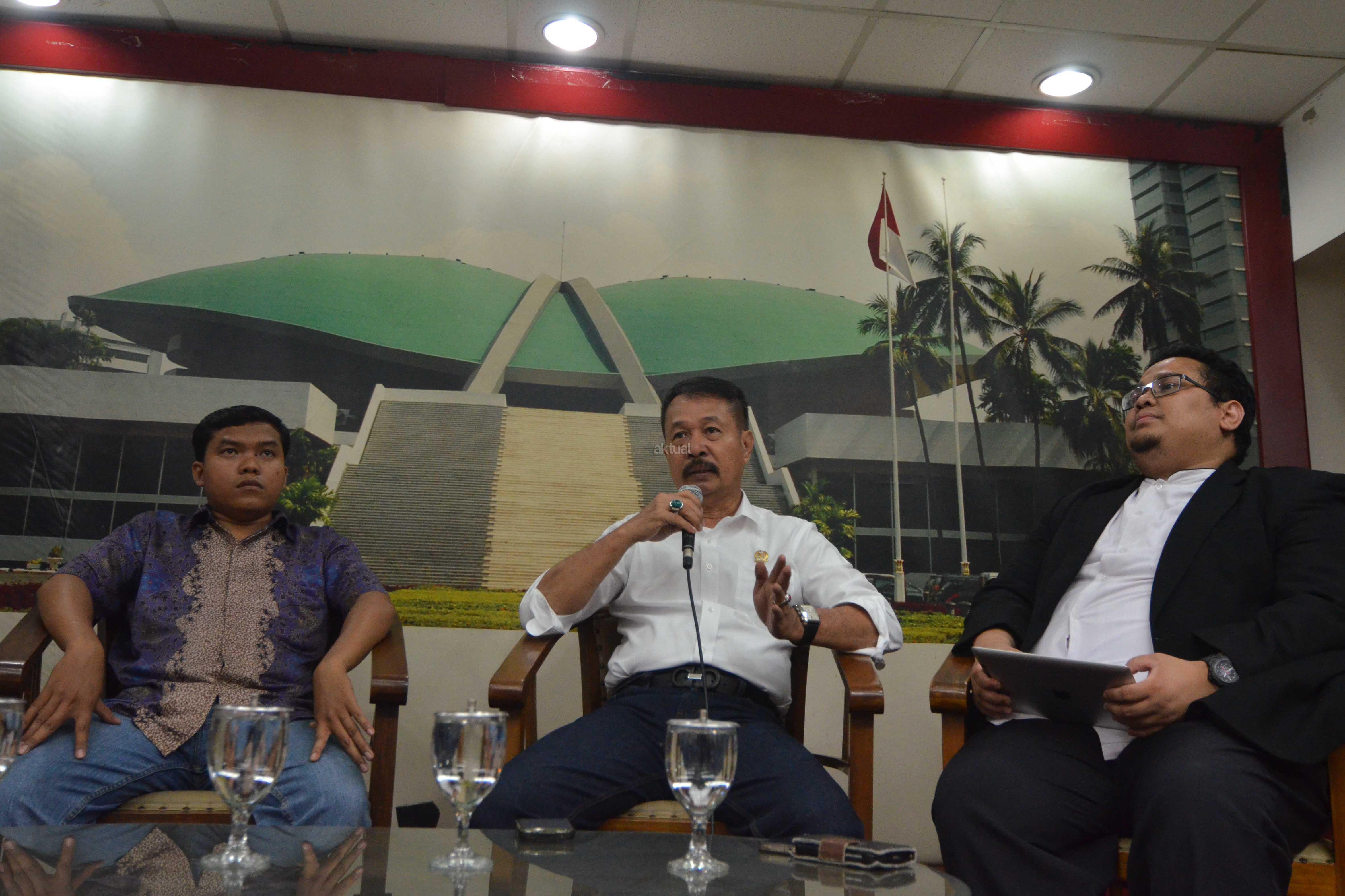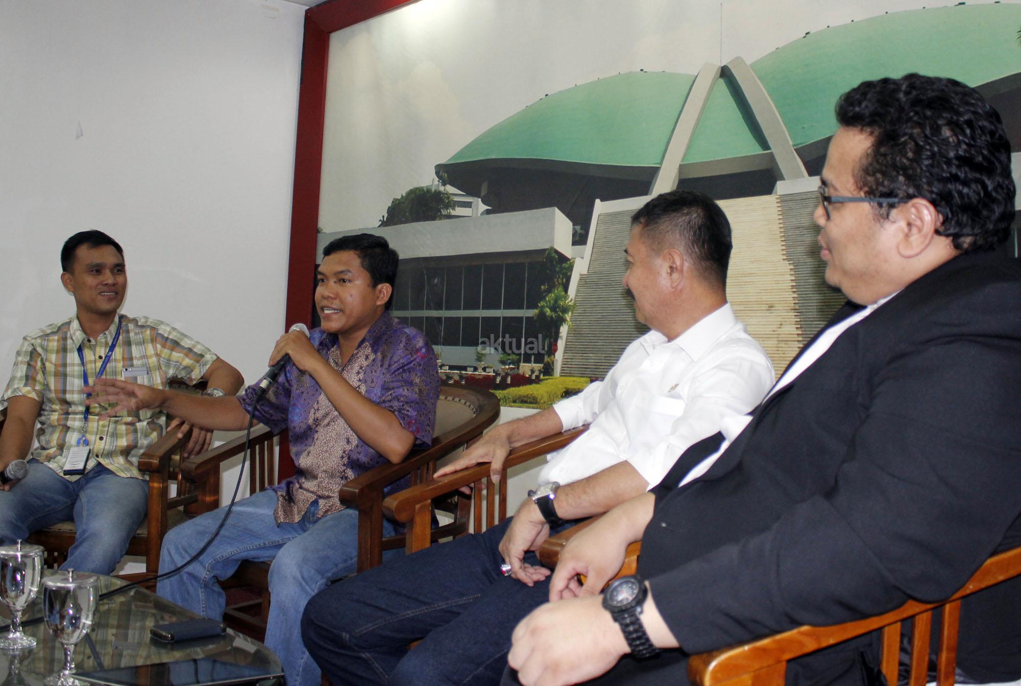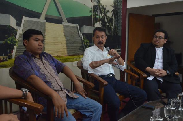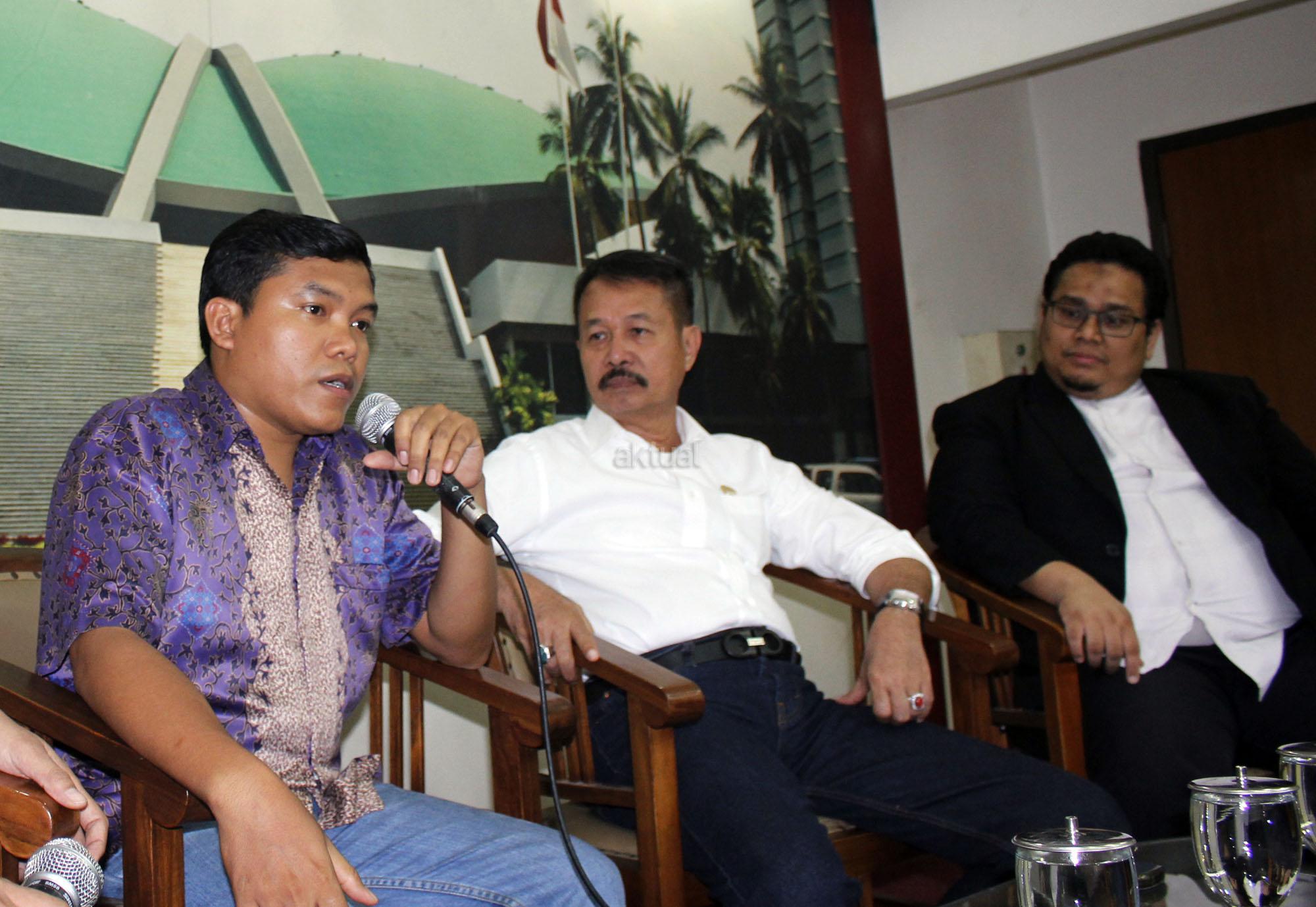 Anggota DPP Partai NasDem yang juga Anggota Komisi II DPR Fraksi NasDem, Luthfy A Mutty (tengah) bersama Pengamat Hukum Tata Negara Al-Azhar, Rahmat Bagja (kanan), dan Pengamat politik dari UIN Syarif Hidayatullah, Pangi Syarwi Chaniago (kiri) menyampaikan pandangannya seputar status tersangka kepada mantan Sekjen Partai NasDem Patrice Rio Capella, di Press Room DPR RI, Jakarta, Jumat (16/10/2015). Menurut Luthfy, Partai NasDem menyerahkan kepada KPK dalam mengungkap korupsi bansos di Sumut dengan tidak adanya tekanan dari luar dan bebas dari politis.