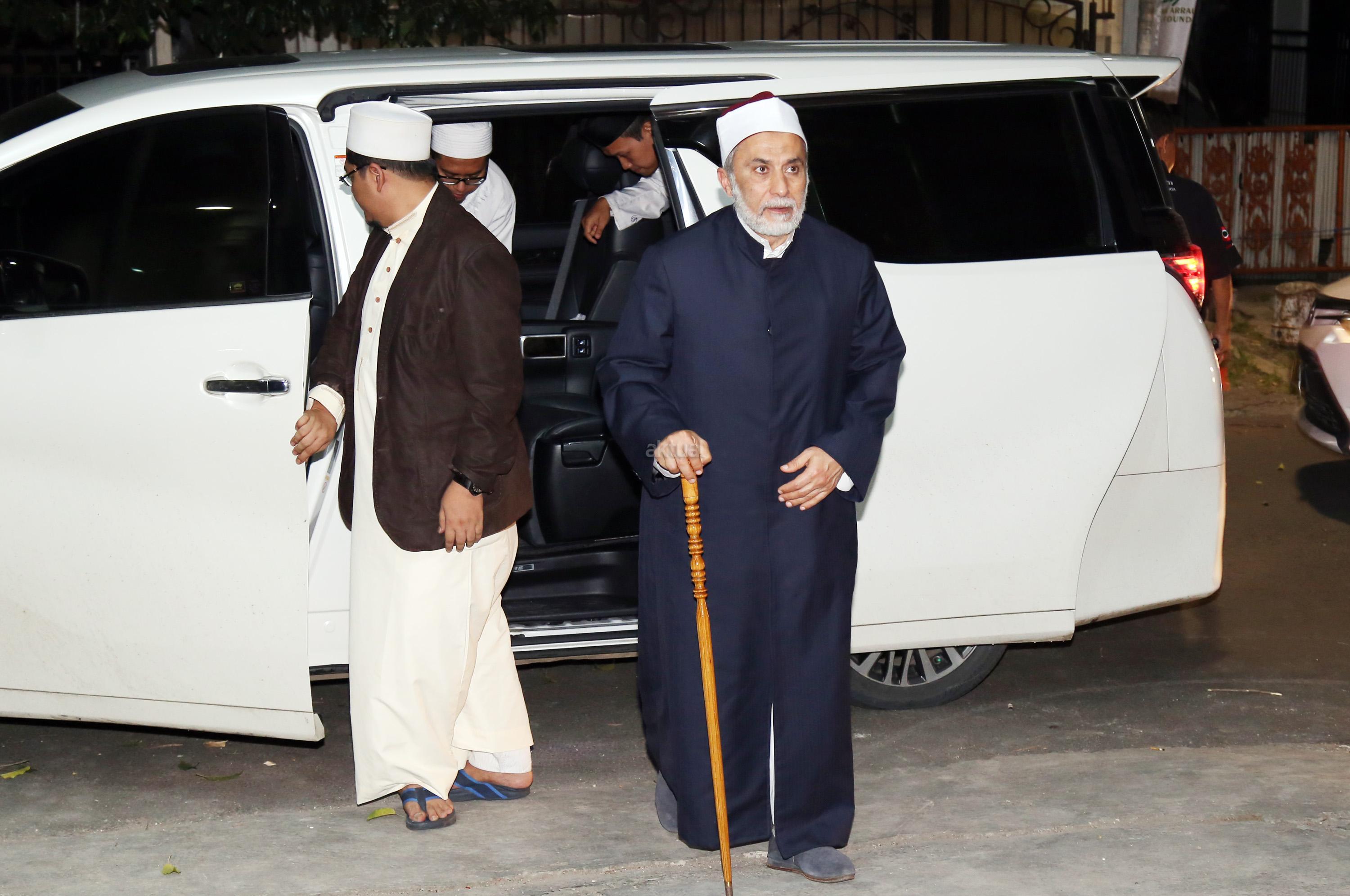 Maulana Syekh Yusri Rusydi Jabr Al Hasani didampingi Khodimu Zawiyah Arraudhah Ihsan Foundation, Al Akh Muhammad Danial Nafis turun dari kendaraan saat akan bersilaturahmi dengan volunteer acara Haflah Maulid 2017 di Zawiyah Arraudhah, Jalan Tebet Barat VIII, No 50, Jakarta Selatan, Rabu, (25/1/2017) malam. Arraudhah Ihsan Foundation menggelar kegiatan selama 2 hari Insya Allah akan dibacakan dan di khatamkan 2 kitab karya Syekh As Sayyid Abdullah bin Muhammad bin Shidiq Qs Al Ghumari al Hasani, Sabtu (28/1) hingga Minggu (29/1) bertempat di Zawiyah Arraudhah. AKTUAL/Tino Oktaviano