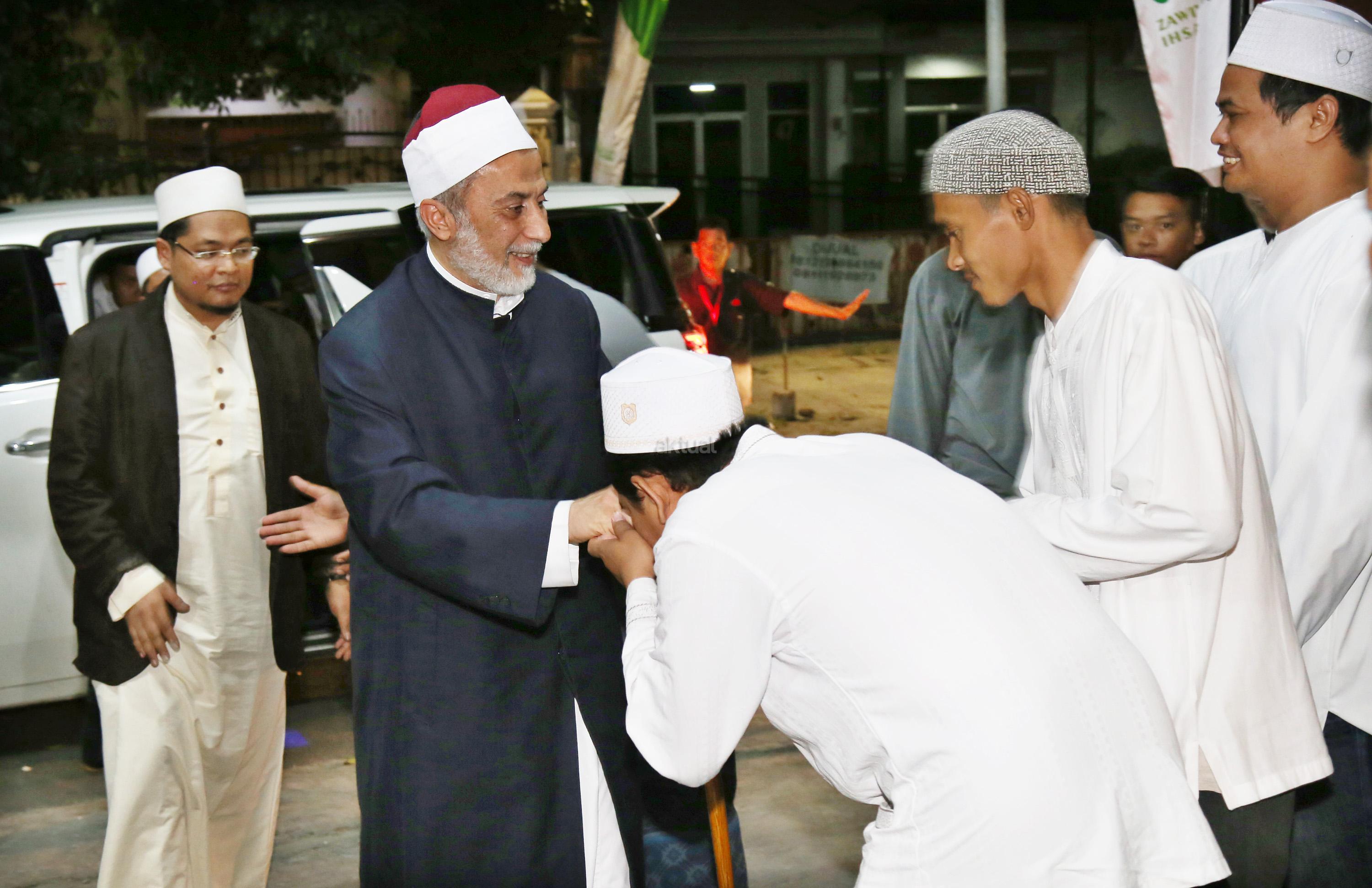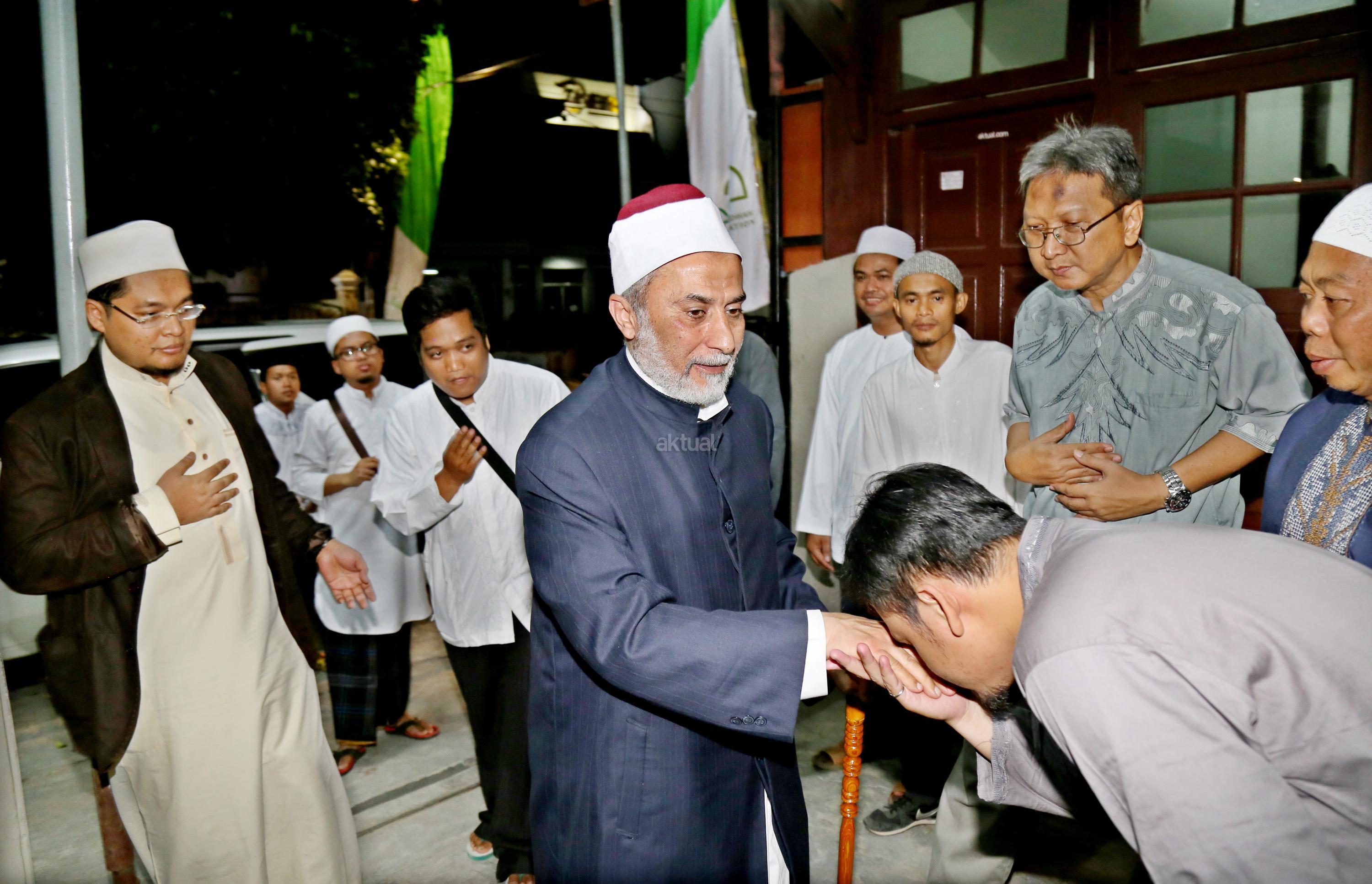 Maulana Syekh Yusri Rusydi Jabr Al Hasani saat akan bersilaturahmi dengan volunteer acara Haflah Maulid 2017 di Zawiyah Arraudhah, Jalan Tebet Barat VIII, No 50, Jakarta Selatan, Rabu, (25/1/2017) malam. Arraudhah Ihsan Foundation menggelar kegiatan selama 2 hari Insya Allah akan dibacakan dan di khatamkan 2 kitab karya Syekh As Sayyid Abdullah bin Muhammad bin Shidiq Qs Al Ghumari al Hasani, Sabtu (28/1) hingga Minggu (29/1) bertempat di Zawiyah Arraudhah. AKTUAL/Tino Oktaviano