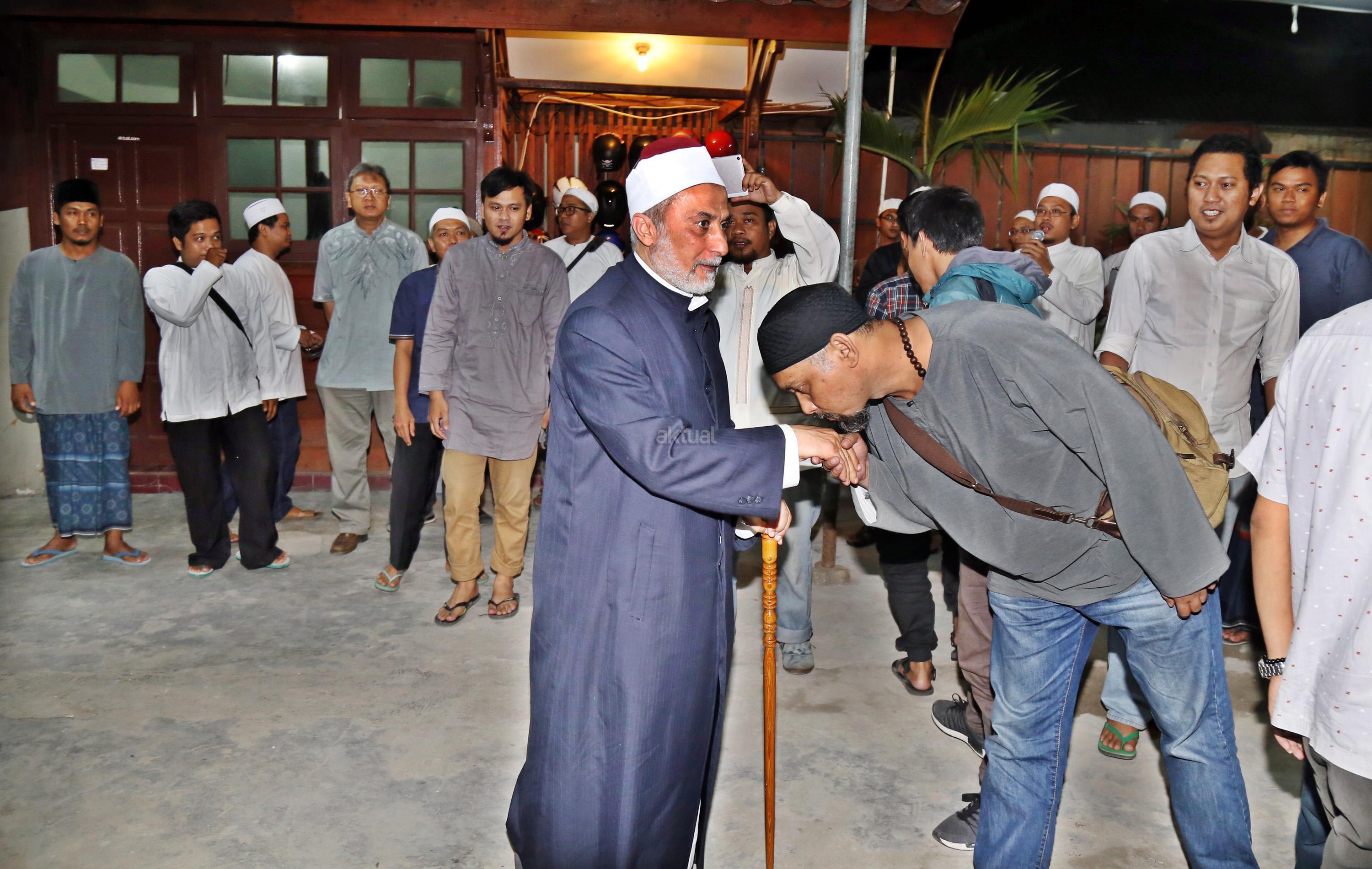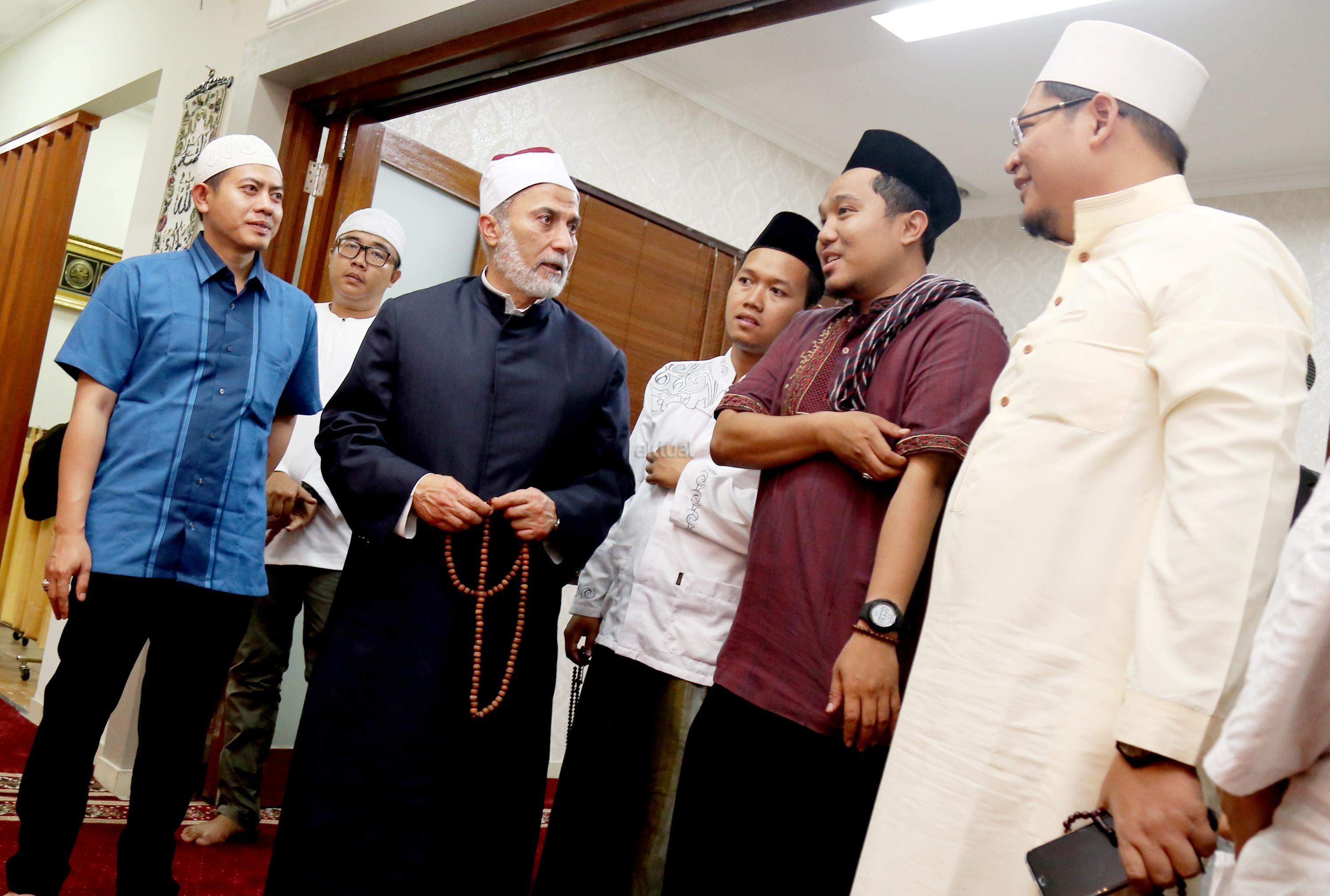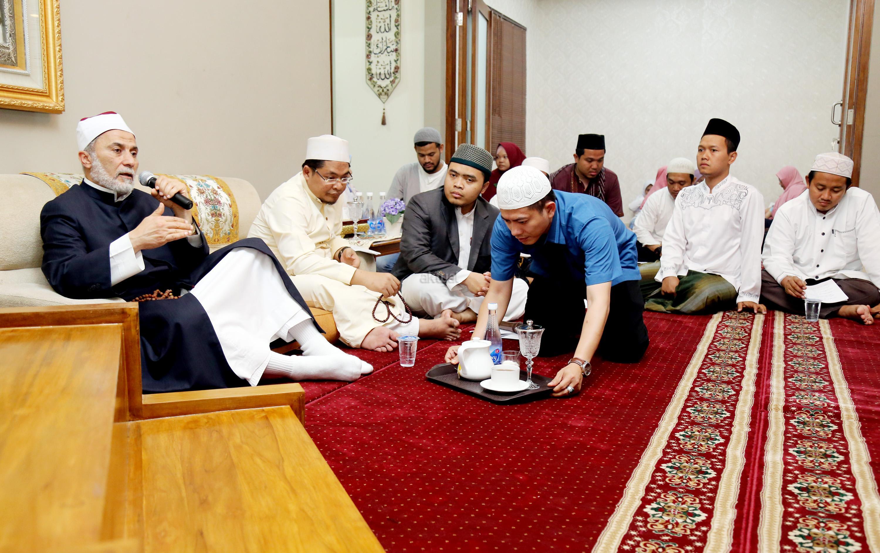 Maulana Syekh Yusri Rusydi Jabr Al Hasani didampingi Khodimu Zawiyah Arraudhah Ihsan Foundation, Al Akh Muhammad Danial Nafis saat bersilaturahmi dengan volunteer acara Haflah Maulid 2017 di Zawiyah Arraudhah, Jalan Tebet Barat VIII, No 50, Jakarta Selatan, Rabu, (25/1/2017) malam. Arraudhah Ihsan Foundation menggelar kegiatan selama 2 hari Insya Allah akan dibacakan dan di khatamkan 2 kitab karya Syekh As Sayyid Abdullah bin Muhammad bin Shidiq Qs Al Ghumari al Hasani, Sabtu (28/1) hingga Minggu (29/1) bertempat di Zawiyah Arraudhah. AKTUAL/Tino Oktaviano