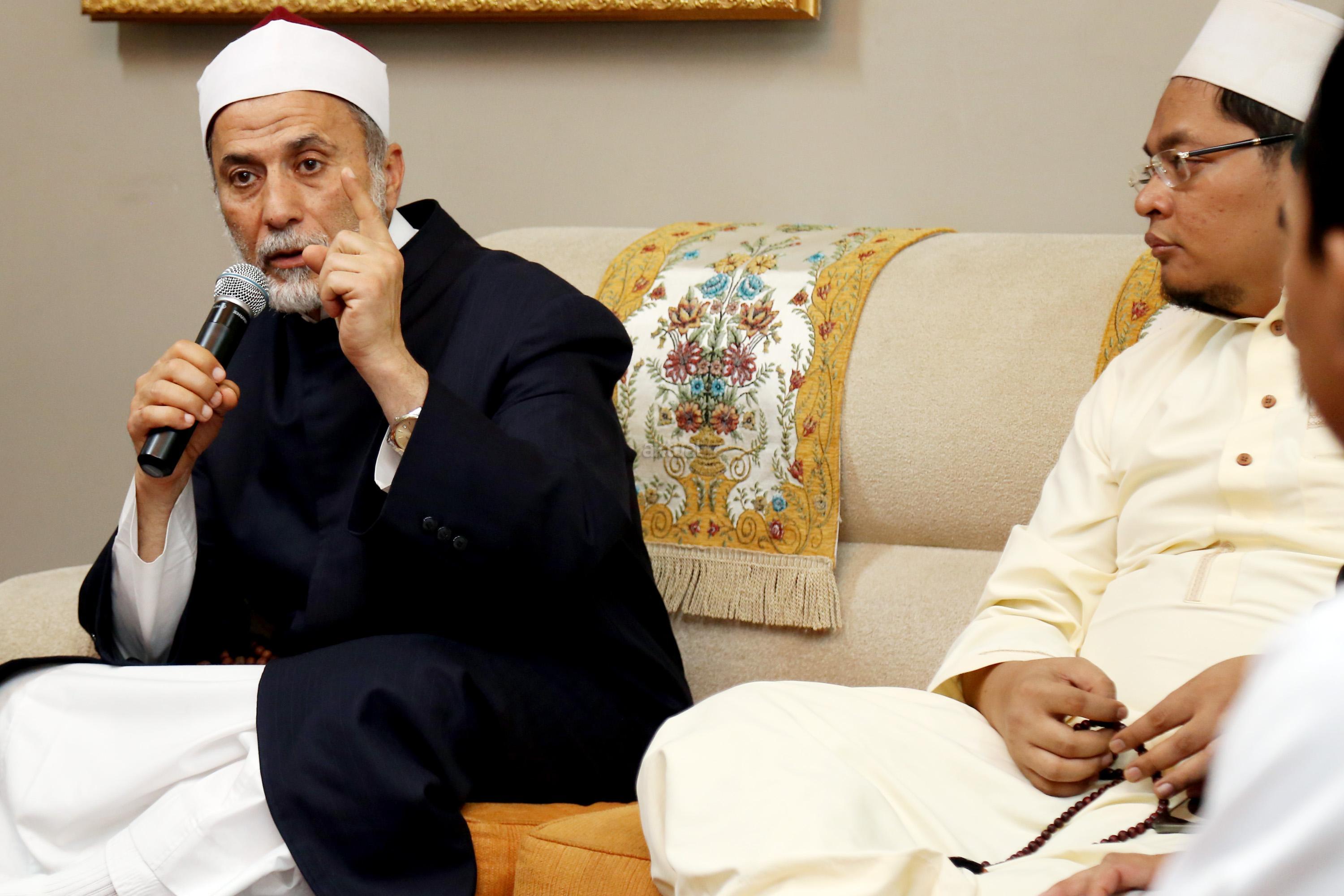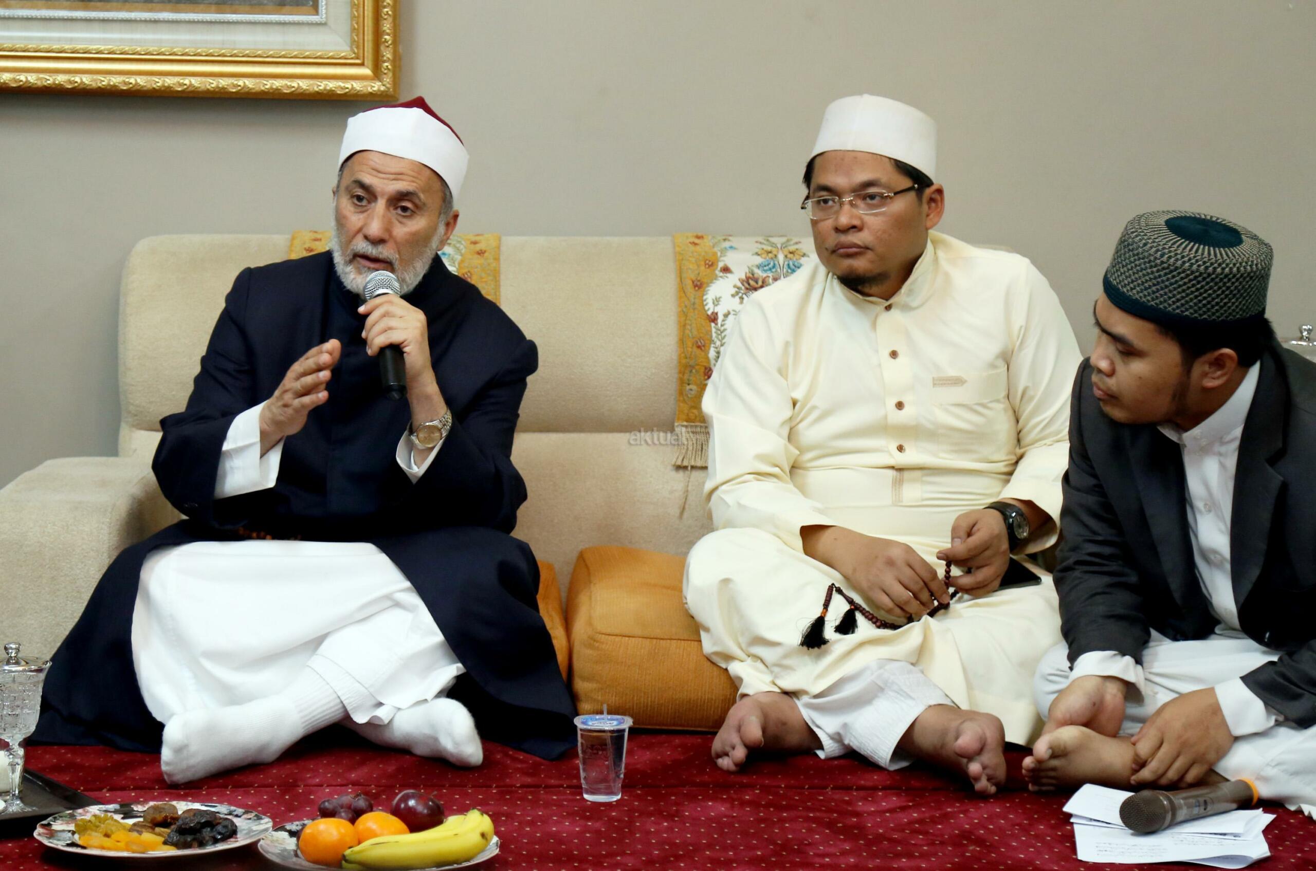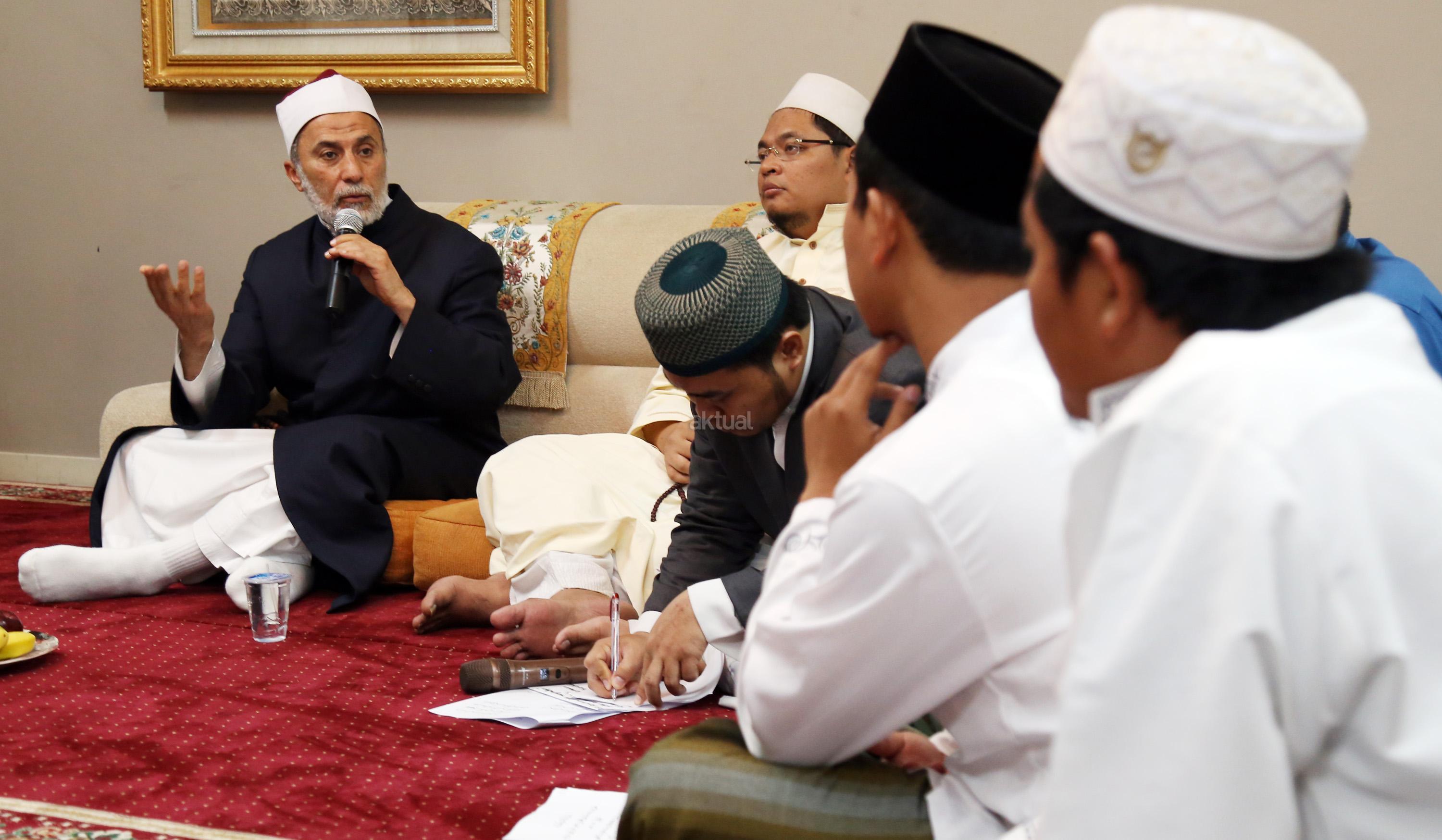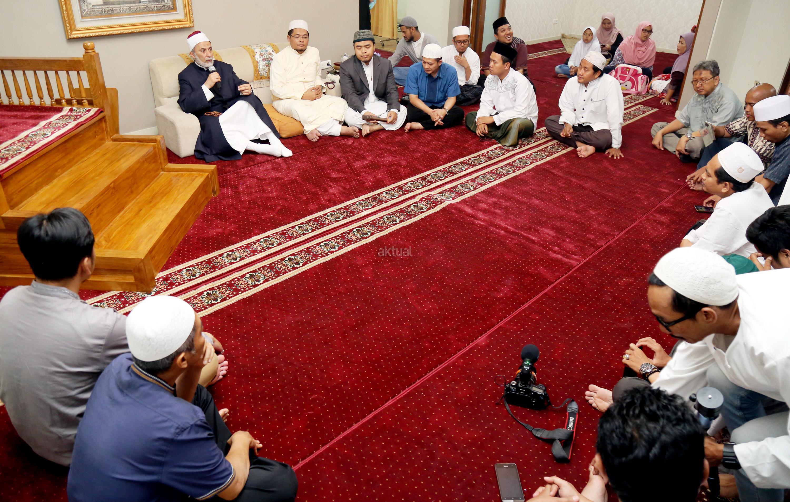 Maulana Syekh Yusri Rusydi Jabr Al Hasani didampingi Khodimu Zawiyah Arraudhah Ihsan Foundation, Al Akh Muhammad Danial Nafis saat bersilaturahmi dengan volunteer acara Haflah Maulid 2017 di Zawiyah Arraudhah, Jalan Tebet Barat VIII, No 50, Jakarta Selatan, Rabu, (25/1/2017) malam. Arraudhah Ihsan Foundation menggelar kegiatan selama 2 hari Insya Allah akan dibacakan dan di khatamkan 2 kitab karya Syekh As Sayyid Abdullah bin Muhammad bin Shidiq Qs Al Ghumari al Hasani, Sabtu (28/1) hingga Minggu (29/1) bertempat di Zawiyah Arraudhah. AKTUAL/Tino Oktaviano