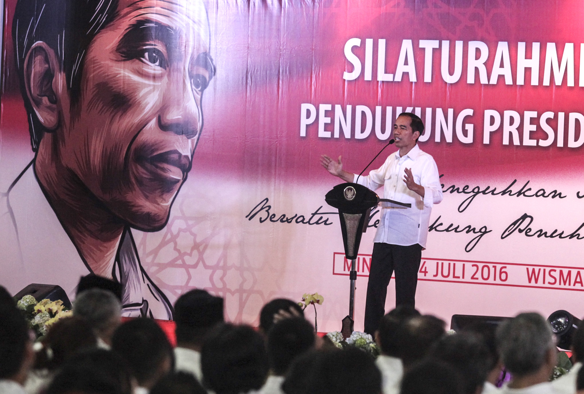 Presiden Joko Widodo memberikan sambutan pada acara Silaturahmi Nasional Pendukung Jokowi 2016 di Jakarta, Minggu (24/7). Acara yang diselenggarakan seluruh pendukung jokowi tersebut mengambil tema Meneguhkan Nawacita Bersatu Mendukung Penuh Kerja Presiden Rakyat. ANTARA FOTO/Muhammad Adimaja/nz/16