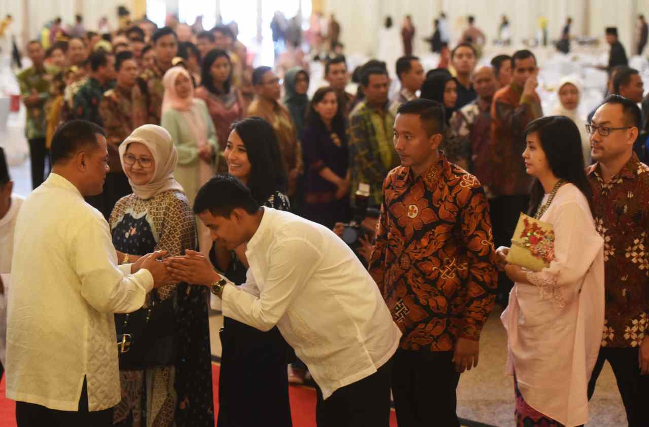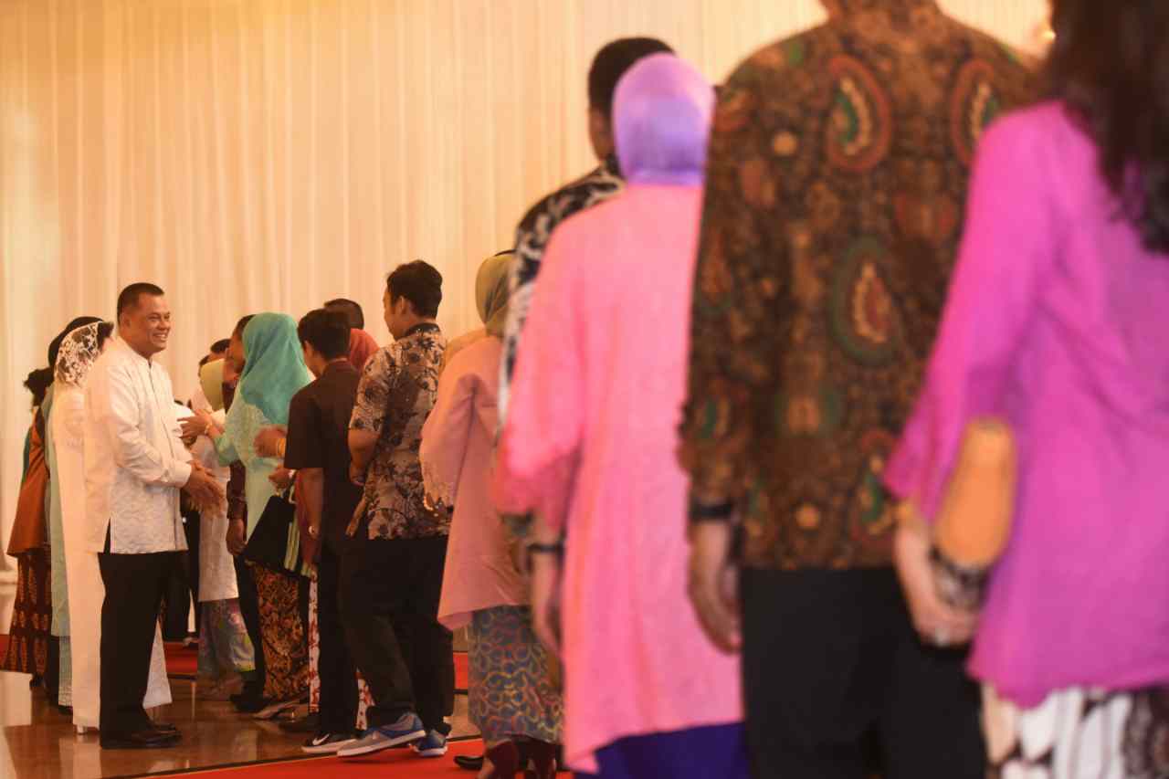 Panglima TNI Jenderal Gatot Nurmantyo (kiri) berjabat tangan dengan tamu undangan saat mengadakan halal bihalal di Jakarta, Rabu (6/7). Acara tersebut sekaligus merupakan ajang silaturahmi Panglima dengan jajarannya. ANTARA FOTO/Akbar Nugroho Gumay/foc/16.