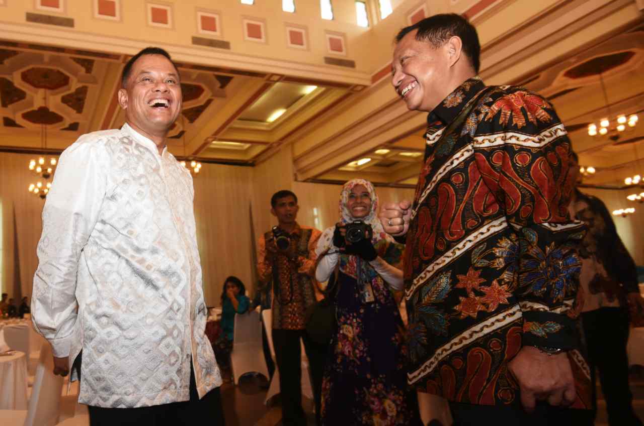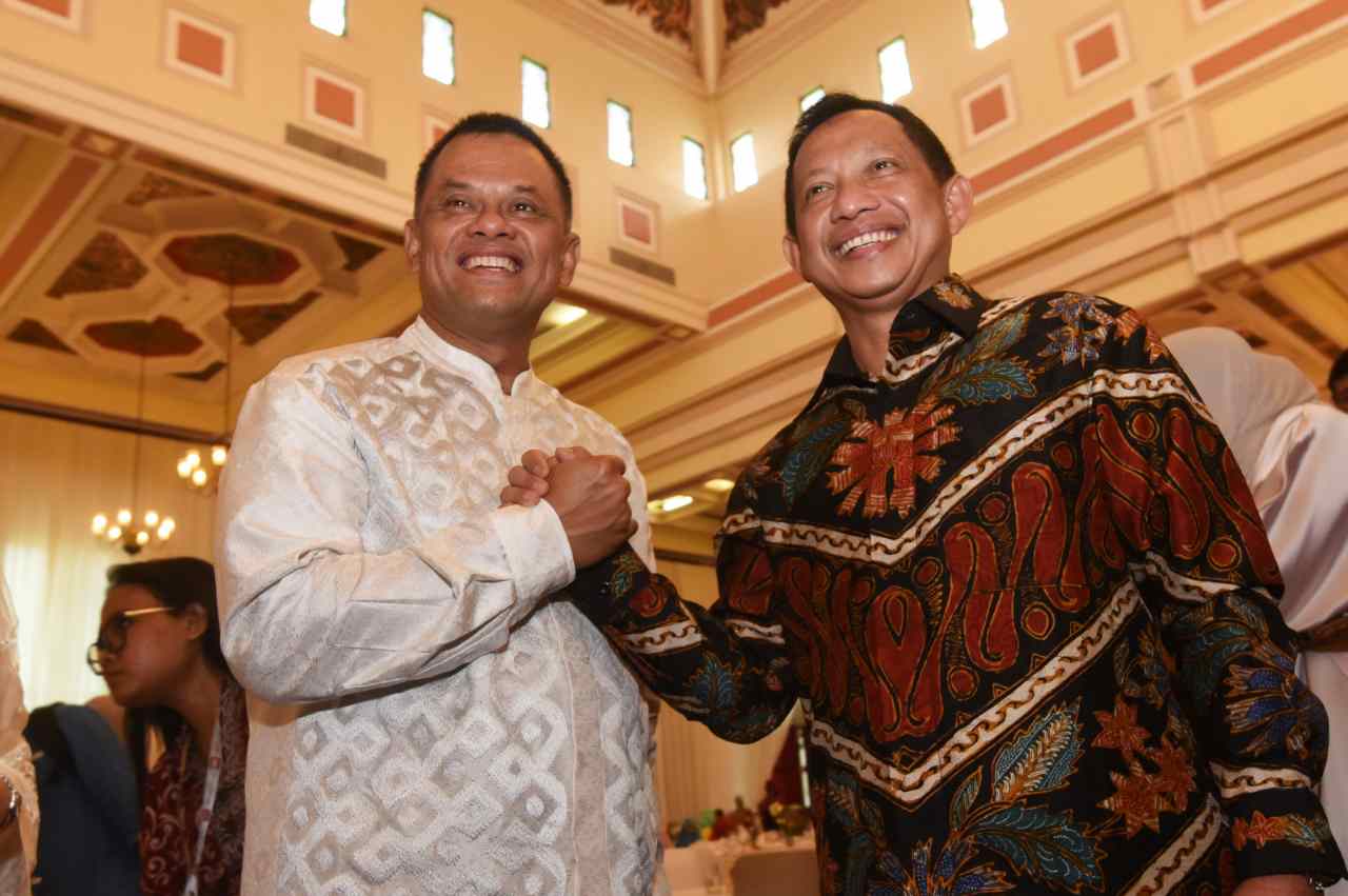 Panglima TNI Jenderal Gatot Nurmantyo (kiri) berbincang dengan Kepala BNPT Komjen Tito Karnavian saat mengadakan halal bihalal di Jakarta, Rabu (6/7). Acara tersebut sekaligus merupakan ajang silaturahmi Panglima dengan jajarannya. ANTARA FOTO/Akbar Nugroho Gumay/foc/16.