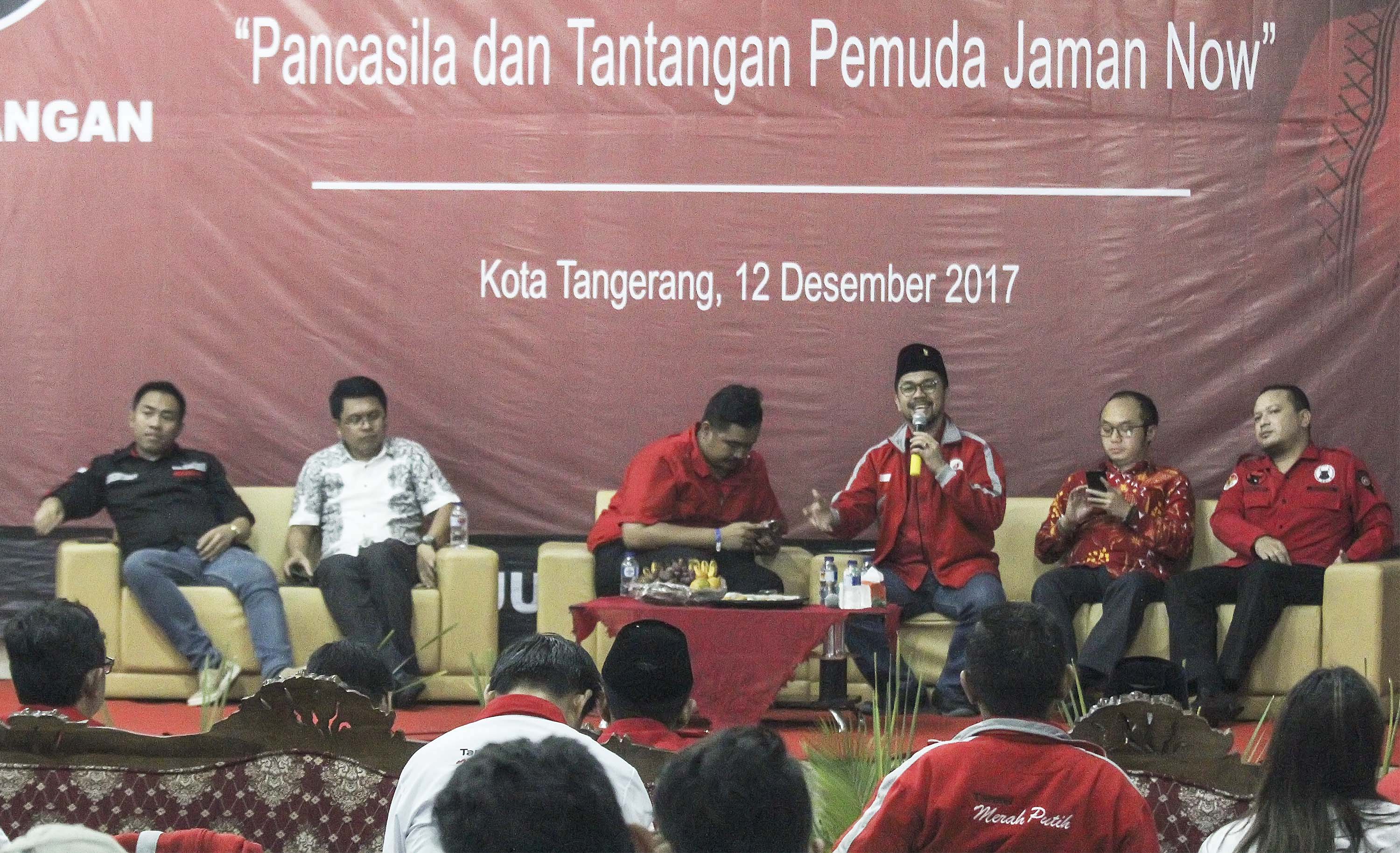 Sekretaris DPC PDIP Kota Tangerang Andri Permana (tengah), Ketua DPD Banten Taruna Merah Putih Marinus Gea (ketiga kanan), Pengamat Politik Yunarto Wijaya (kedua kanan), Ketua DPP Banteng Muda Indonesia (BMI) Banyu Biru (kanan), Penggiat sosial media Zuhairi Muswawi (kedua kiri), Sekjen DPN Relawan Perjuangan Demokrasi (Repdem) Wanto Sugito menjadi pembicara Simposium Pemuda dalam seminar bertema “Pancasila dan Tantangan Pemuda Zaman Now” di Kota Tangerang, Banten, Selasa (12/12/17). Simposium pemuda PDIP Kota Tangerang juga pengukuhan struktur pengurus sayap kepemudaan partai Taruna Merah Putih dan Repdem. AKTUAL/Stringer