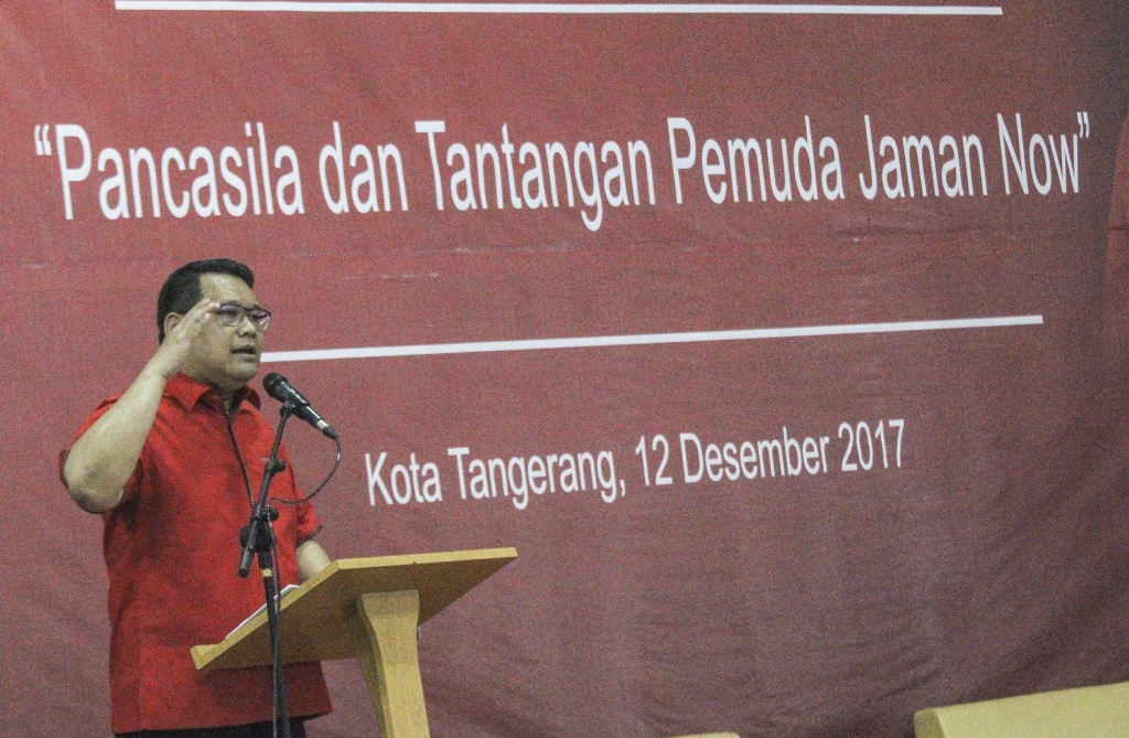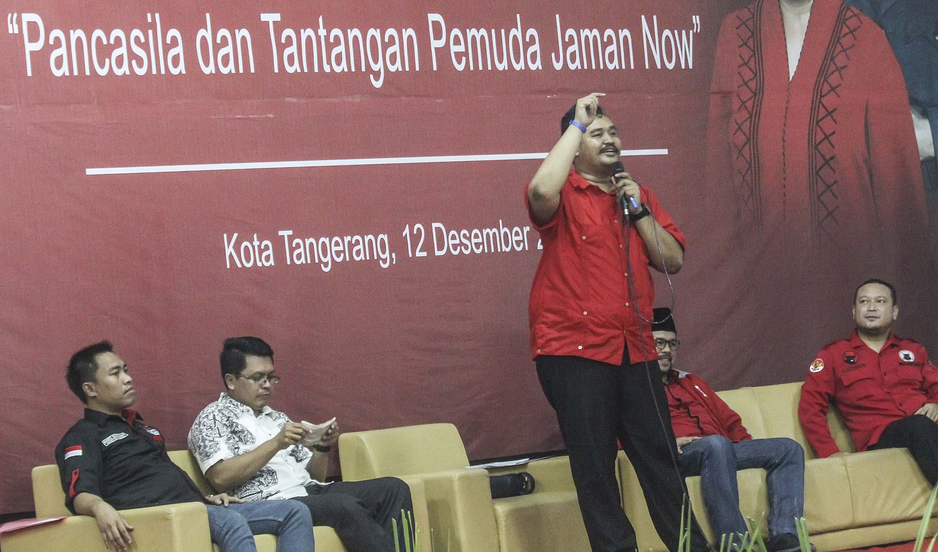 Ketua DPP PDI Perjuangan Eriko Sotarduga memberikan sambutan sebelum Sekretaris DPC PDIP Kota Tangerang Andri Permana (tengah), Ketua DPD Banten Taruna Merah Putih Marinus Gea (ketiga kanan), Pengamat Politik Yunarto Wijaya (kedua kanan), Ketua DPP Banteng Muda Indonesia (BMI) Banyu Biru (kanan), Penggiat sosial media Zuhairi Muswawi (kedua kiri), Sekjen DPN Relawan Perjuangan Demokrasi (Repdem) Wanto Sugito menjadi pembicara Simposium Pemuda dalam seminar bertema “Pancasila dan Tantangan Pemuda Zaman Now” di Kota Tangerang, Banten, Selasa (12/12/17). Simposium pemuda PDIP Kota Tangerang juga pengukuhan struktur pengurus sayap kepemudaan partai Taruna Merah Putih dan Repdem. AKTUAL/Stringer