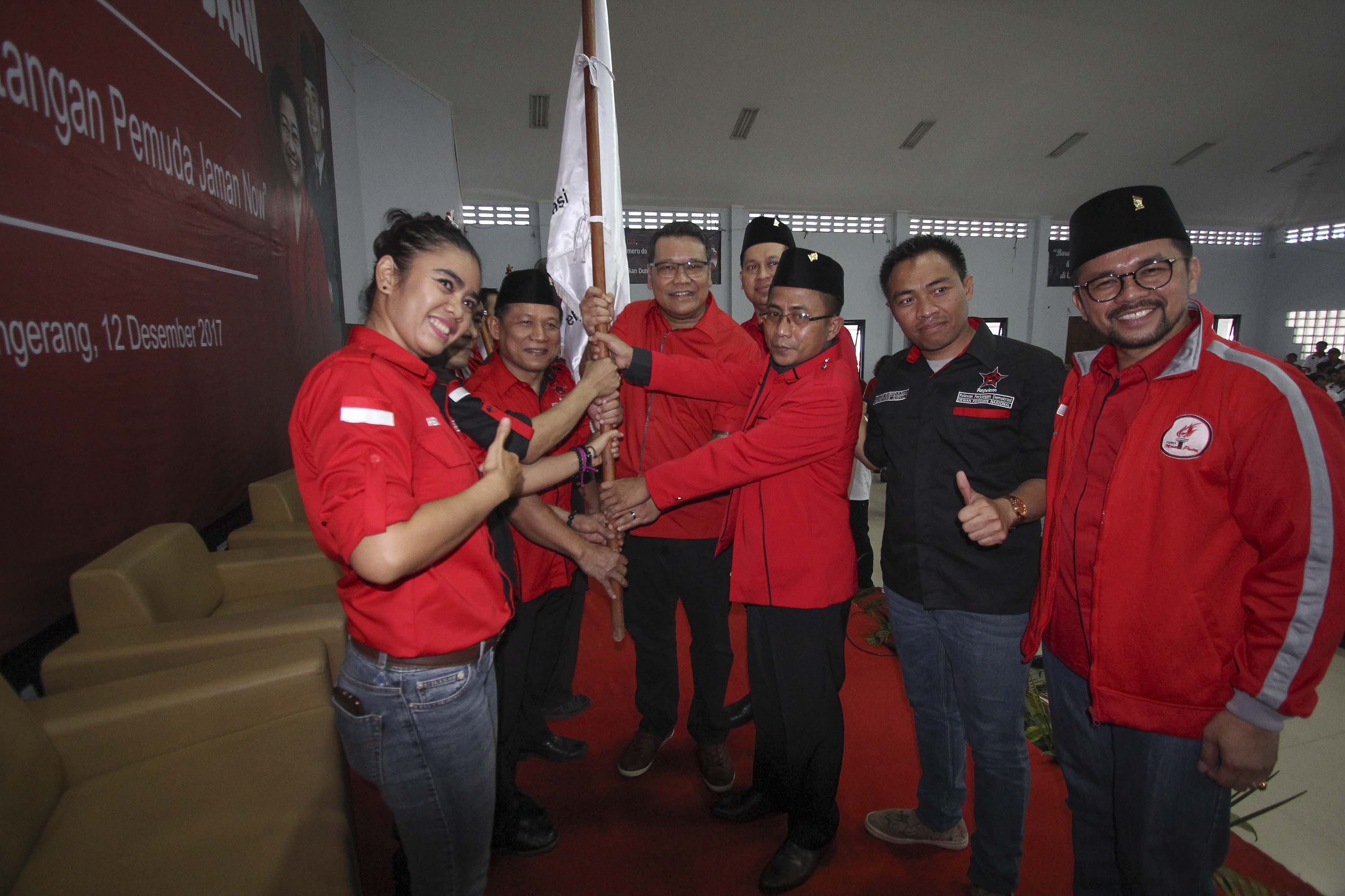 Ketua DPP PDI Perjuangan Eriko Sotarduga (tengah) bersama Ketua DPC PDI Perjuangan Kota Tangerang Gatot Wibowo (ketiga kanan) disaksikan Ketua DPD Banten Taruna Merah Putih Marinus Gea (kanan), dan Sekjen DPN Relawan Perjuangan Demokrasi (Repdem) Wanto Sugito (kedua kanan) memberikan bendera pataka dalam seminar bertema “Pancasila dan Tantangan Pemuda Zaman Now” di Kota Tangerang, Banten, Selasa (12/12/17). Simposium pemuda PDIP Kota Tangerang juga pengukuhan struktur pengurus sayap kepemudaan partai Taruna Merah Putih dan Repdem. AKTUAL/Stringer