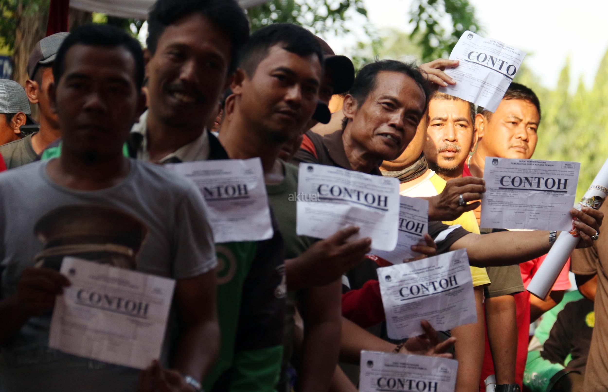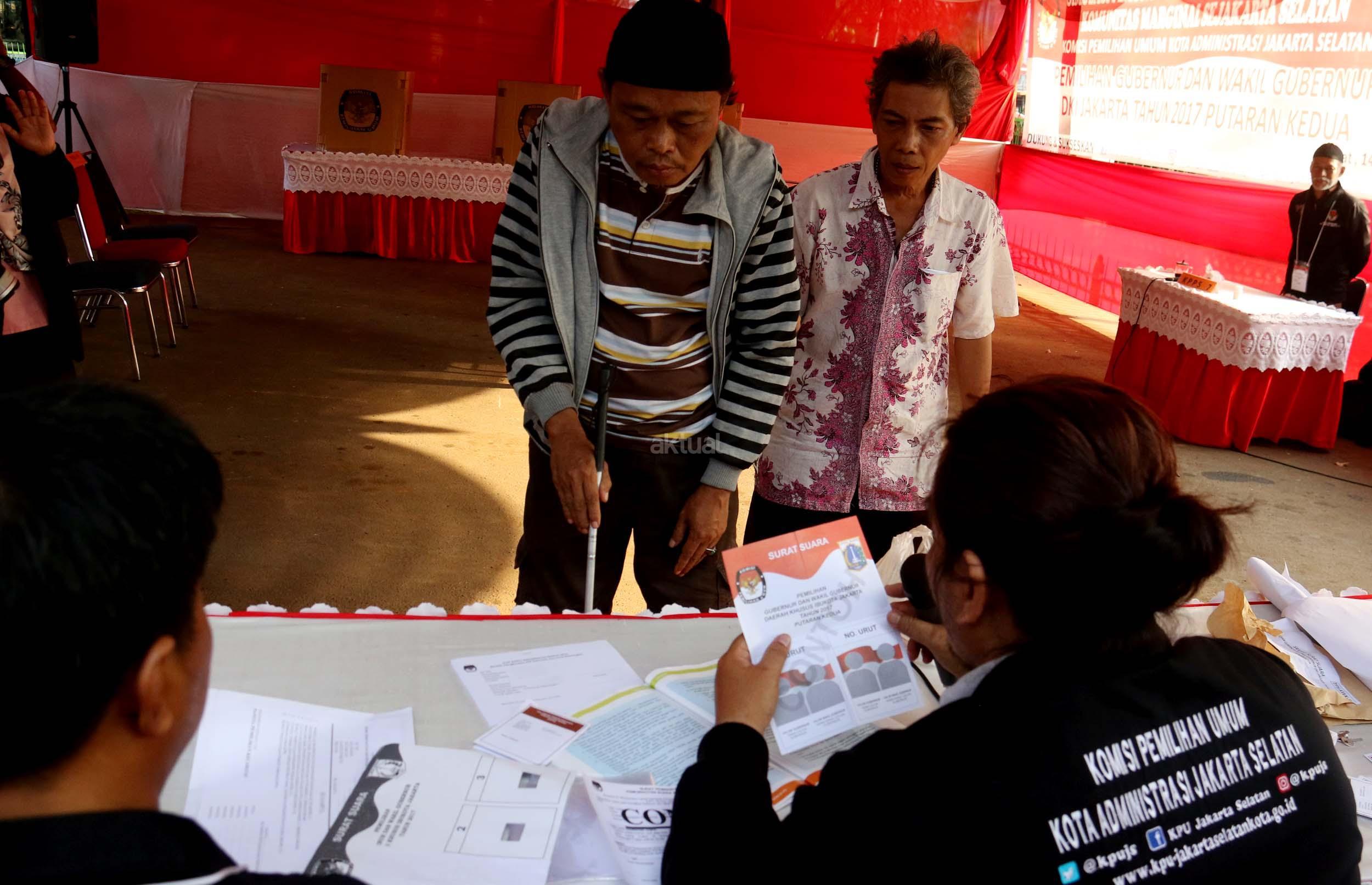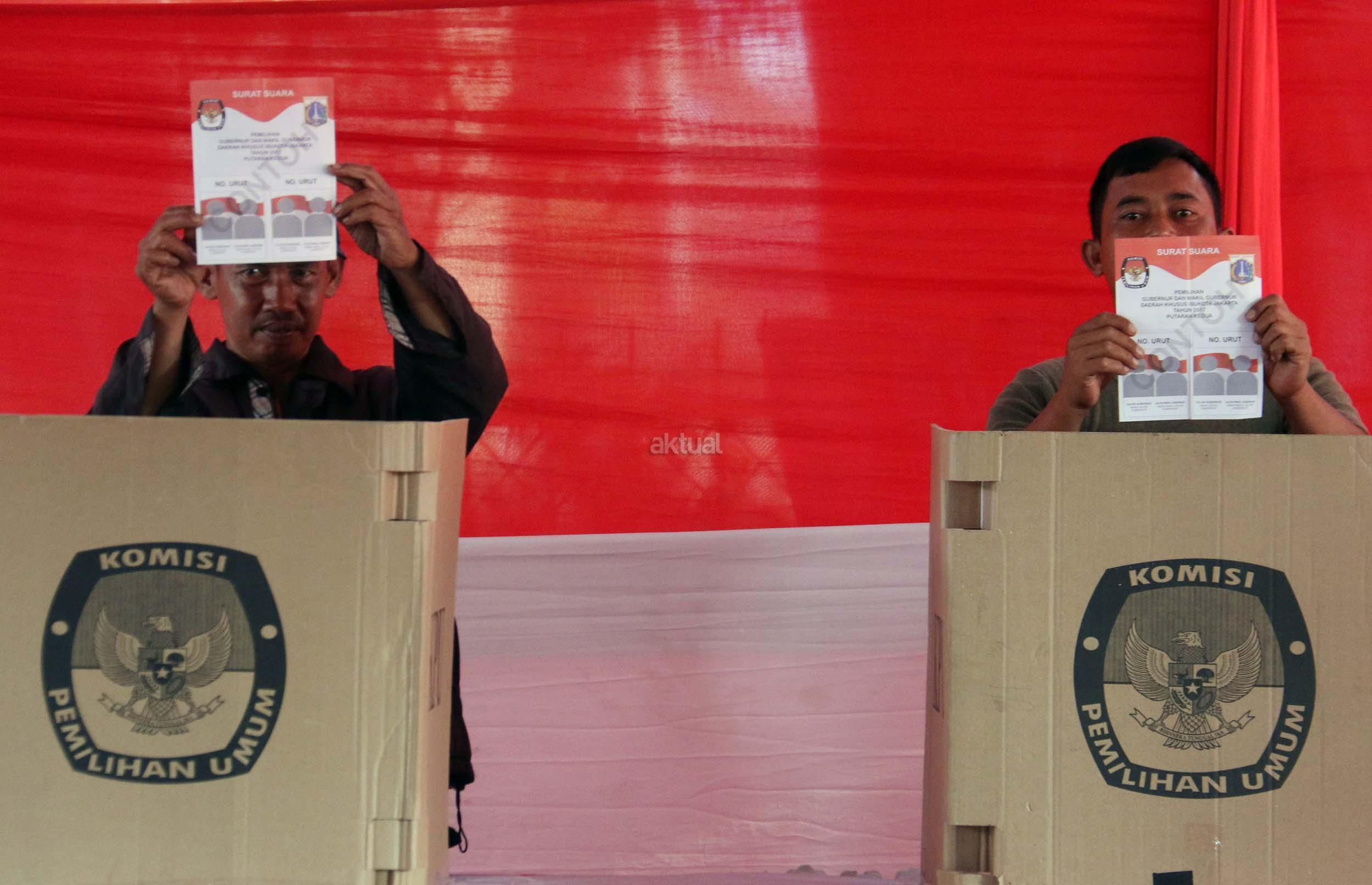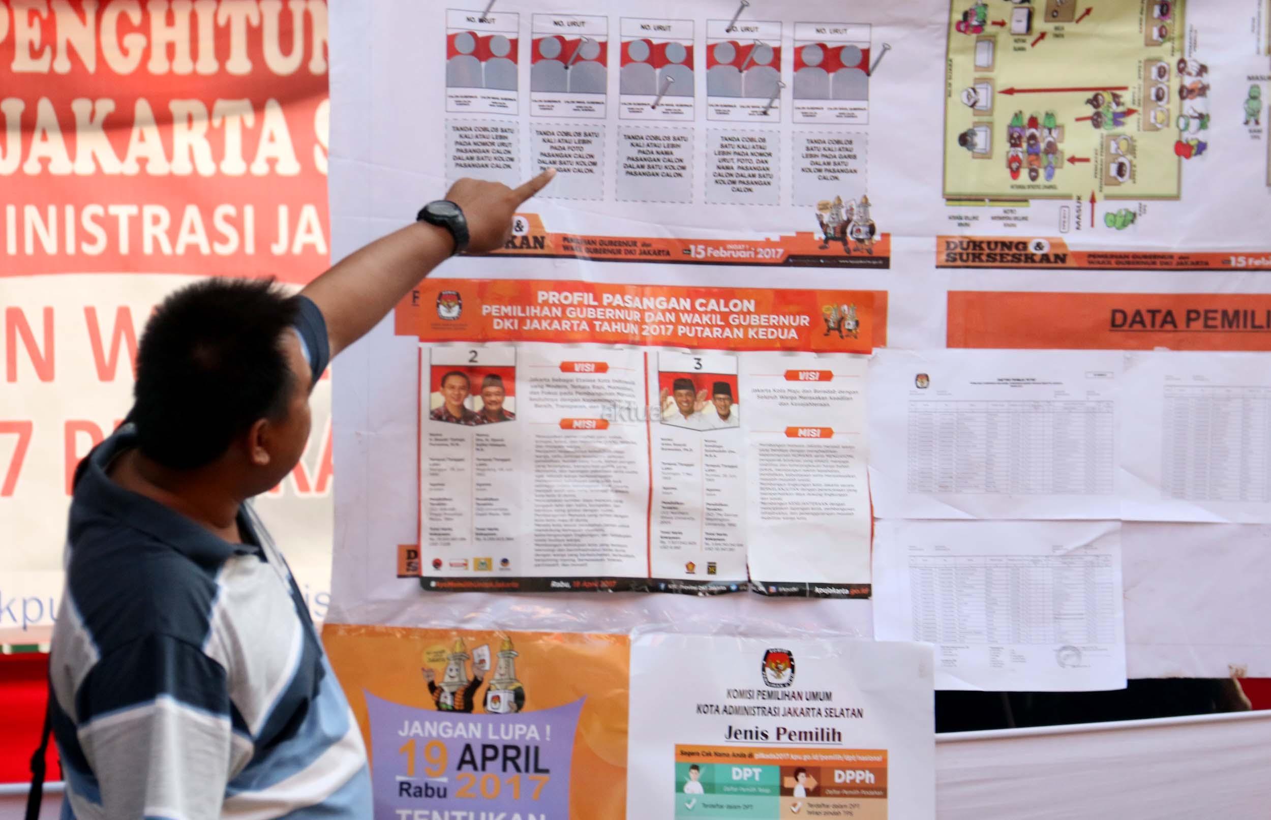 Sejumlah warga mengikuti simulasi Pilkada DKI Jakarta putaran kedua di Kelurahan Bukit Duri, Jakarta, Jumat (14/4/2017). Simulasi yang dilakukan KPU Kota Administrasi Jakarta Selatan tersebut bertujuan untuk memberikan informasi proses Pilkada putaran kedua secara langsung, sehingga warga tidak lagi kesulitan saat Pilkada putaran kedua dilaksanakan pada Rabu (19/4). AKTUAL/Munzir