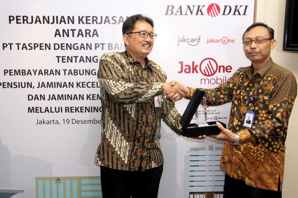 Direktur Bisnis PT Bank DKI, Antonius Widodo Mulyono (kiri) bersama Kepala Cabang Utama PT Taspen, Tawab (kanan) bertukan nota kesepahaman usai penandatanganan perjanjian kerjasama antara PT Bank DKI dan PT Taspen tentang Pembayaran Tabungan Hari Tua, Pensiun, Jaminan Kecelakaan Kerja, dan Jaminan Kematian di Jakarta, Selasa (19/12). Melalui rekening Bank DKI, para pensiunan Dapem memiliki berbagai manfaat menggunakan kartu ATM combo seperti akses layanan transjakarta gratis serta pengajuan fasilitas kredit multiguna bagi pensiunan. AKTUAL/Eko S Hilman