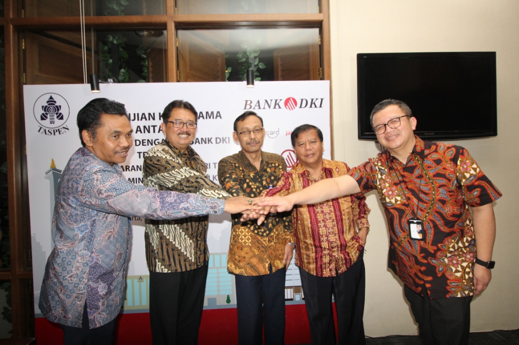 Direktur Bisnis PT Bank DKI, Antonius Widodo Mulyono (kedua kiri) bersama Kepala Cabang Utama PT Taspen, Tawab (tengah) bertimpu tangan usai melakukan penandatanganan perjanjian kerjasama antara PT Bank DKI dan PT Taspen tentang Pembayaran Tabungan Hari Tua, Pensiun, Jaminan Kecelakaan Kerja, dan Jaminan Kematian di Jakarta, Selasa (19/12). Melalui rekening Bank DKI, para pensiunan Dapem memiliki berbagai manfaat menggunakan kartu ATM combo seperti akses layanan transjakarta gratis serta pengajuan fasilitas kredit multiguna bagi pensiunan. AKTUAL/Eko S Hilman