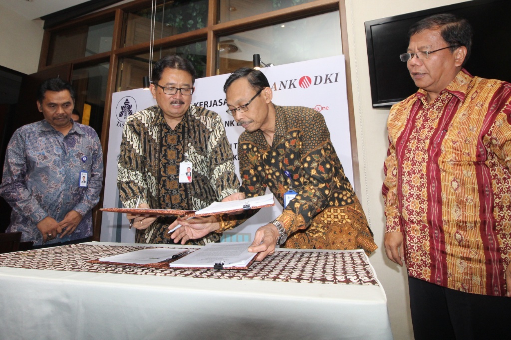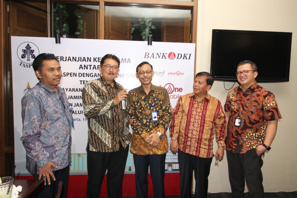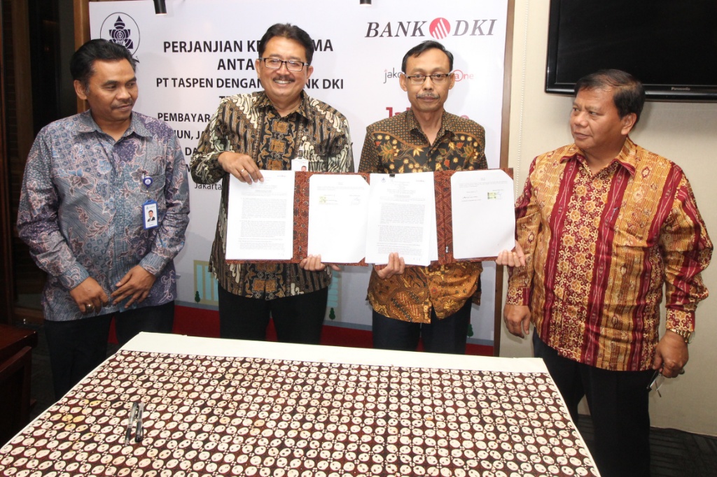 Direktur Bisnis PT Bank DKI, Antonius Widodo Mulyono (kedua kiri) bersama Kepala Cabang Utama PT Taspen, Tawab (kedua kanan) melakukan penandatanganan perjanjian kerjasama antara PT Bank DKI dan PT Taspen tentang Pembayaran Tabungan Hari Tua, Pensiun, Jaminan Kecelakaan Kerja, dan Jaminan Kematian di Jakarta, Selasa (19/12). Melalui rekening Bank DKI, para pensiunan Dapem memiliki berbagai manfaat menggunakan kartu ATM combo seperti akses layanan transjakarta gratis serta pengajuan fasilitas kredit multiguna bagi pensiunan. AKTUAL/Eko S Hilman