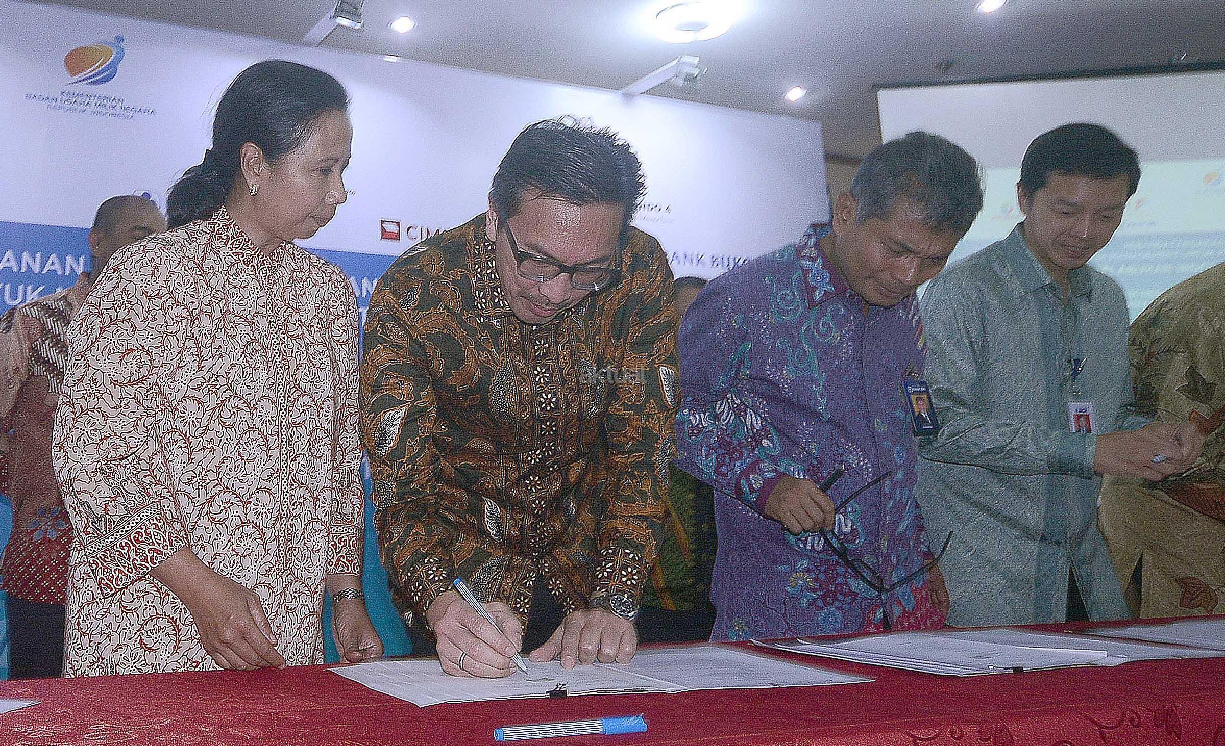 (dari kiri ke kanan) Menteri BUMN, Rini Sumarno, Presdir CIMB Niaga, Tigor M Siahaan,Wadirut BRI, Sunarso, dan Wadirut BCA, Armand W Hartono saat akan melakukan penandatangan nota kesepahaman tentang penyediaan dan pemanfaatan layanan cash management dalam rangka mendukung penerapan Integrated Billing System (IBS) di Kantor Kementrian BUMN,Jakarta, Selasa (29/11).MOu ini dilaksanakan dalam rangka sinergi BUMN maupun dengan bank bank swasta terkait penggunaan dan pengembangan jasa dan produk perbankan dalam rangka peningkatan pelayanan dan solusi kepada pengguna jasa kepelabuhan. AKTUAL/Eko S Hilman