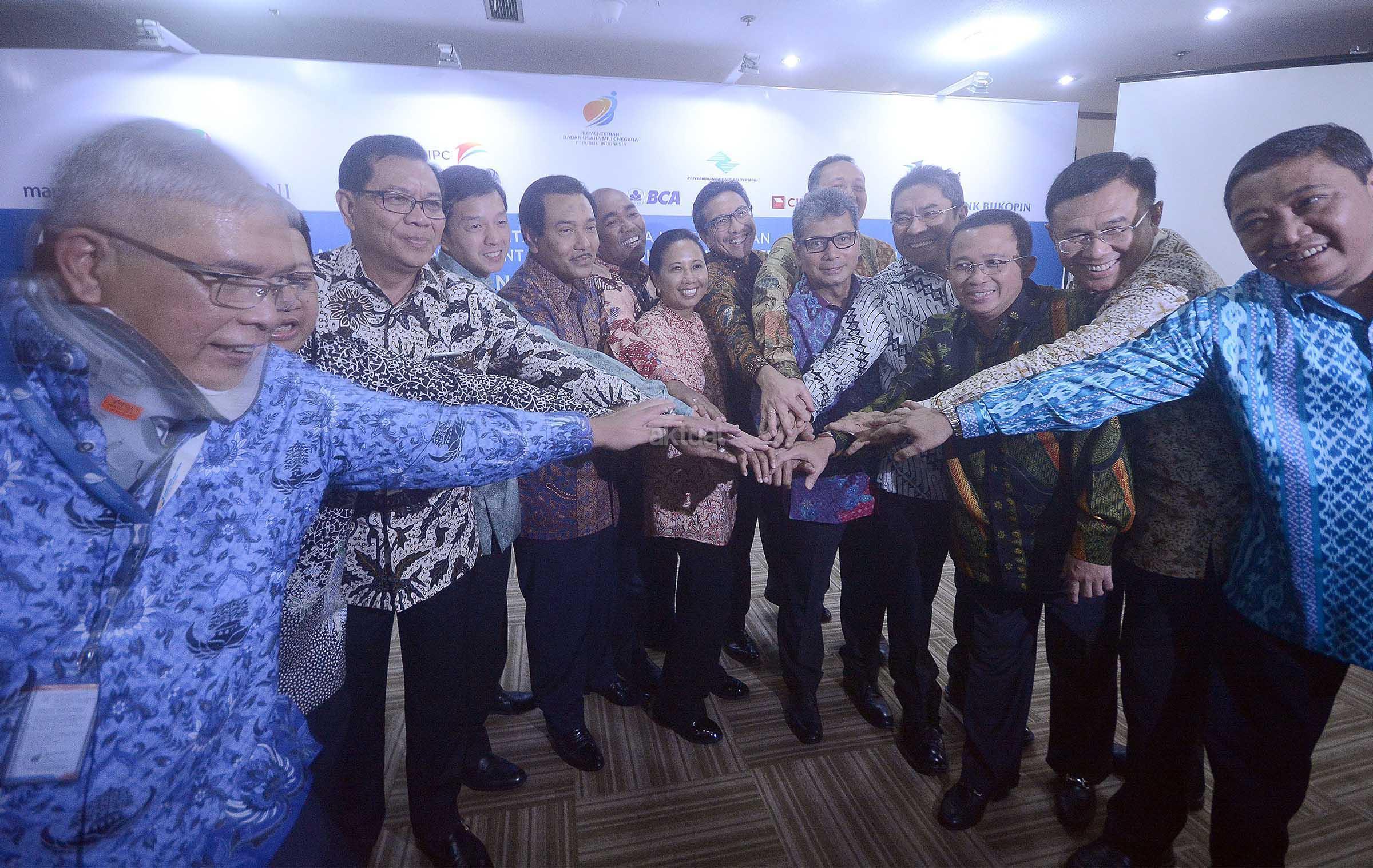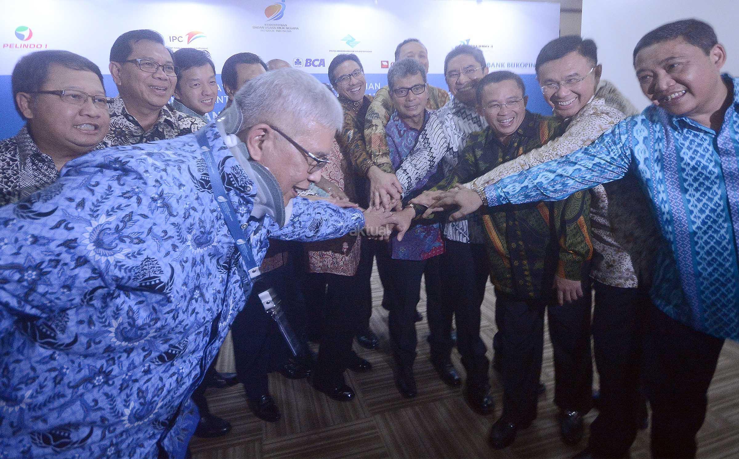 (dari kiri ke kanan) Deputi Bidang Usaha Konstruksi dan sarana prasarana perhubungan kementrian BUMN, Pontas Tambunan, Wadirut Bank Mandiri, Sulaiman A Arianto, Dirut BRI Asmawi Syam, Wadirut BCA, Armand W Hartono, Wadirut BNI, Suprajarto, Dirut Pelindo III, Orias Petrus Moedak, Menteri BUMN, Rini Sumarno, Presdir CIMB Niaga, Tigor M Siahaan, Dirut Bank Bukopin, Glen Glenardi, Wadirut BRI, Sunarso, Dirut Pelindo II, Elvyn G Massasya, Dirut Pelindo I, Bambang Eka Cahyana, dan Dirut BNI, Achmad Baiquni, serta Dirut Pelindo IV, Doso Agung saling bertumpu tangan seusai melakukan penandatangan nota kesepahaman tentang penyediaan dan pemanfaatan layanan cash management dalam rangka mendukung penerapan Integrated Billing System (IBS) di Kantor Kementrian BUMN,Jakarta, Selasa (29/11).MOu ini dilaksanakan dalam rangka sinergi BUMN maupun dengan bank bank swasta terkait penggunaan dan pengembangan jasa dan produk perbankan dalam rangka peningkatan pelayanan dan solusi kepada pengguna jasa kepelabuhan. AKTUAL/Eko S Hilman