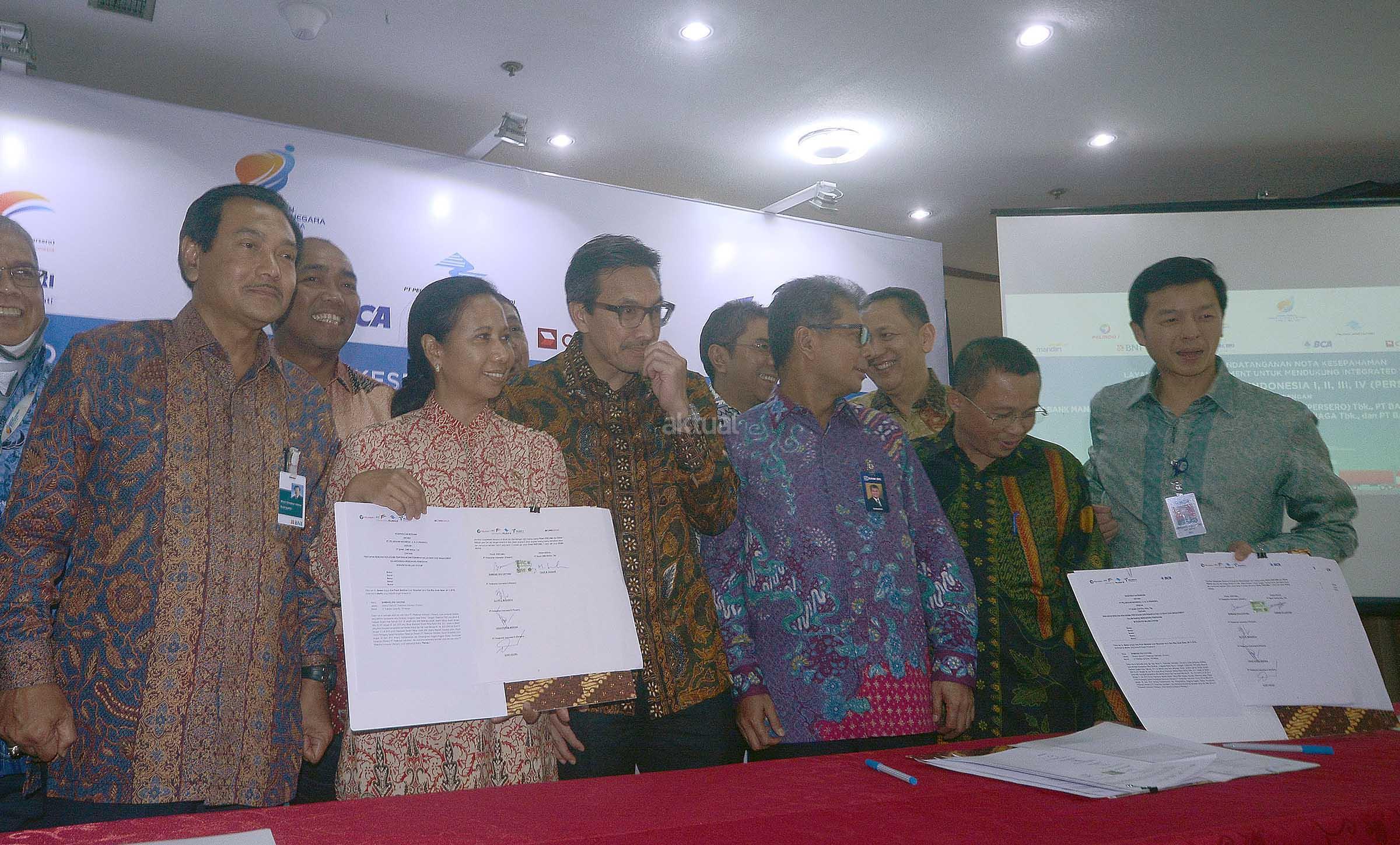 (dari kiri ke kanan) Wadirut BNI, Suprajarto, Dirut Pelindo III, Orias Petrus Moedak, Menteri BUMN, Rini Sumarno, Presdir CIMB Niaga, Tigor M Siahaan,Wadirut BRI, Sunarso, Dirut Pelindo II, Elvyn G Massasya, Dirut Pelindo I, Bambang Eka Cahyana, dan Wadirut BCA, Armand W Hartono seusai melakukan penandatangan nota kesepahaman tentang penyediaan dan pemanfaatan layanan cash management dalam rangka mendukung penerapan Integrated Billing System (IBS) di Kantor Kementrian BUMN,Jakarta, Selasa (29/11).MOu ini dilaksanakan dalam rangka sinergi BUMN maupun dengan bank bank swasta terkait penggunaan dan pengembangan jasa dan produk perbankan dalam rangka peningkatan pelayanan dan solusi kepada pengguna jasa kepelabuhan. AKTUAL/Eko S Hilman