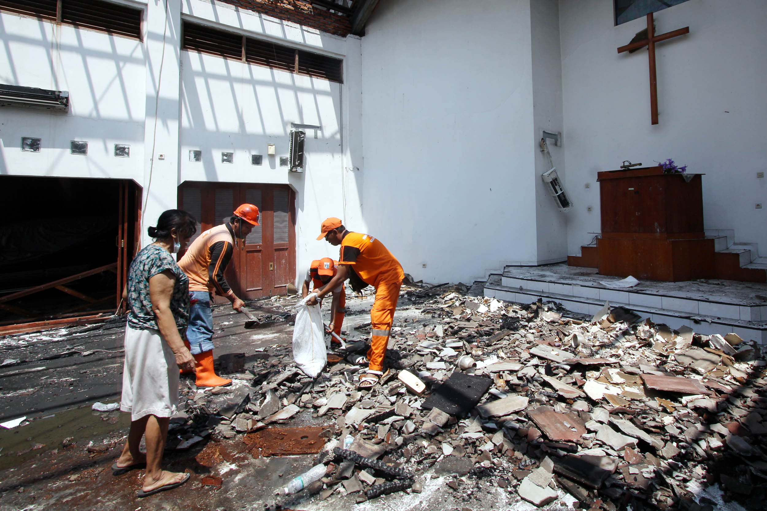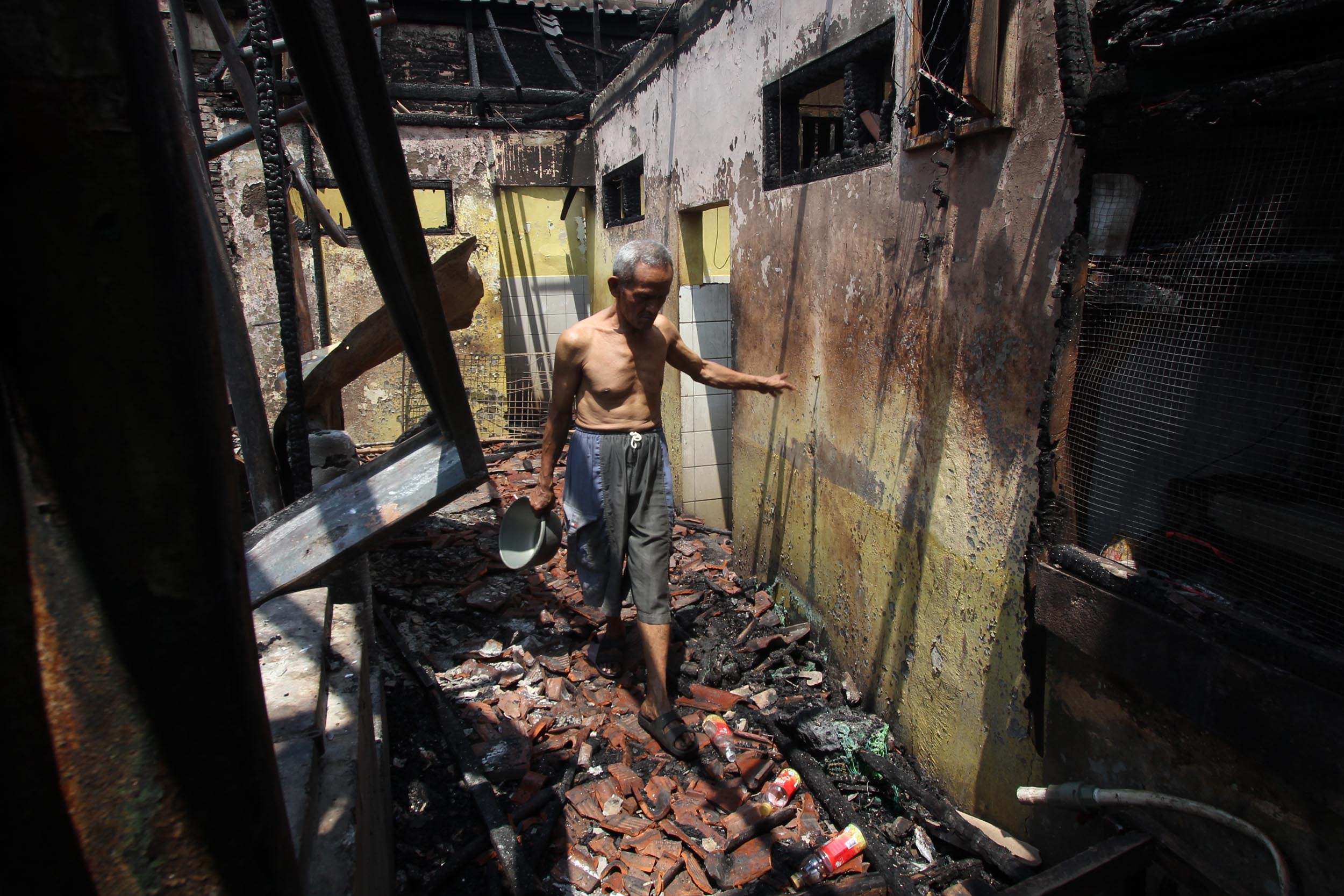 Petugas PPSU membersihkan puing puing bangunan hangus pascakebarakan yang melanda kawasan Pasar Gembrong Lama, di Galur, Johar Baru, Jakarta, Jumat (8/12). Kebakaran yang terjadi pada Jumat (8/12) dini hari itu menghanguskan kurang lebih 20 kios pasar dan satu gereja. AKTUAL/Tino Oktaviano