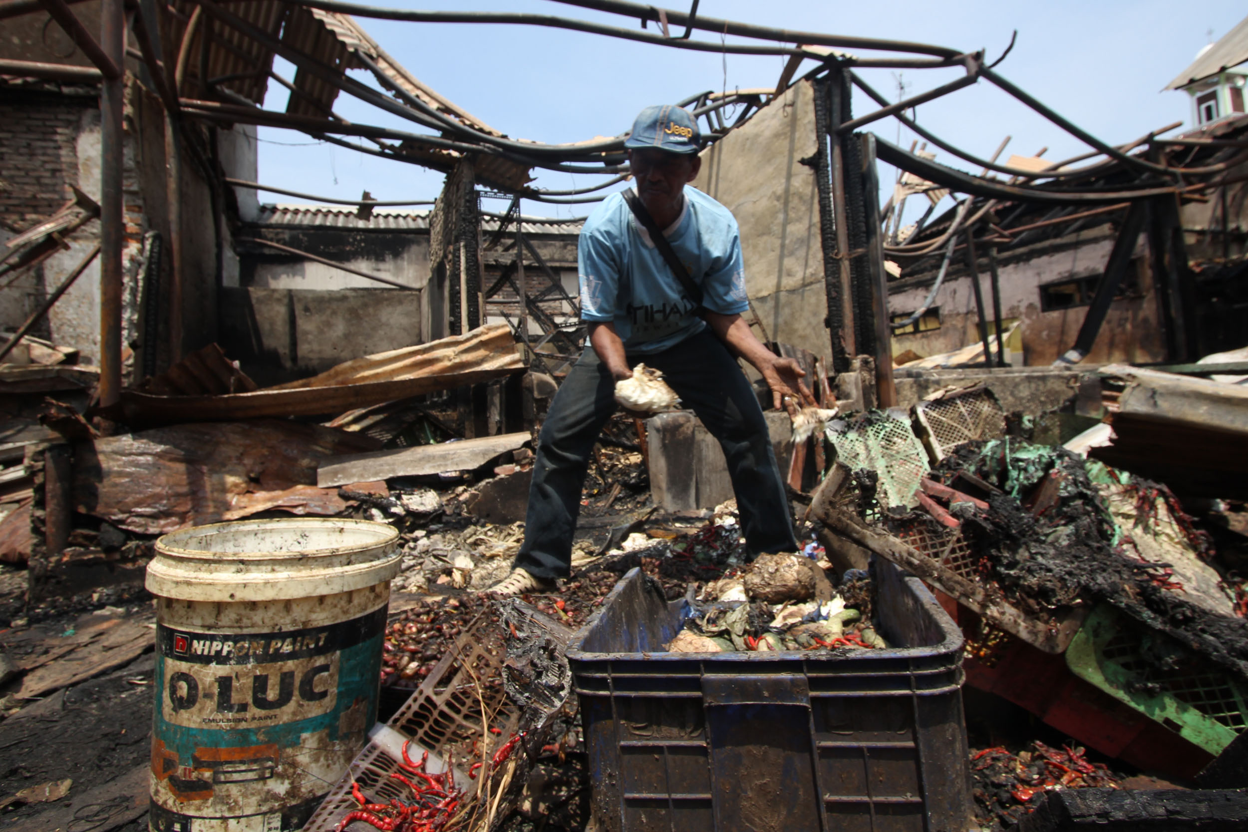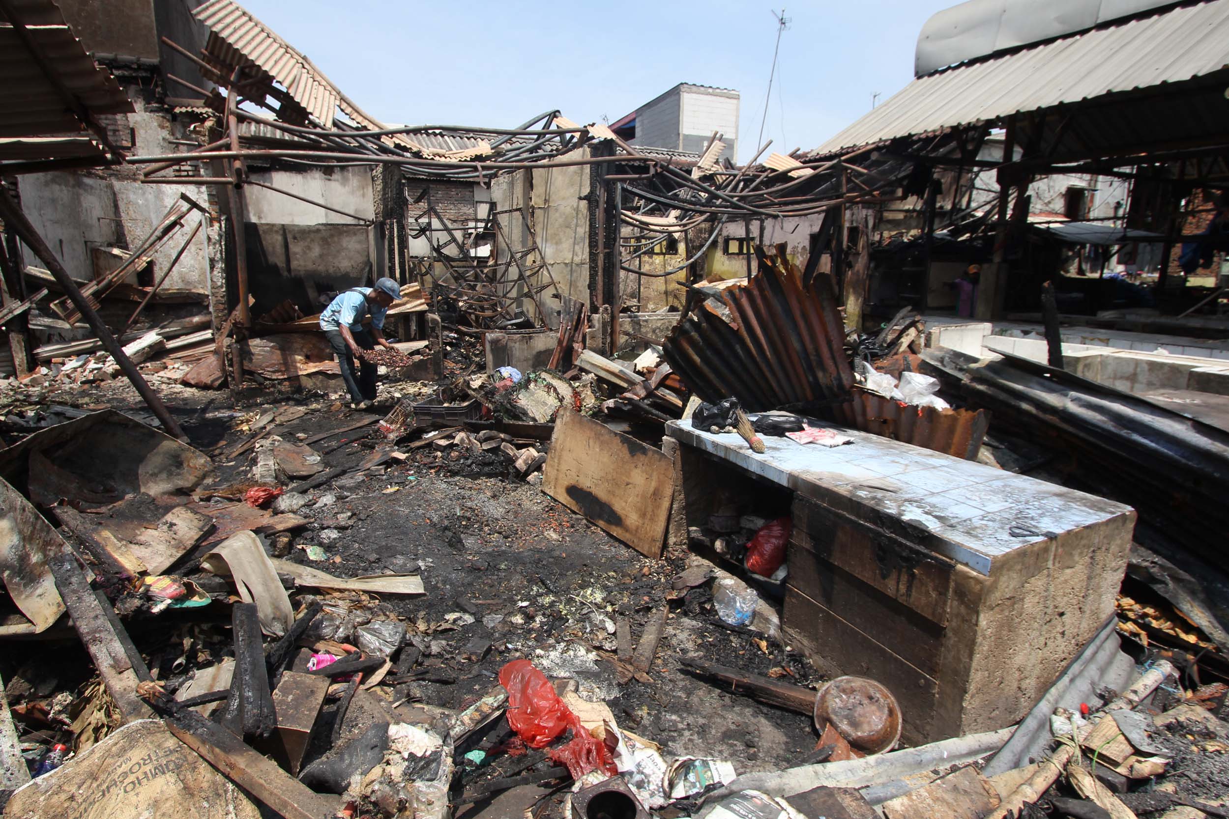 Warga berada di antara bangunan hangus pascakebarakan yang melanda Pasar Gembrong Lama, di Galur, Johar Baru, Jakarta, Jumat (8/12). Kebakaran yang terjadi pada Jumat (8/12) dini hari itu menghanguskan kurang lebih 20 kios pasar dan satu gereja. AKTUAL/Tino Oktaviano