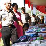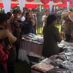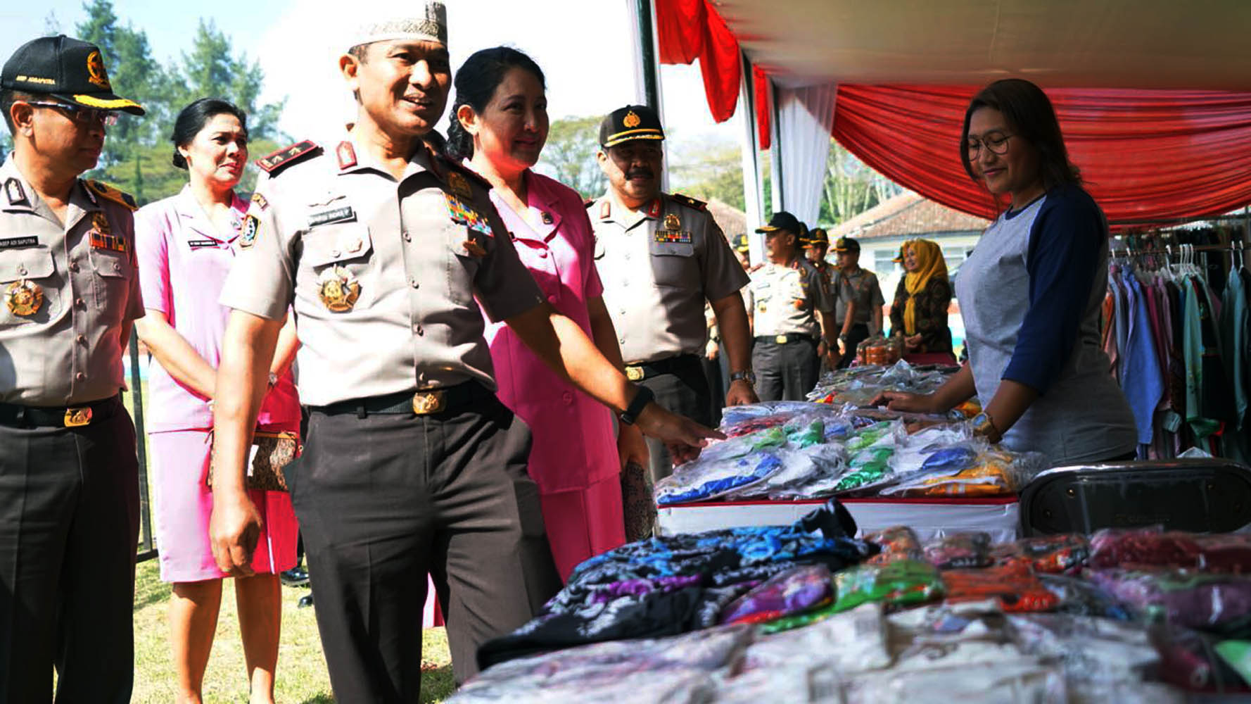 Kasespim Irjen Pol Wahyu Indra Pramugari didampingi Istri melihat produk saat digelarnya bazar murah di Asrama Unit Barat, Jawa Barat, Senin (4/6/2018). Dalam mengisi bulan suci Ramadhan, Sekolah Staf dan Pemimpin Tinggi Polri (Sespimti) menggelar bakti sosial, bazar murah dan paket lebaran yang diharapkan dapat membantu masyarakat, dan kegiatan ini bertujuan melatih peserta Sespimti angkatan 27 dan Sespimmen angkatan 48 untuk membangkitkan rasa kepedulian kepada masyarakat sekitar. AKTUAL/Tino Oktaviano