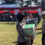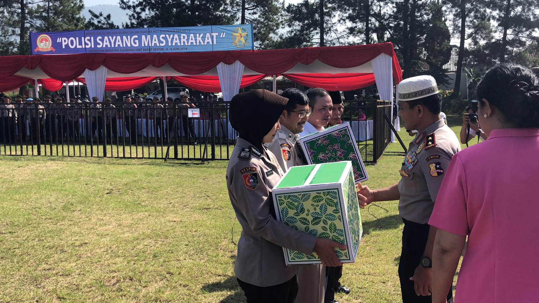 Kasespim Irjen Pol Wahyu Indra Pramugari memberikan paket lebaran kepada anggota saat digelarnya bazar murah di Asrama Unit Barat, Jawa Barat, Senin (4/6/2018). Dalam mengisi bulan suci Ramadhan, Sekolah Staf dan Pemimpin Tinggi Polri (Sespimti) menggelar bakti sosial, bazar murah dan paket lebaran yang diharapkan dapat membantu masyarakat, dan kegiatan ini bertujuan melatih peserta Sespimti angkatan 27 dan Sespimmen angkatan 48 untuk membangkitkan rasa kepedulian kepada masyarakat sekitar. AKTUAL/Tino Oktaviano