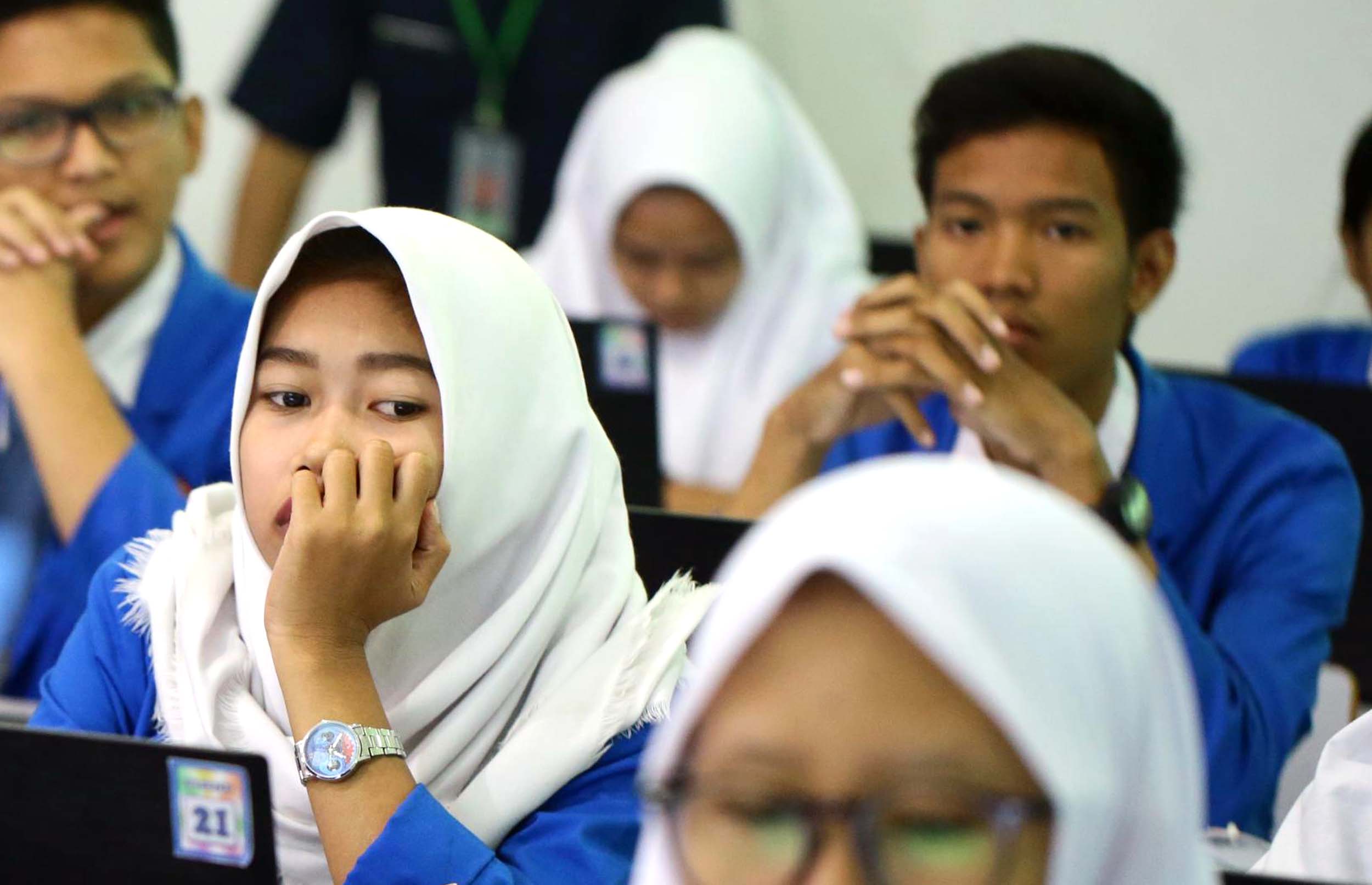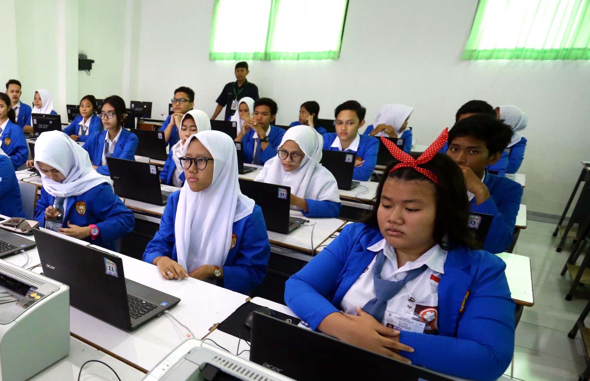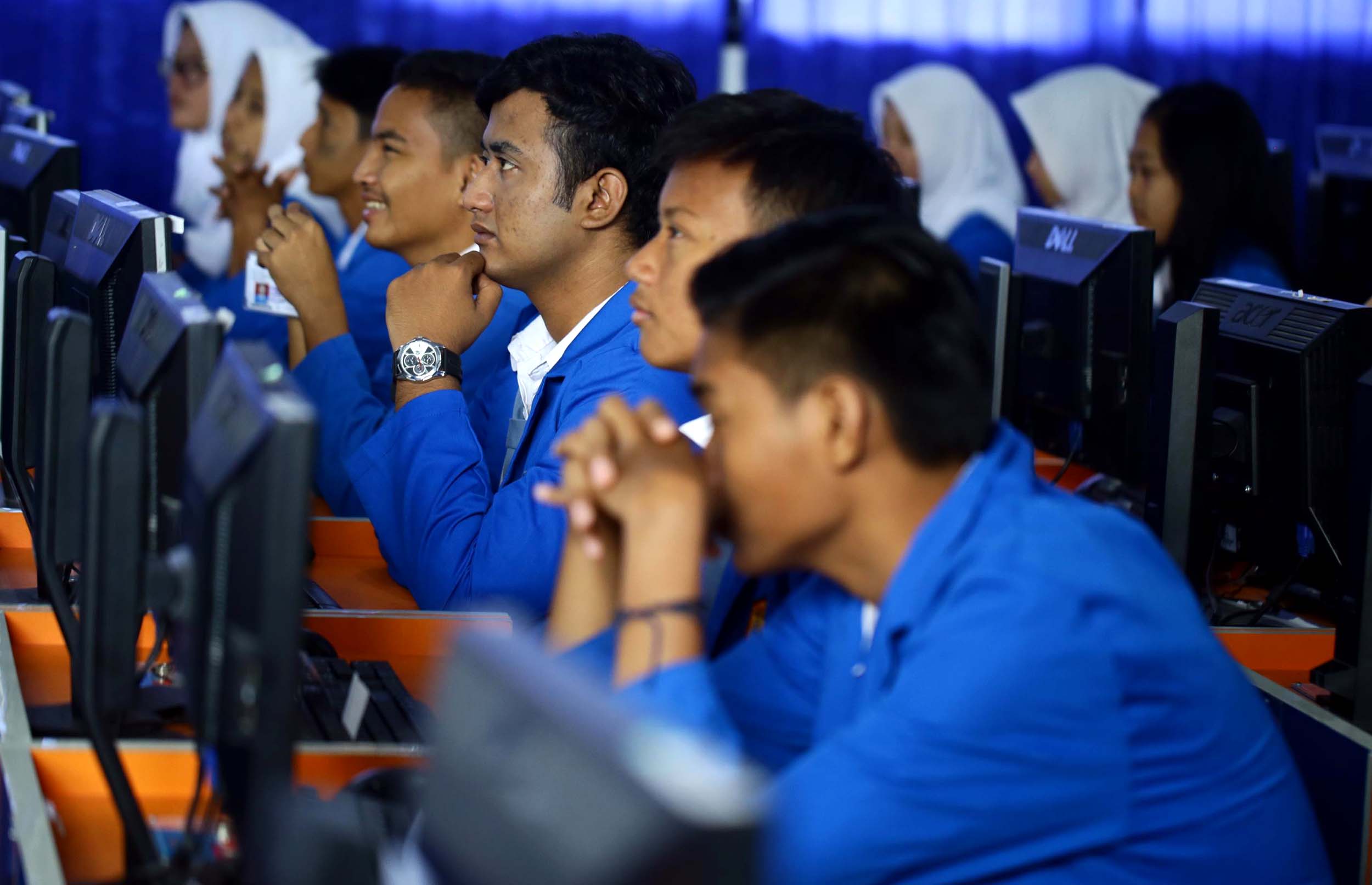 Sejumlah siswa di Sekolah Menengah Kejuruan (SMK) Jakarta Timur, nampak mengikuti Ujian Nasional Berbasis Komputer (UNBK), Senin (3/4/2017). Siswa SMK Jakarta Timur 1, mengikuti Ujian Nasional Berbasis Komputer (UNBK). UN tingkat SMA sederajat dilaksanakan hari ini hingga 6 April 2017. AKTUAL/Munzir