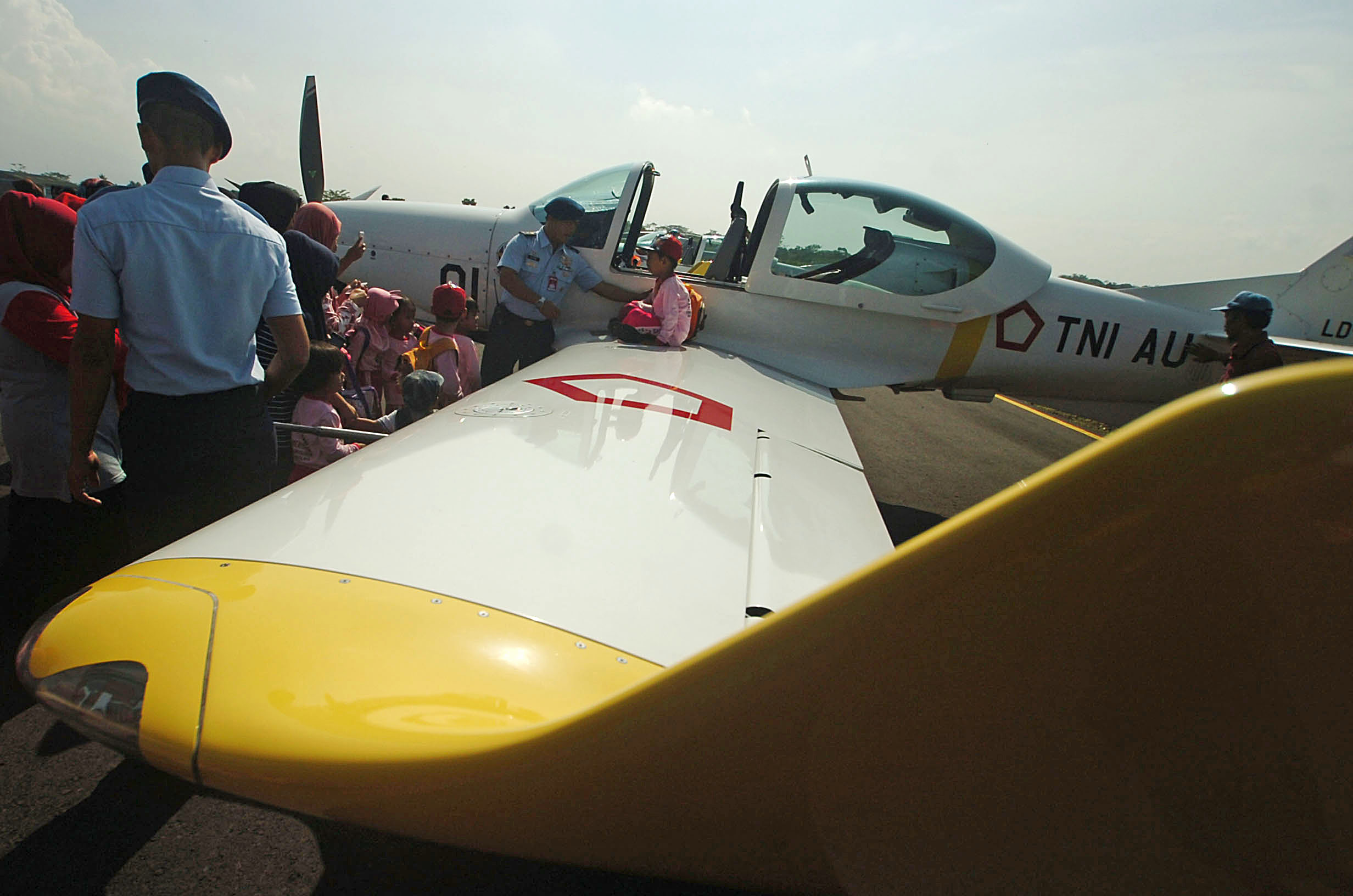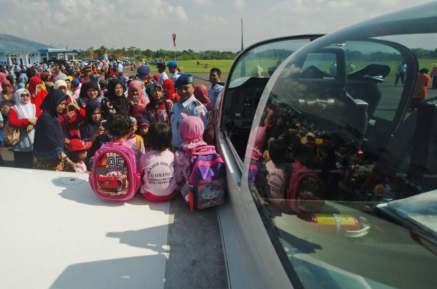 Sejumlah siswa Taman Kanak-anak mengamati pesawat Fix Wing G-120 grob di Lanud Wiriadinata, Tasikmalaya, Jawa Barat, Rabu (20/4). Pameran pesawat ke Dirgantaraan bertujuan untuk mengenalkan secara langsung proses penerbangan pesawat milik TNI-AU kepada pelajar. ANTARA FOTO/Adeng Bustomi/foc/16.