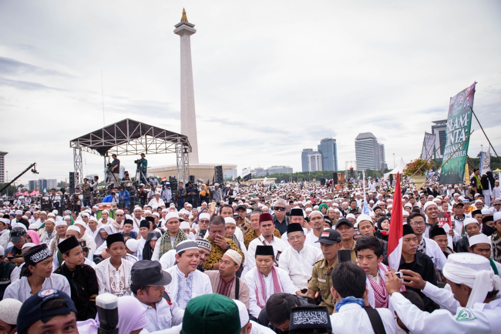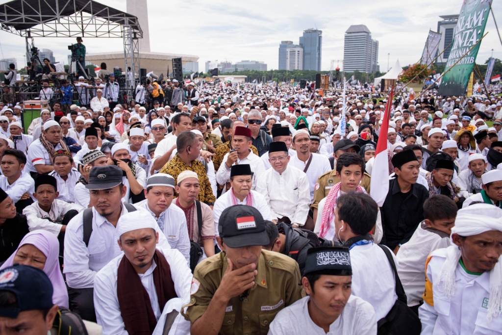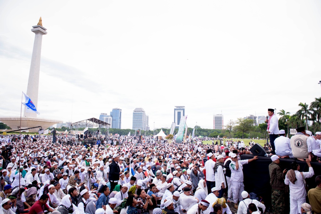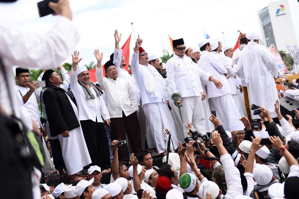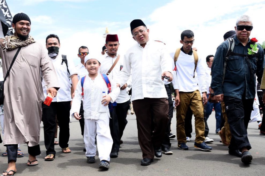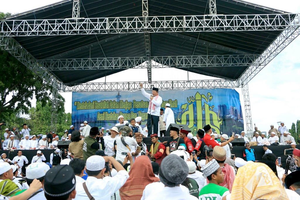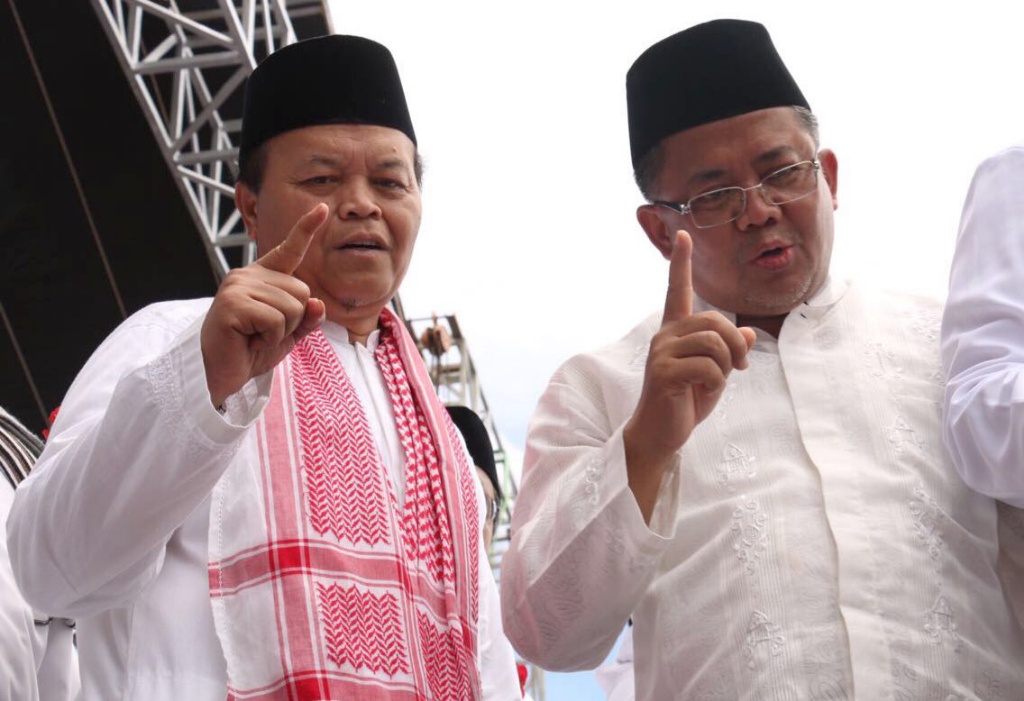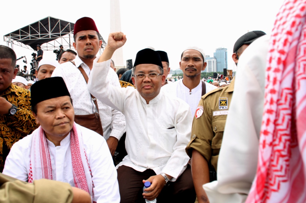 Presiden PKS Mohamad Sohibul Iman dan Wakil Ketua Majelis Syuro PKS Hidayat Nur Wahid menghadiri Maulid Nabi Muhammad SAW dan Reuni 212 di Silang Monas, Jakarta Pusat, Sabtu (2/12/2017). Kedua tokoh partai dakwah tersebut membaur bersama jutaan umat Islam yang sudah memutihkan Silang Monas. AKTUAL/Humas PKS