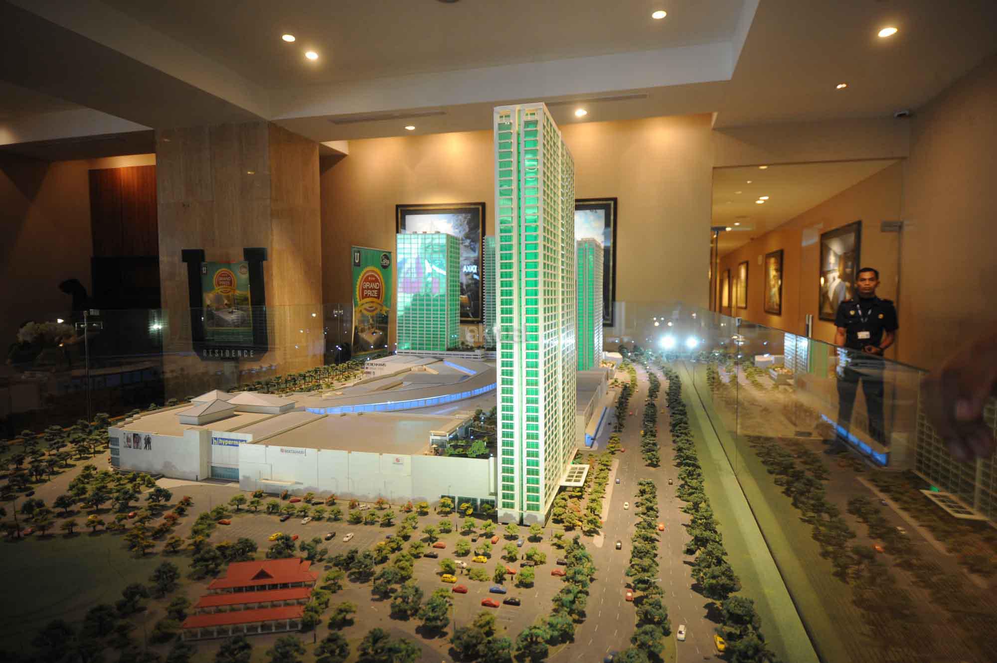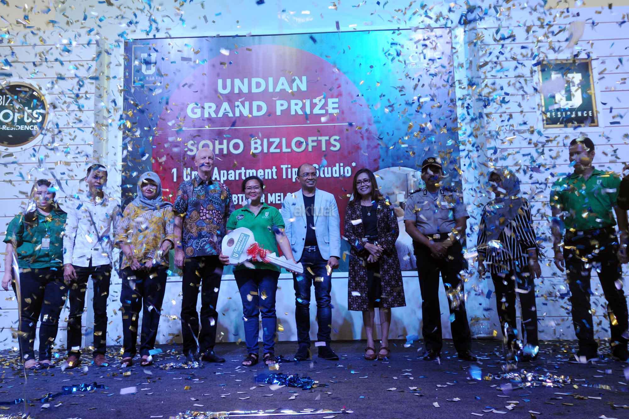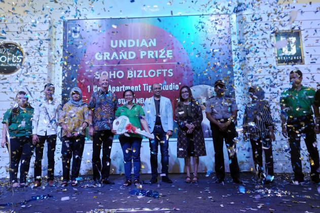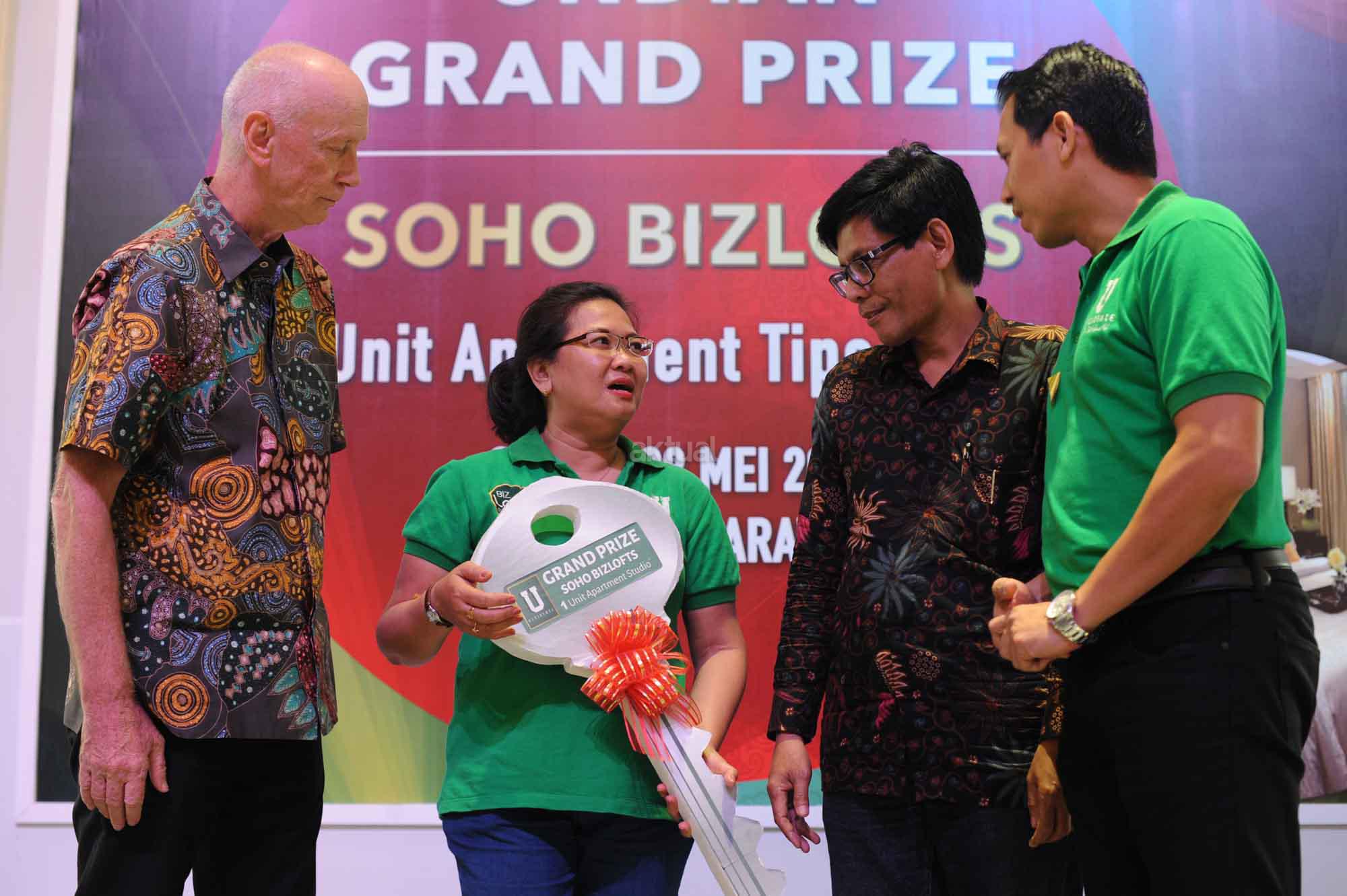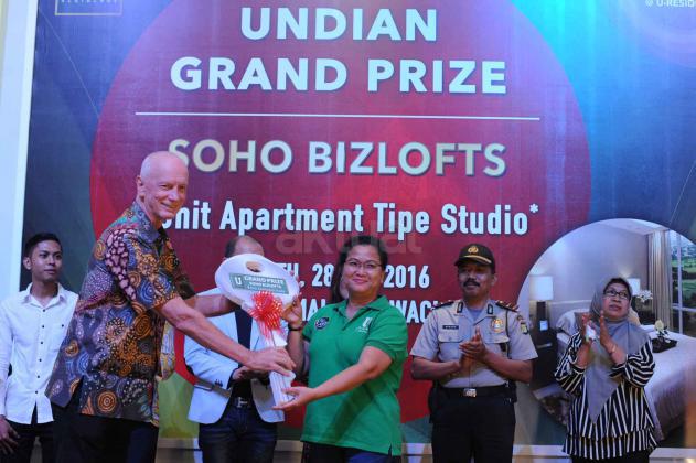 Presiden Direktur PT Supermal Karawaci Joachim Rohn (kiri) bersama General Manager Marketing U Residence, Machjani Safrudin (kanan), Asistant Project Director Djohan Mekuo (kedua kanan) berbincang dengan perwakilan penerima GRAND PRIZE BIZLOFTS U-RESIDENCE, 1 unit Apartemen tipe studio di Grand Atrium Supermal Karawaci, Tangerang, Banten, Sabtu (28/5). SOHO bizlofts@U-Residence di bangun dengan fasilitas seperti hotel dan mal yang saat ini unitnya sudah terjual sekitar 60% dengan harga sekitar Rp 1 miliar per unit. AKTUAL/HO