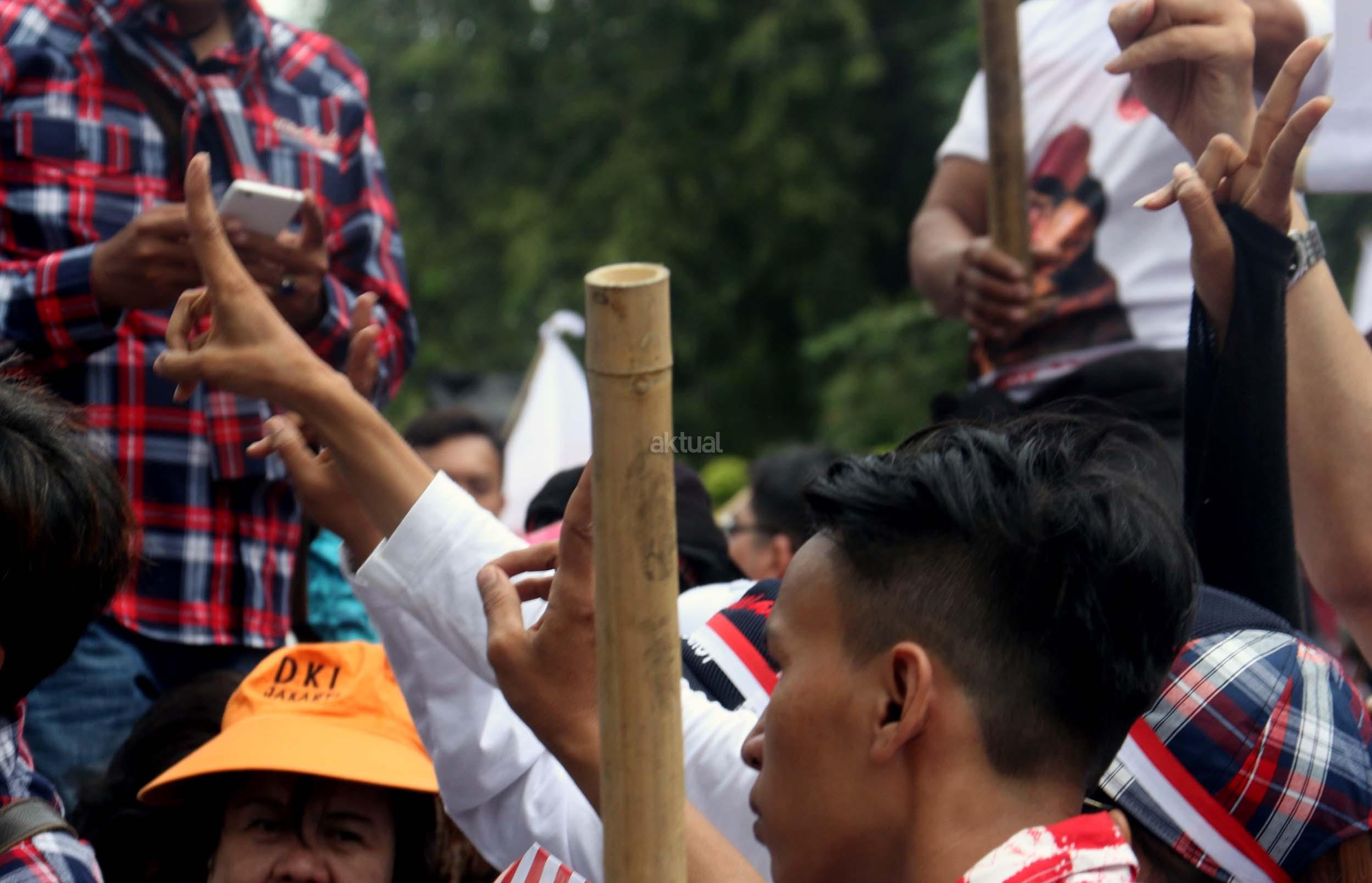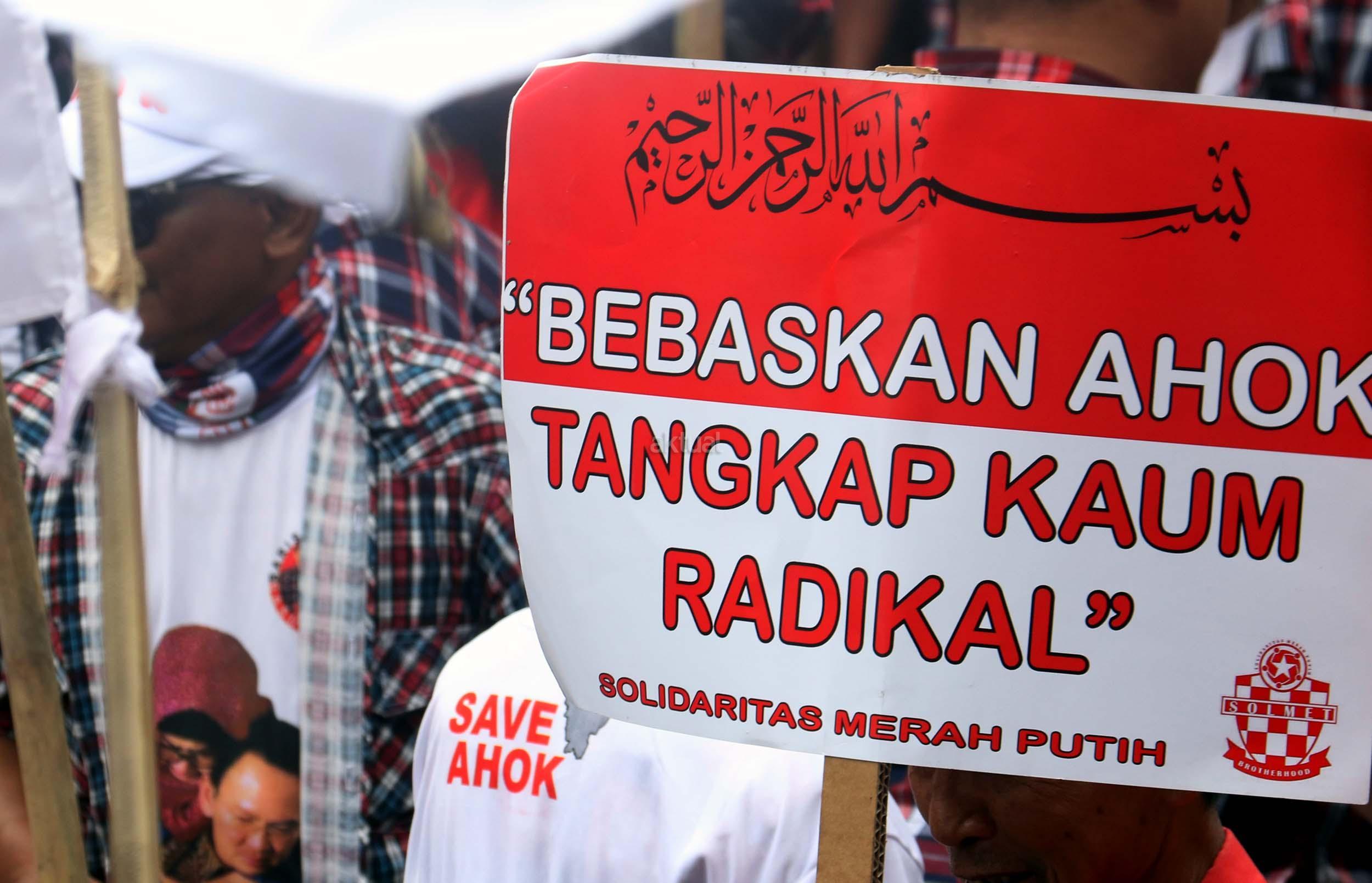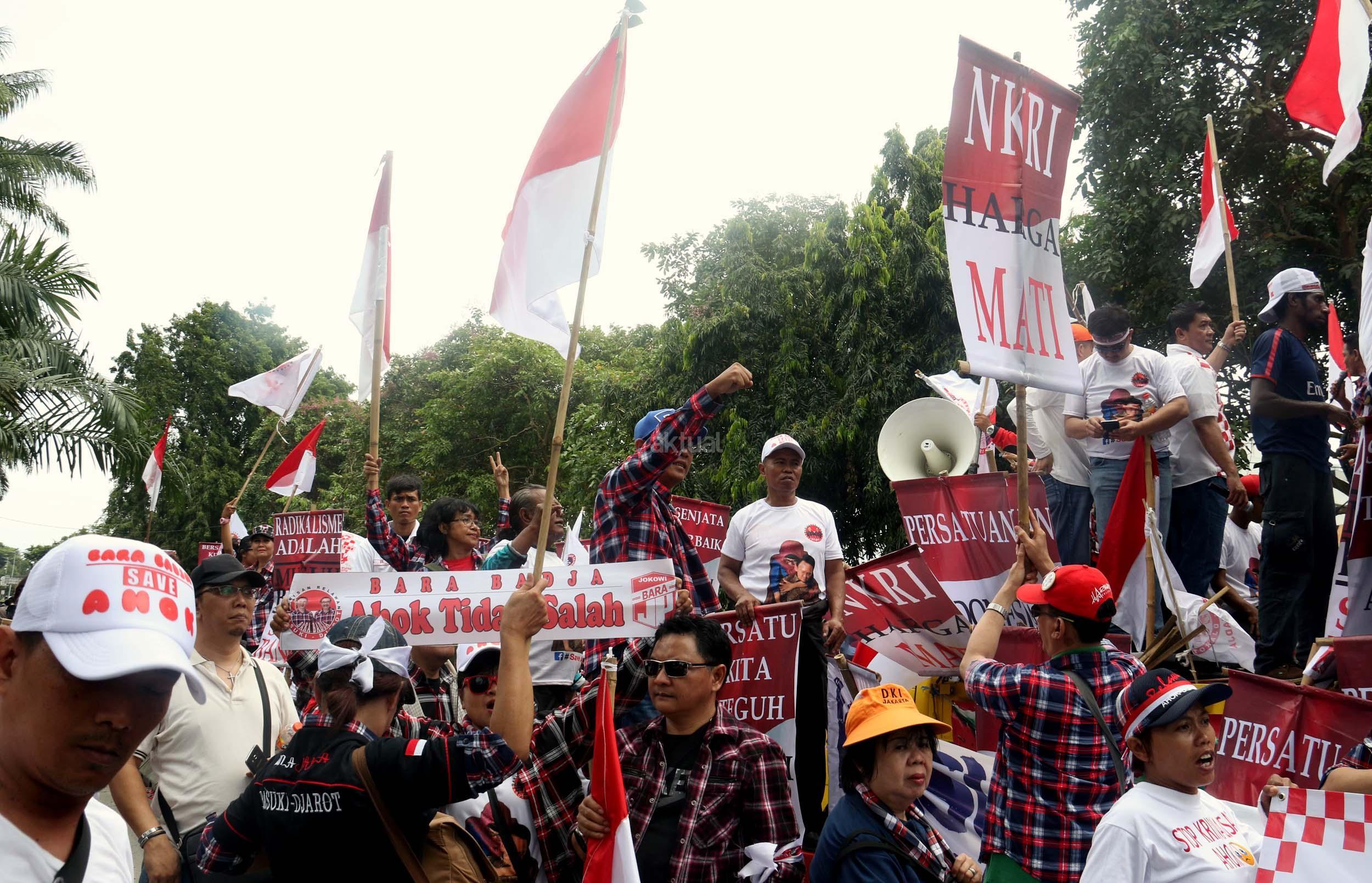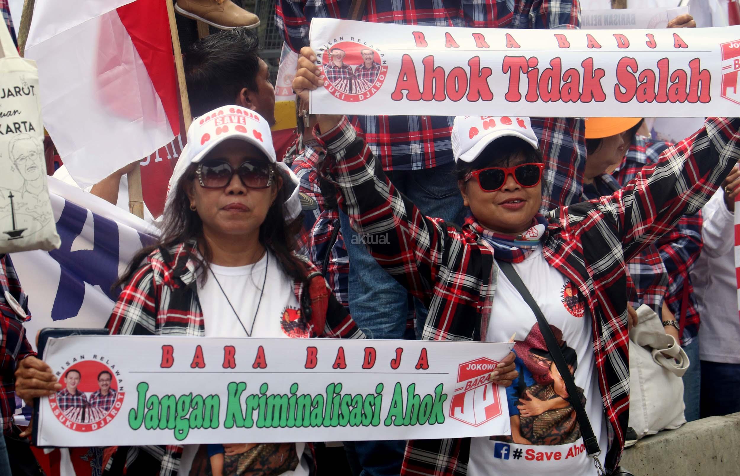 Sejumlah pendukung terdakwa penista Agama Basuki Tjahja Purnama (Ahok) kembali melakukan aksi Bebaskan Ahok di depan Kementerian Pertanian, Jakarta, Selasa (3/1/2017). Sidang lanjutan tersebut beragenda mendengarkan keterangan saksi-saksi. AKTUAL/Munzir