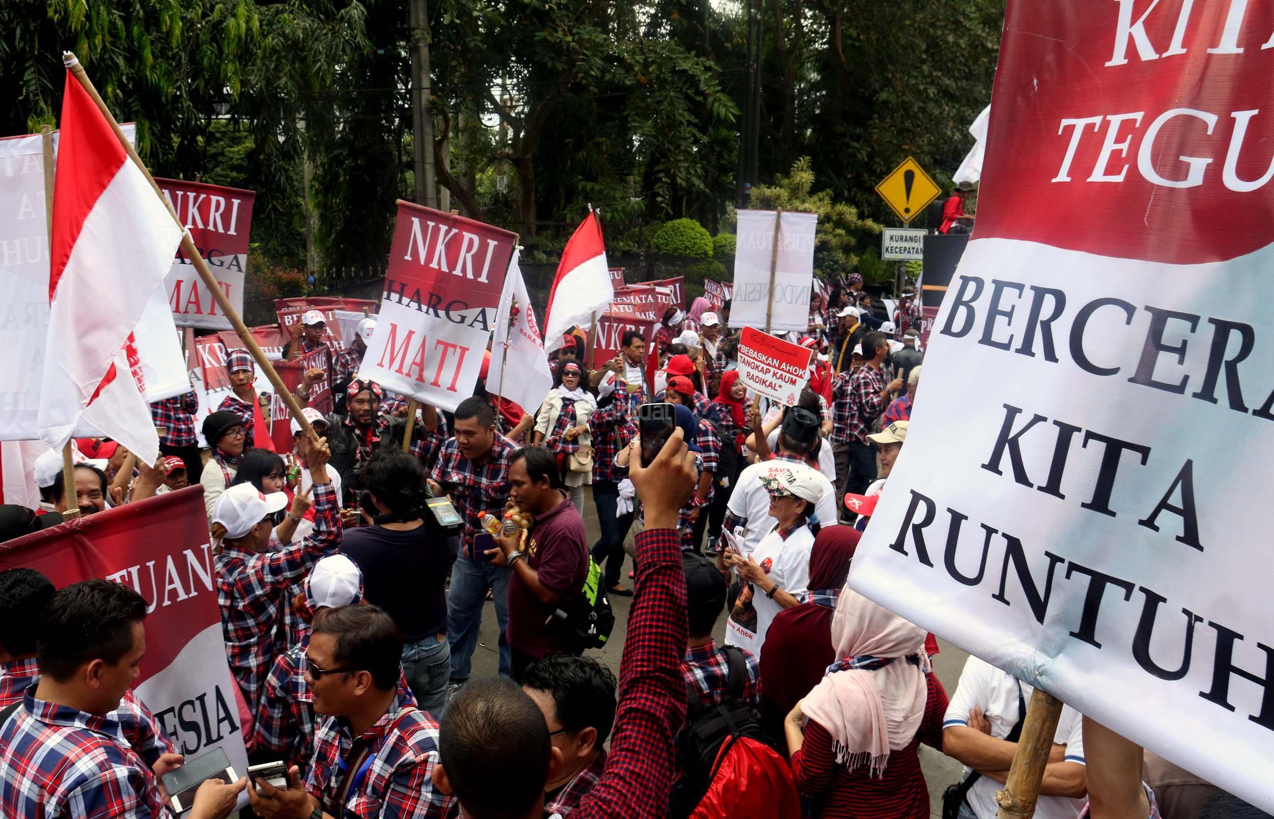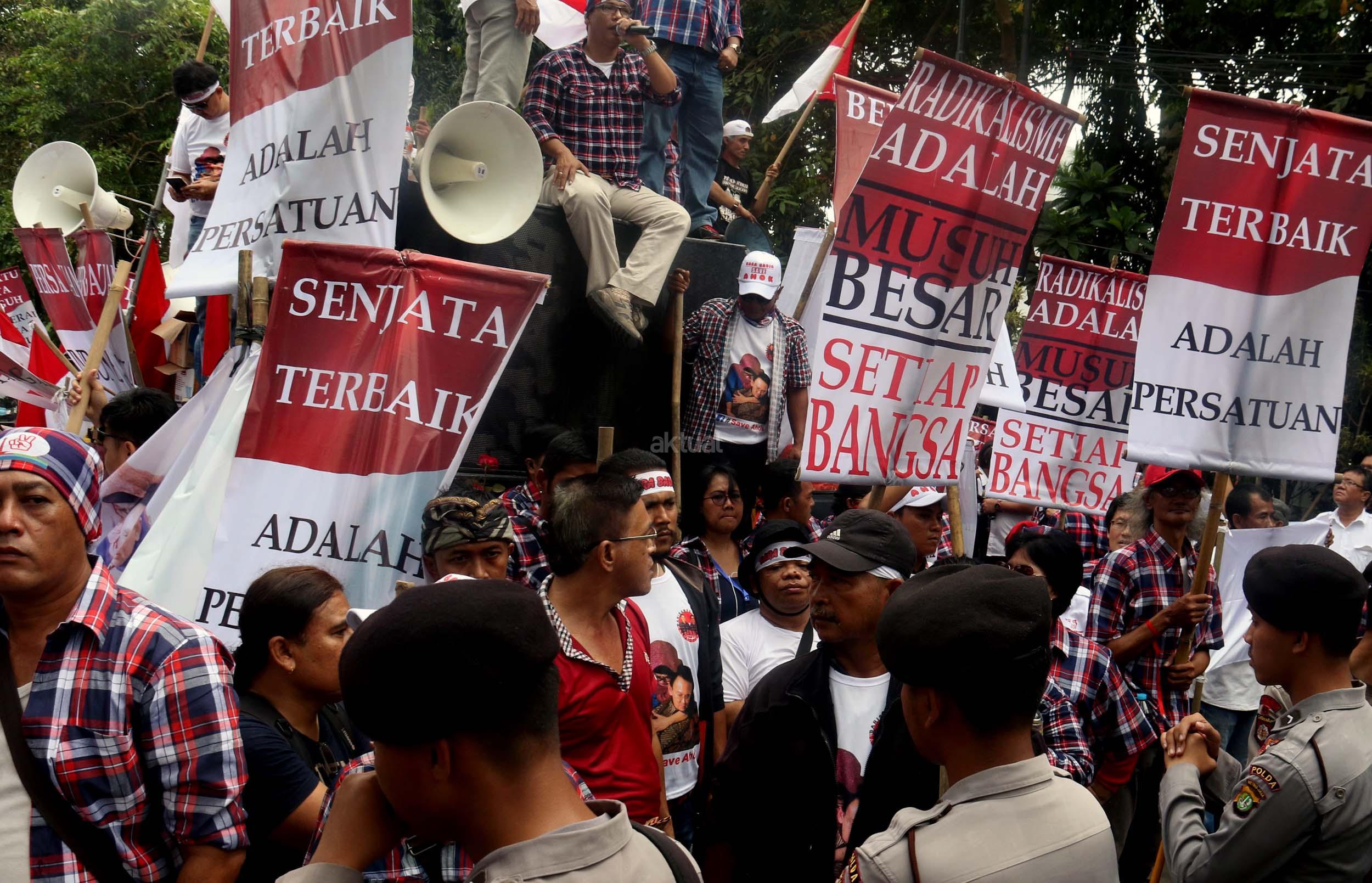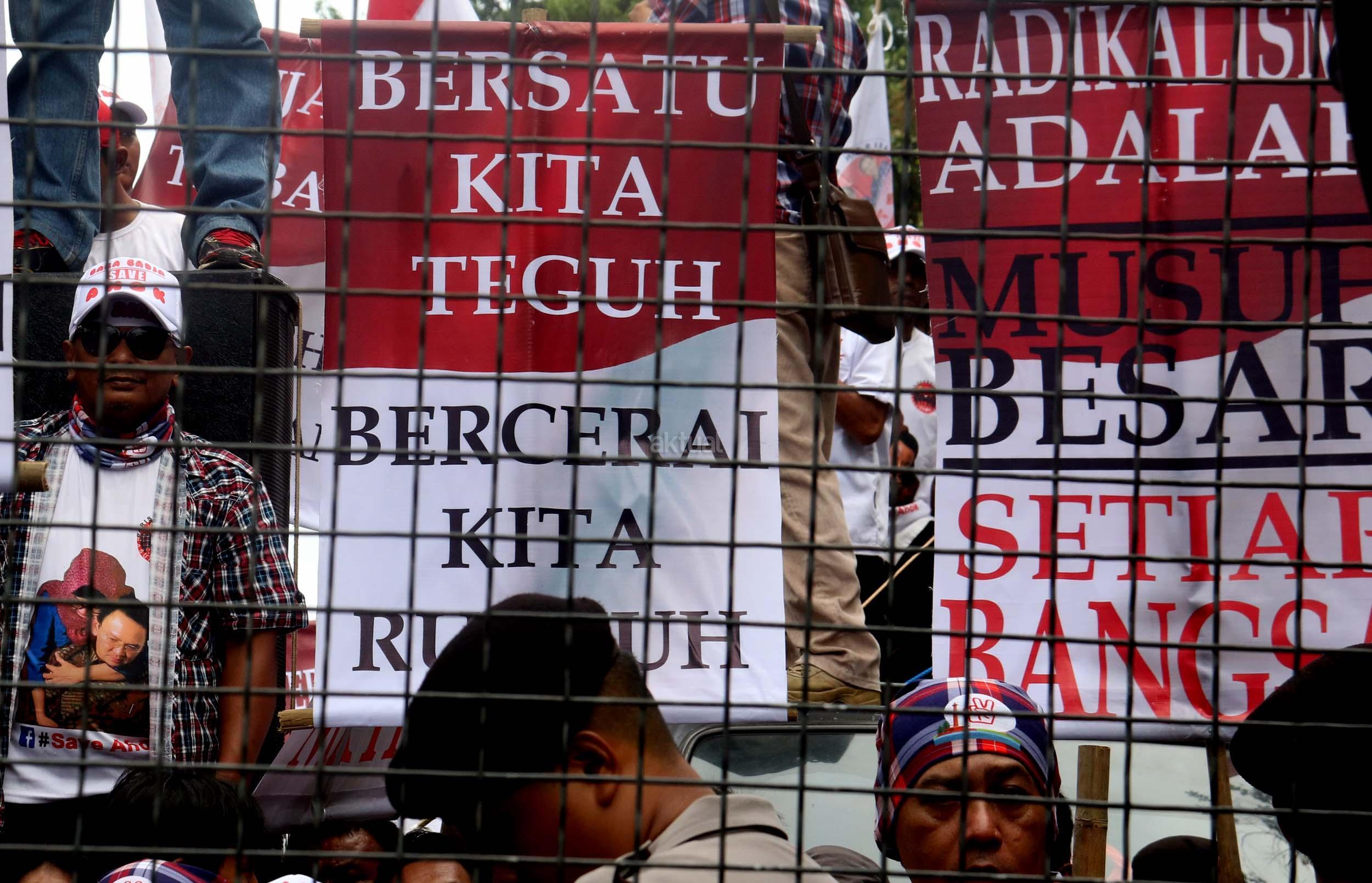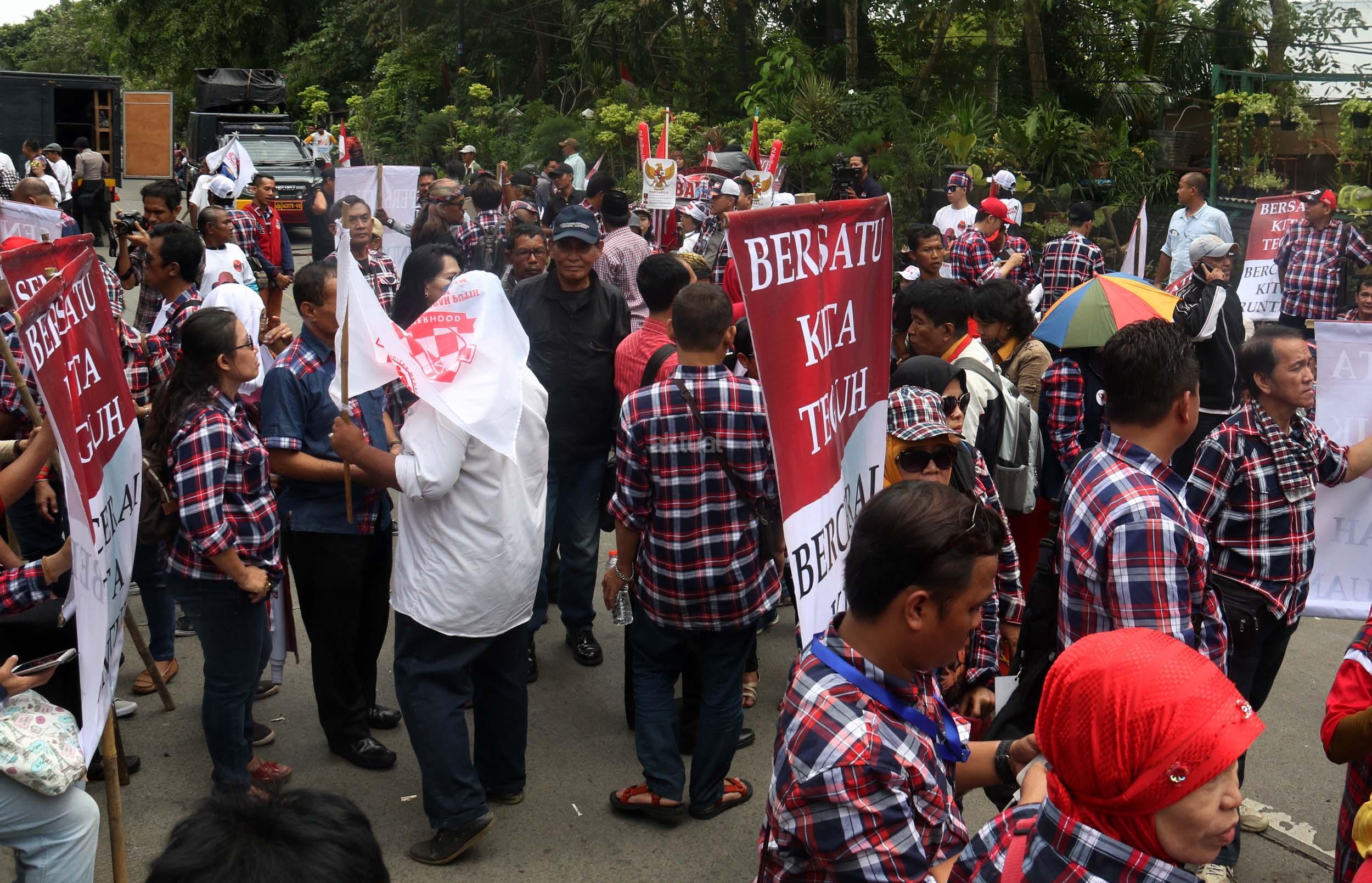 Sejumlah pendukung terdakwa penista Agama Basuki Tjahja Purnama (Ahok) kembali melakukan aksi Bebaskan Ahok di depan Kementerian Pertanian, Jakarta, Selasa (3/1/2017). Sidang lanjutan tersebut beragenda mendengarkan keterangan saksi-saksi. AKTUAL/Munzir
