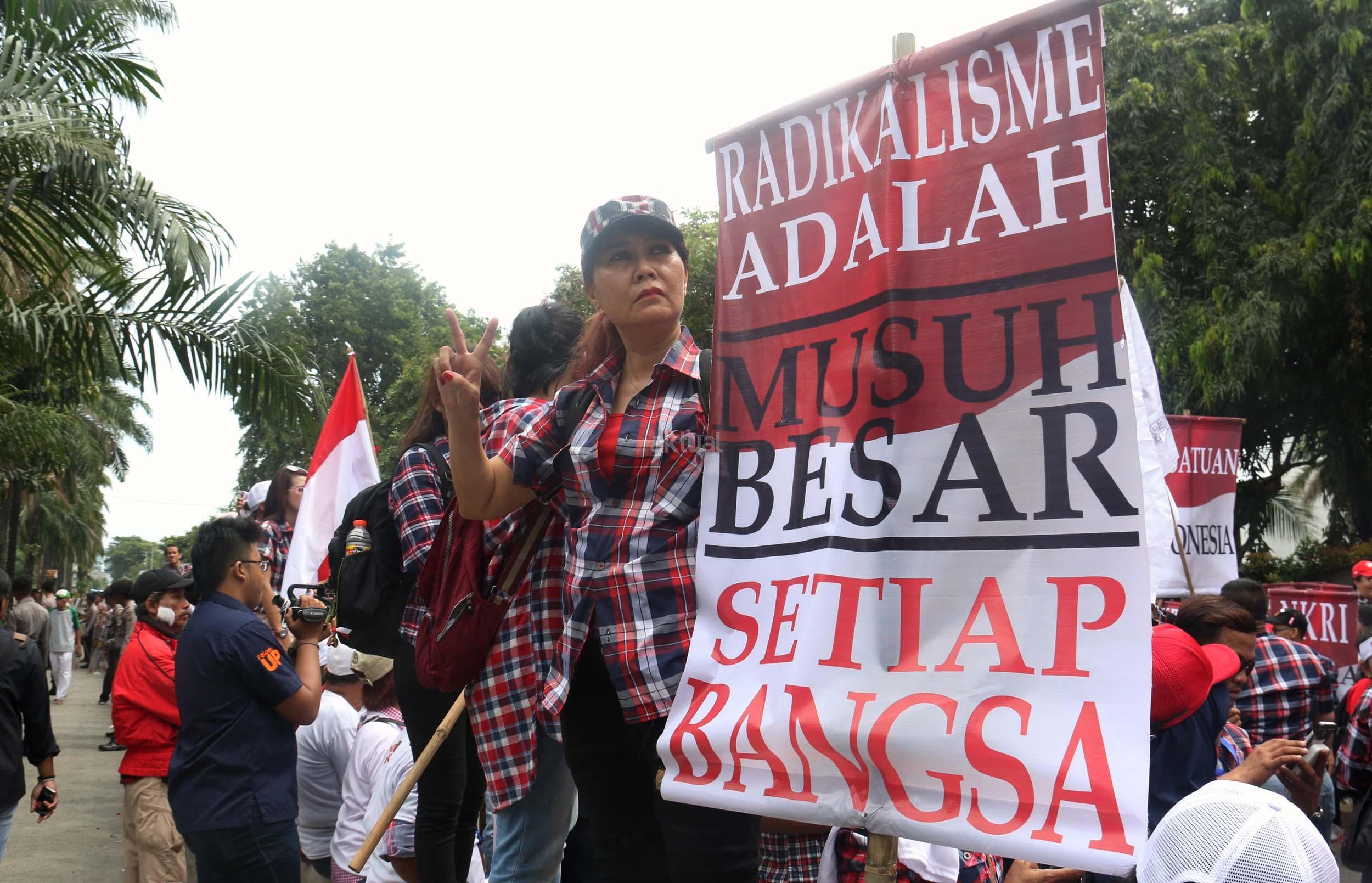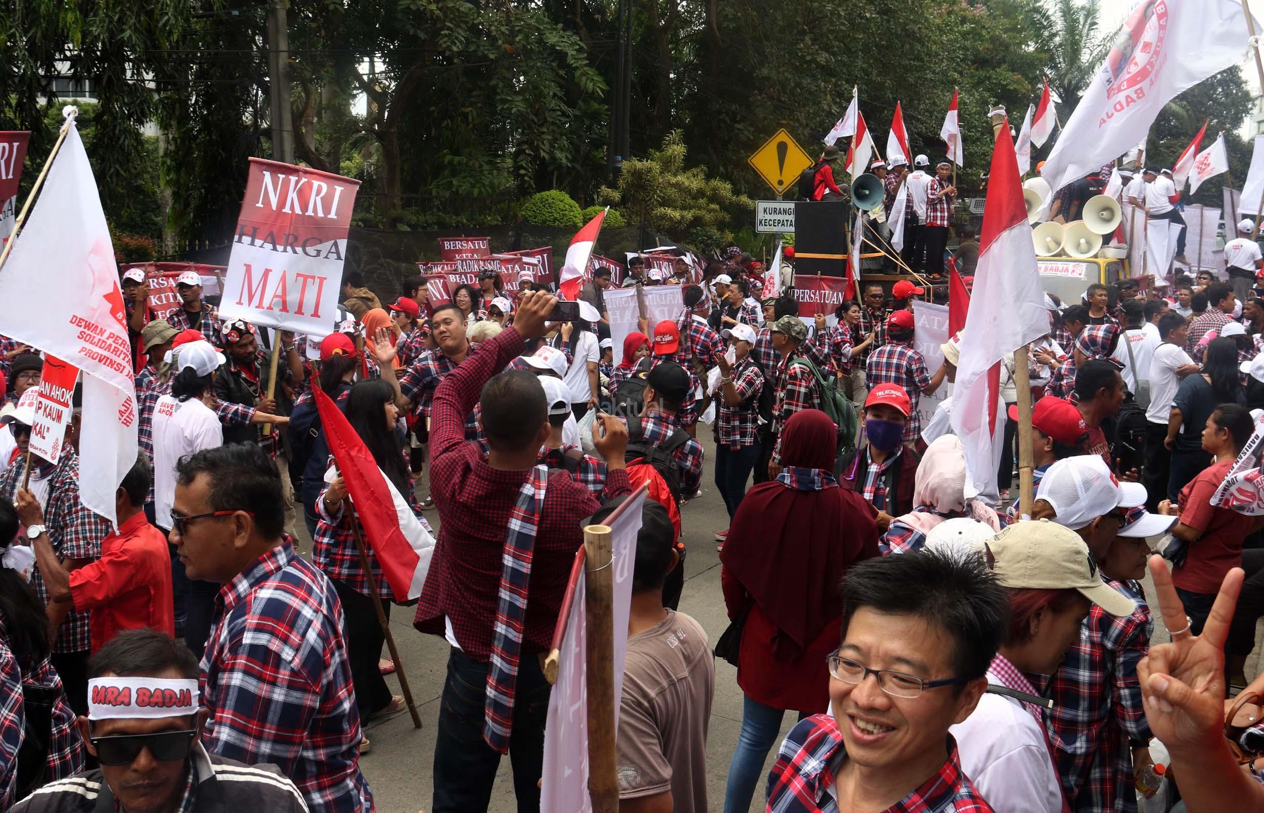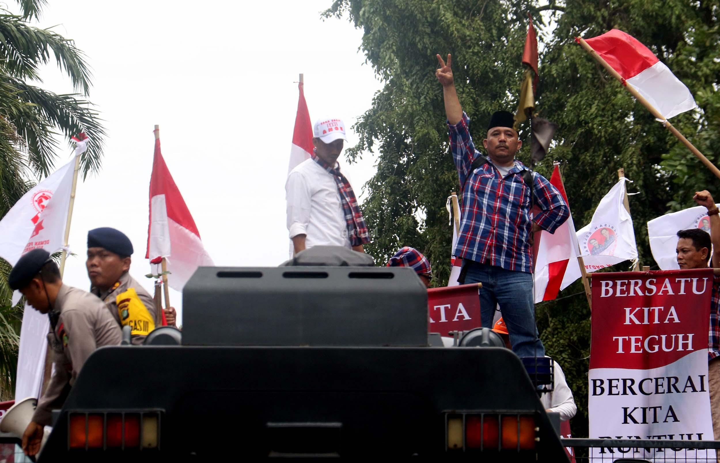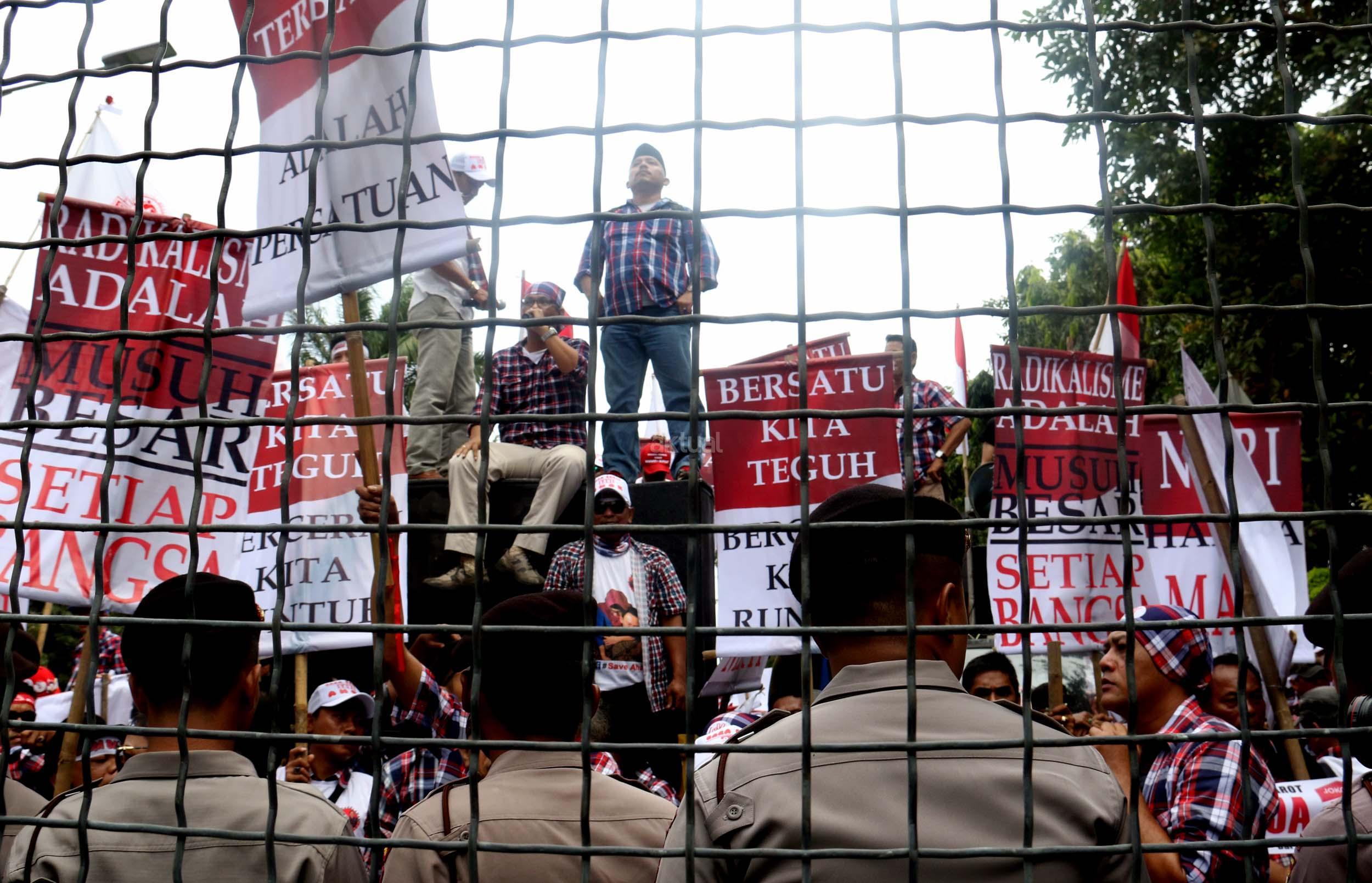 Sejumlah pendukung terdakwa penista Agama Basuki Tjahja Purnama (Ahok) kembali melakukan aksi Bebaskan Ahok di depan Kementerian Pertanian, Jakarta, Selasa (3/1/2017). Sidang lanjutan tersebut beragenda mendengarkan keterangan saksi-saksi. AKTUAL/Munzir