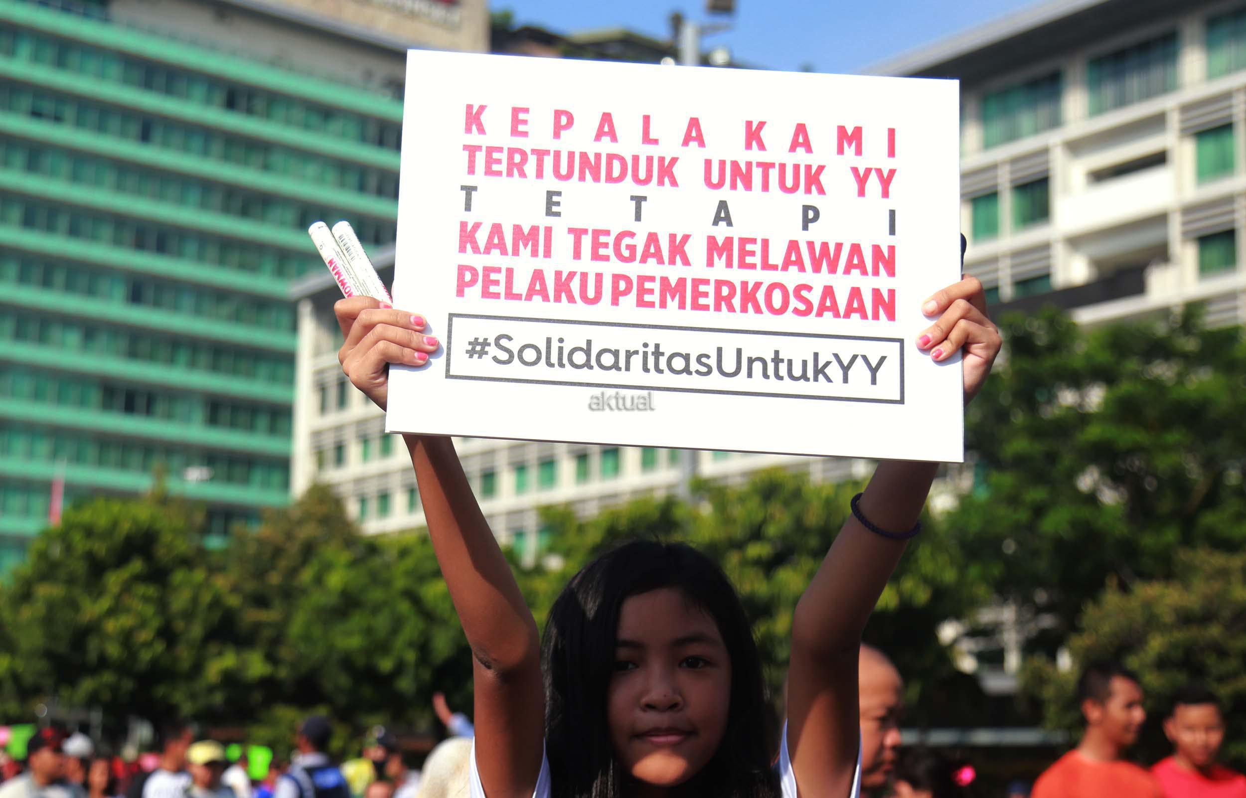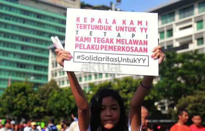 Seorang peserta aksi memegang poster disela kegiatan car free day di Bundaran HI, Jakarta, Minggu (8/5/2016). Aksi itu merupakan solidaritas serta bentuk kecaman terhadap kekerasan seksual yang menimpa pelajar Bengkulu, Yuyun (14).