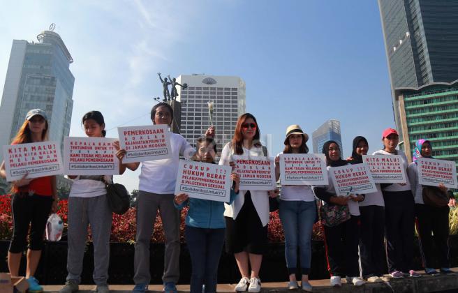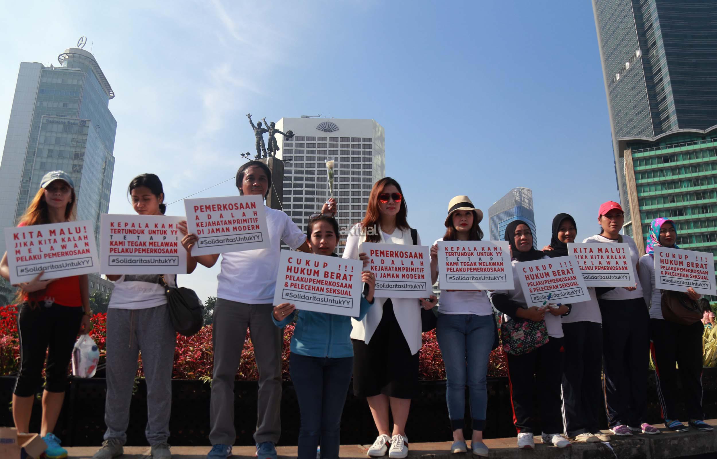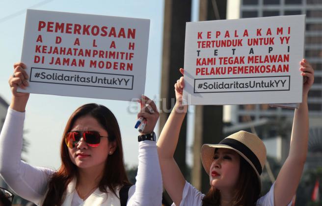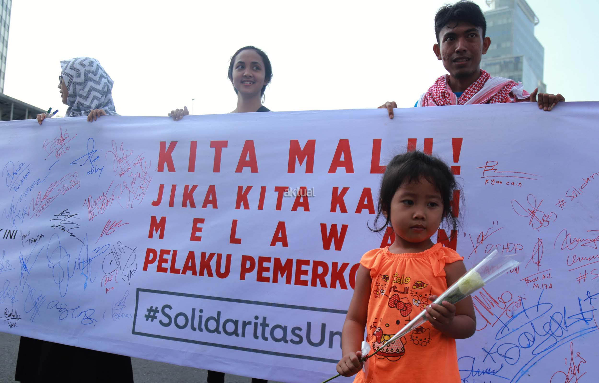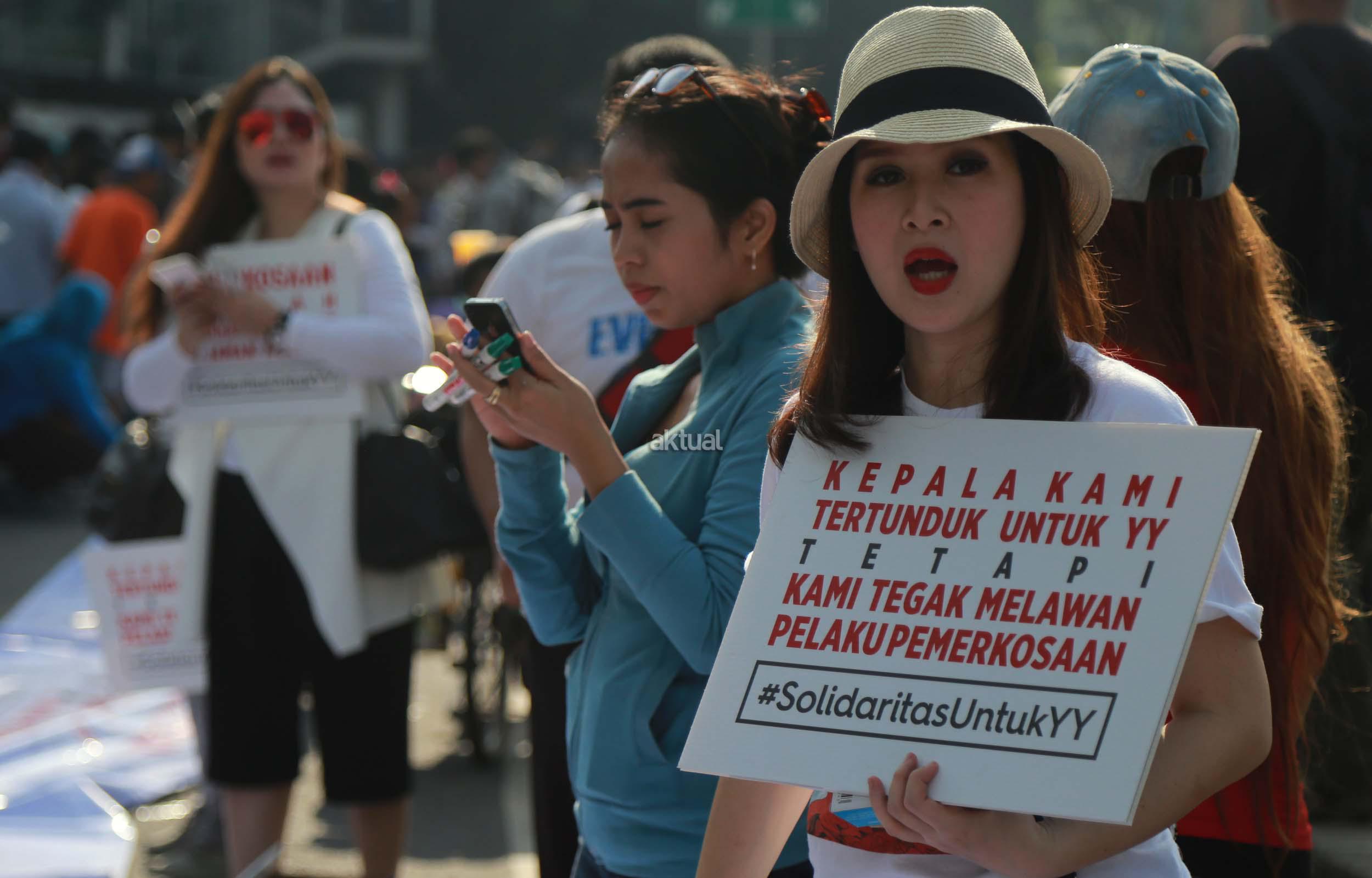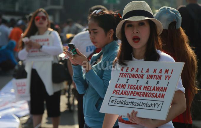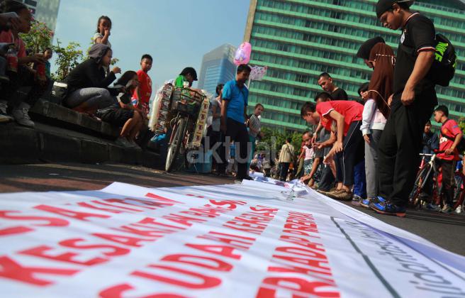 Aktivis menggelar aksi solidaritas untuk Yuyun disela car free day di Bundaran HI Jakarta, Minggu (8/5/2016). Pada kegiatan itu, pengunjung menandatangani spanduk sebagai bentuk kekecewaan atas kekerasan seksual yang menimpa Yuyun.