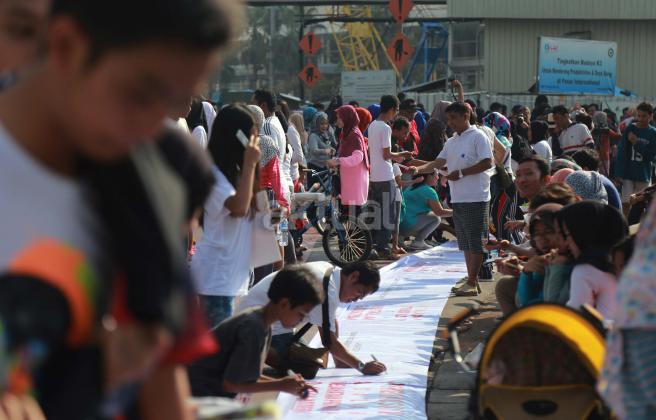 Seorang warga menandatangi spanduk aksi solidaritas untuk Yuyun disela kegiatan car free day di Bundaran HI, Jakarta, Minggu (8/5/2016). Aksi solidaritas tersebut pun berlangsung serentak di 13 kota lainnya.