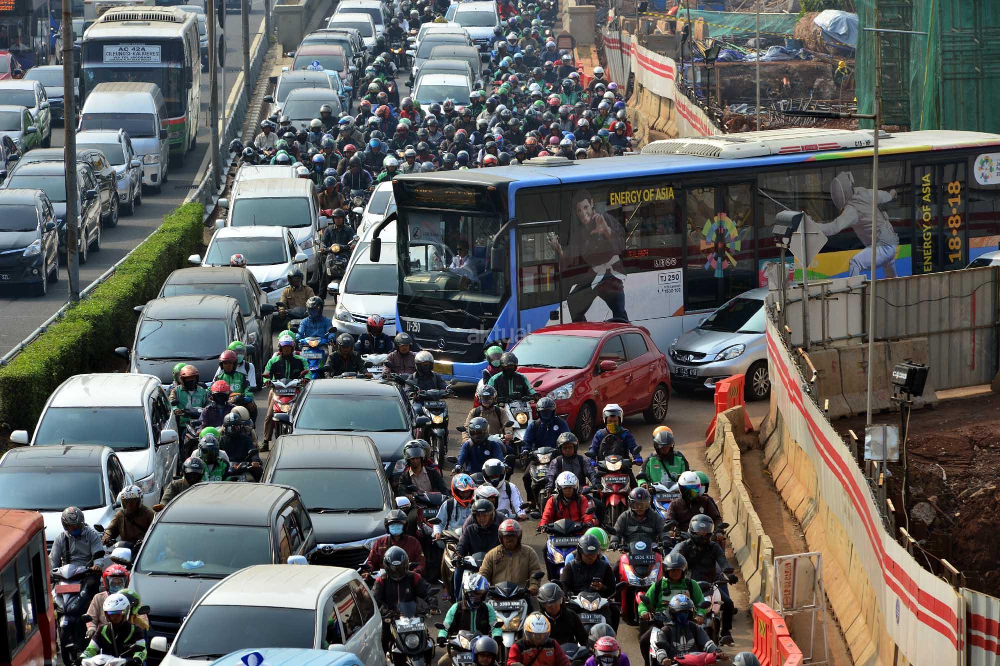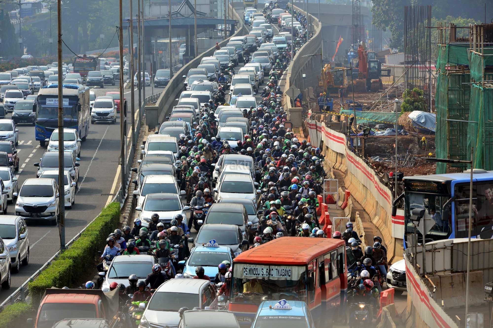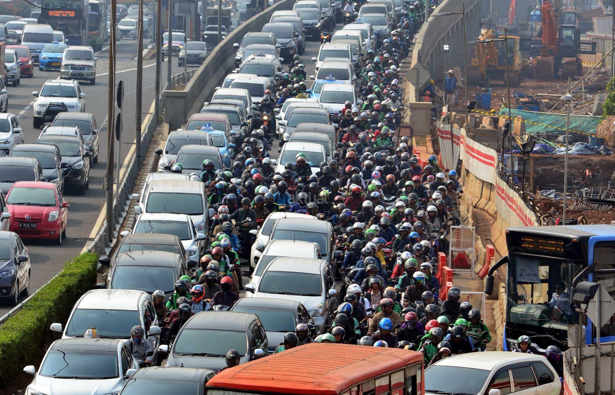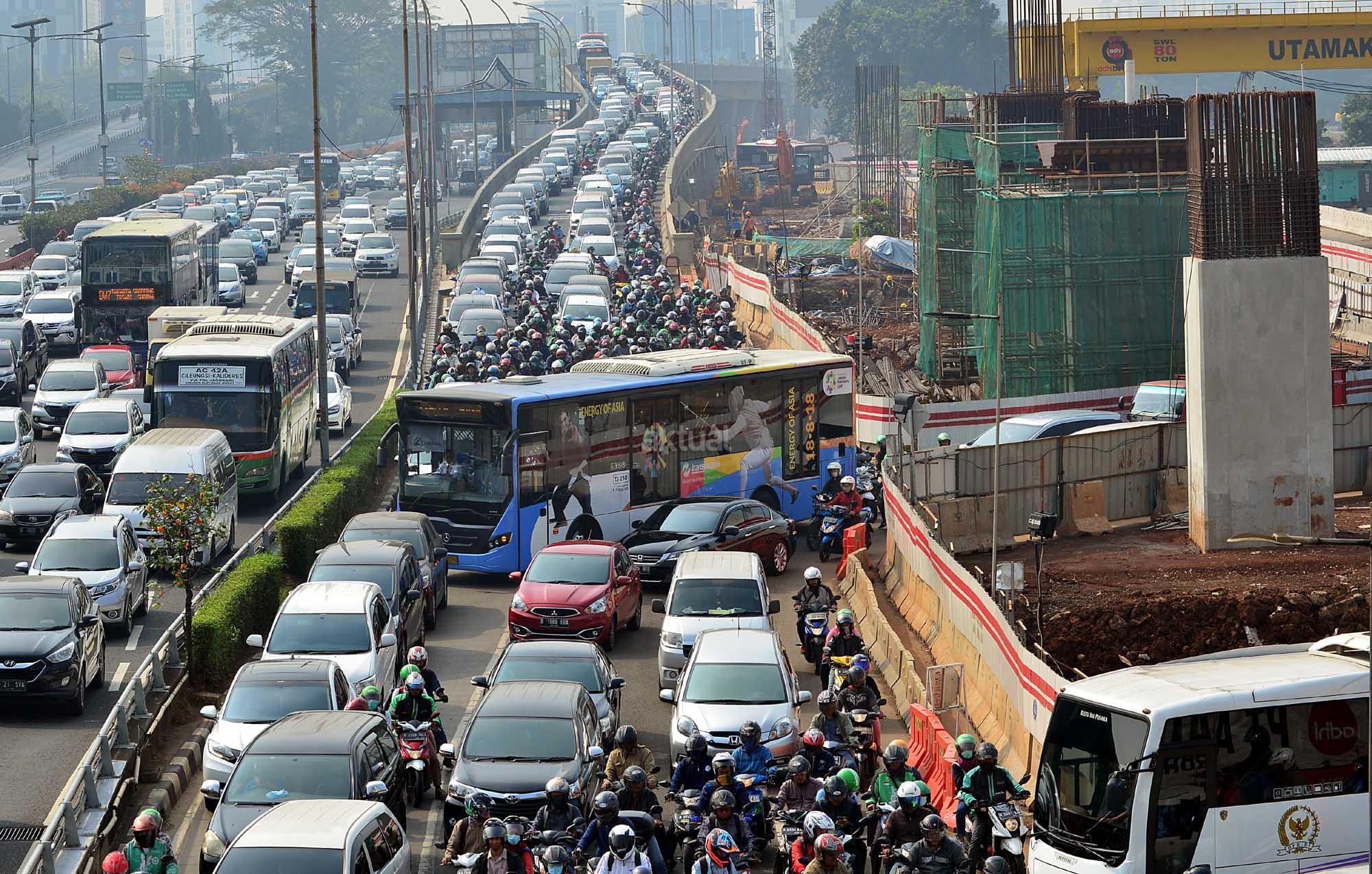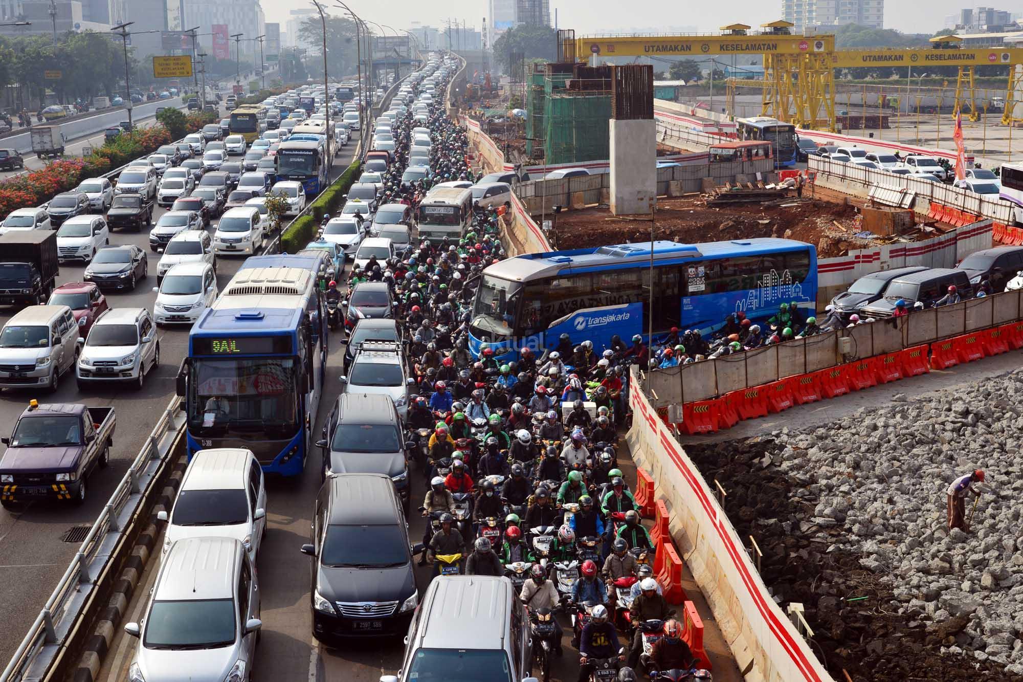 Sejumlah kendaraan terjebak macet di samping proyek LRT di kawasan Pancoran, Jakarta, Rabu (25/7). Pemerintah terus memperbaiki sistem transportasi dengan mengandalkan strategi “push dan pull” yakni dengan mendorong masyarakat meninggalkan kendaraan pribadi dan menarik masyarakat menggunakan angkutan umum yang murah dan nyaman seperti tranportasi multi moda yang sedang dibangun. AKTUAL/Tino Oktaviano