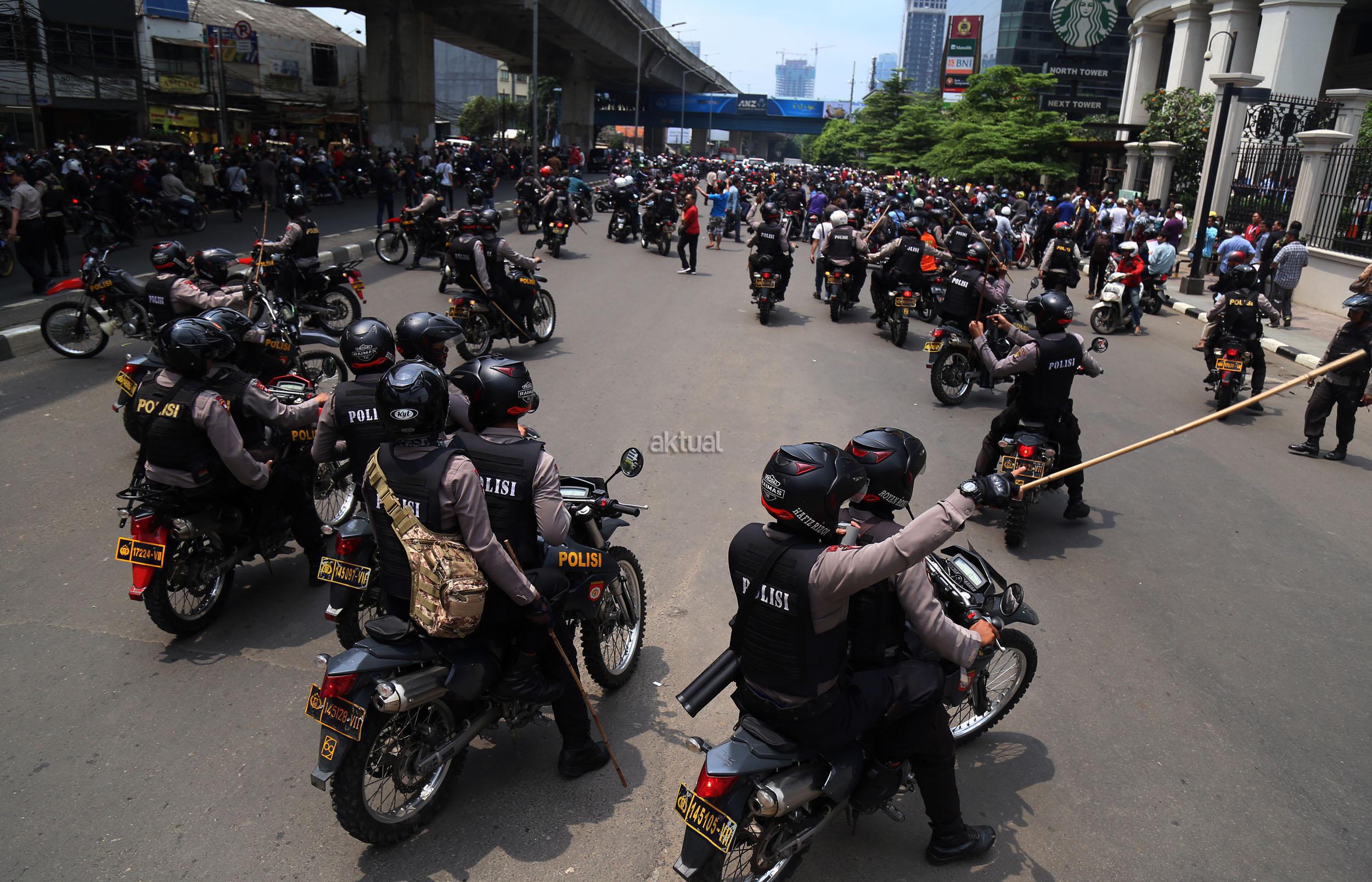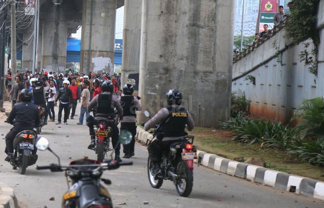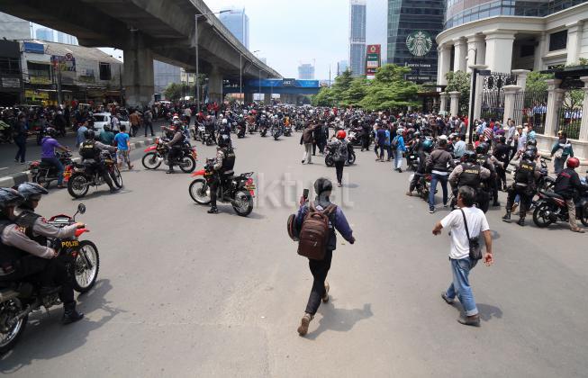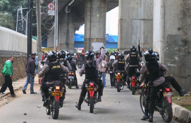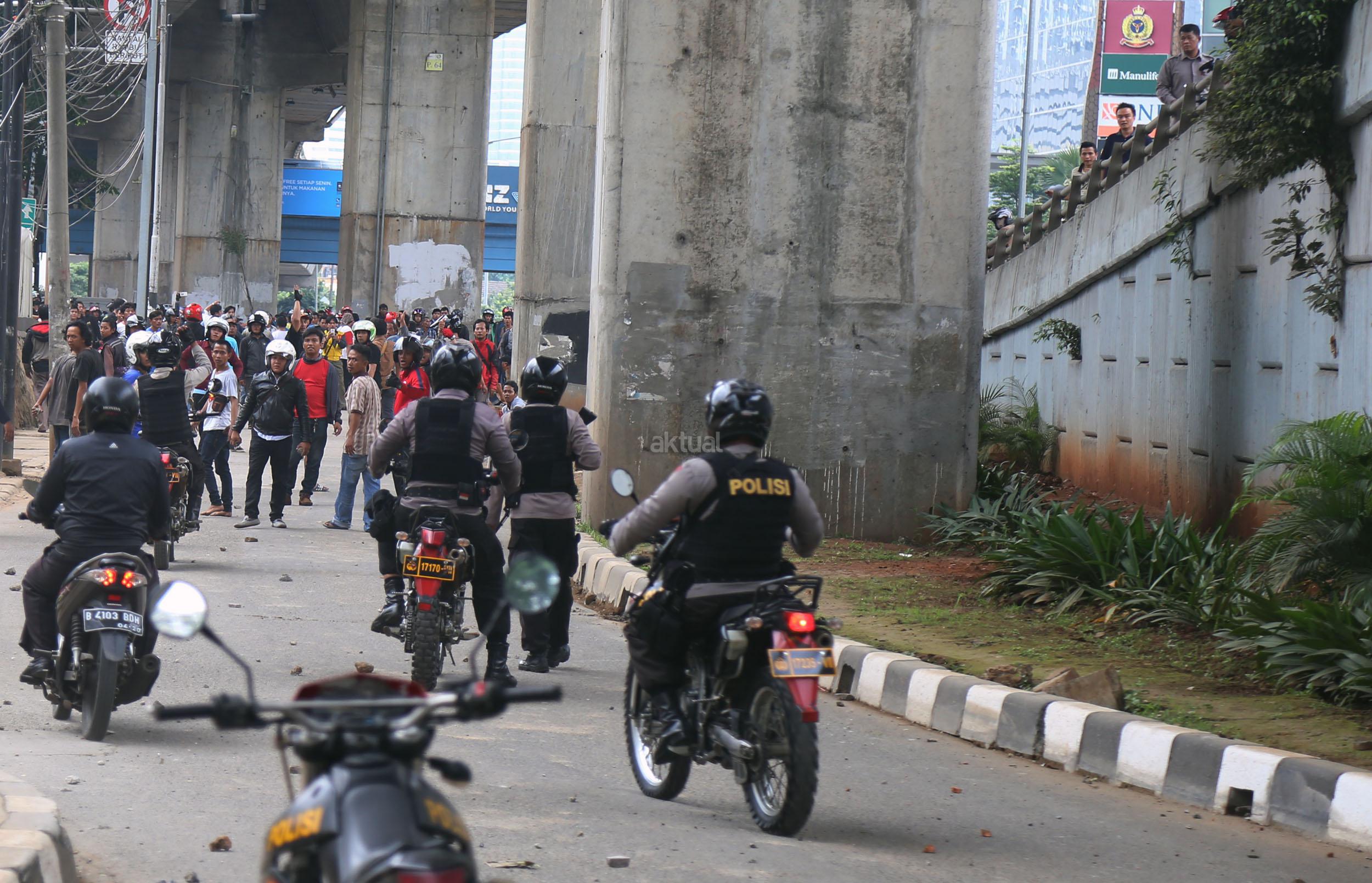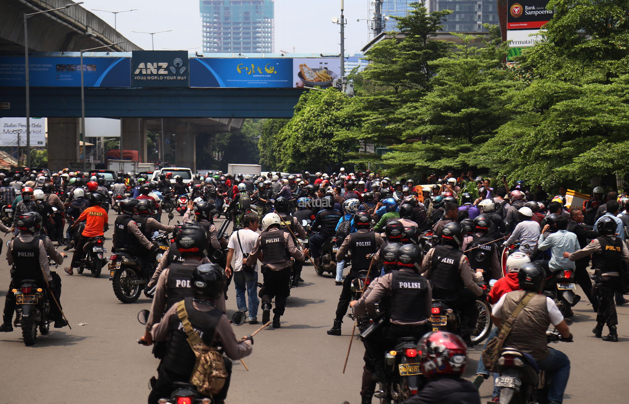 Para petugas Kepolisian melerai tawuran supir taksi dan warga di sekitar Karet Setiabudi, Jakarta, Selasa (22/3/2016). Ribuan sopir taksi, bajaj dan sejumlah angkutan umum lainnya melakukan mogok massal untuk menolak keberadaan transportasi umum berbasis aplikasi.